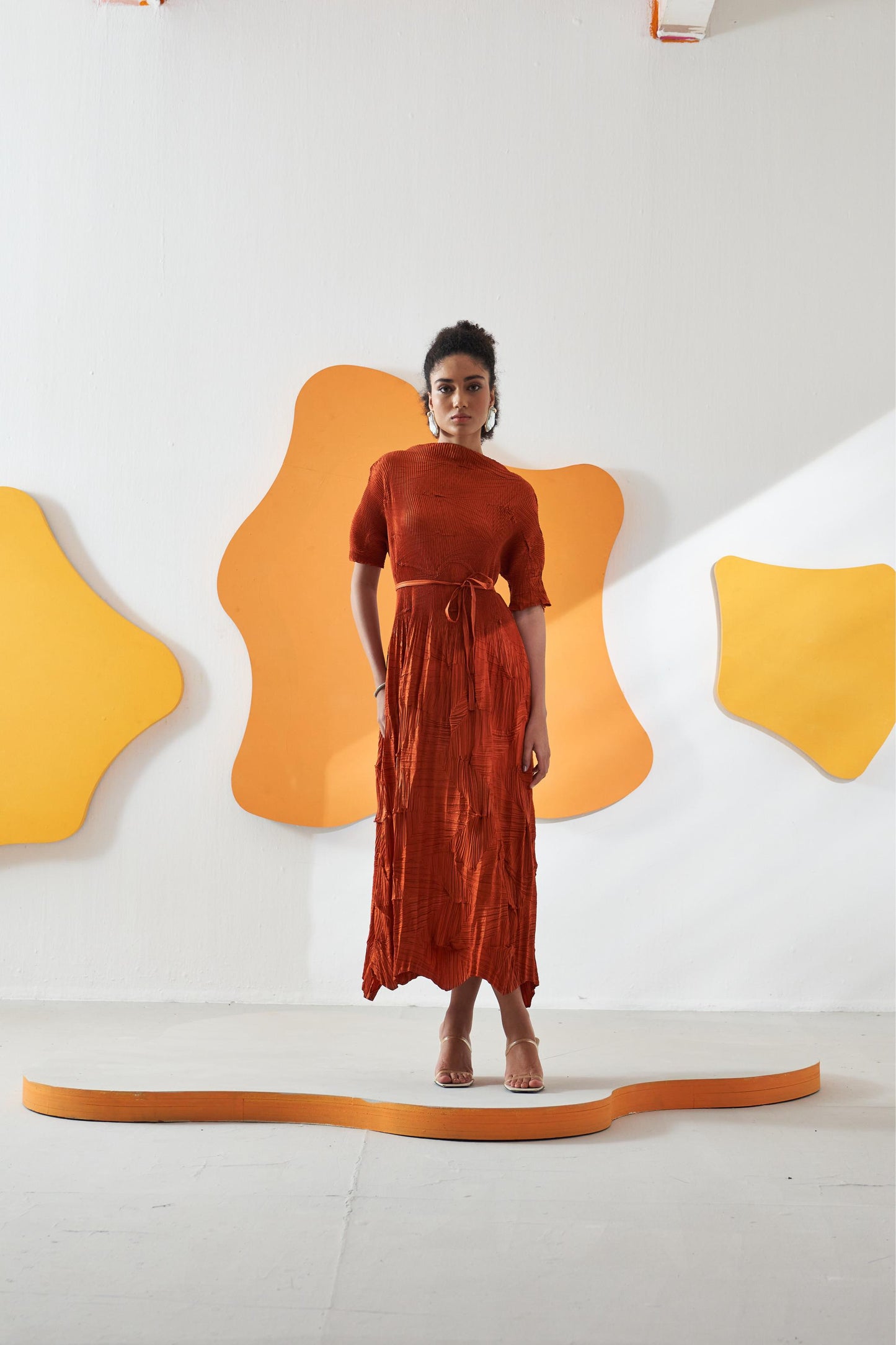 Featuring A High Neck Dress With Leaf Textured Details In Pleated Polyester Base. It Is Paired With A Belt.