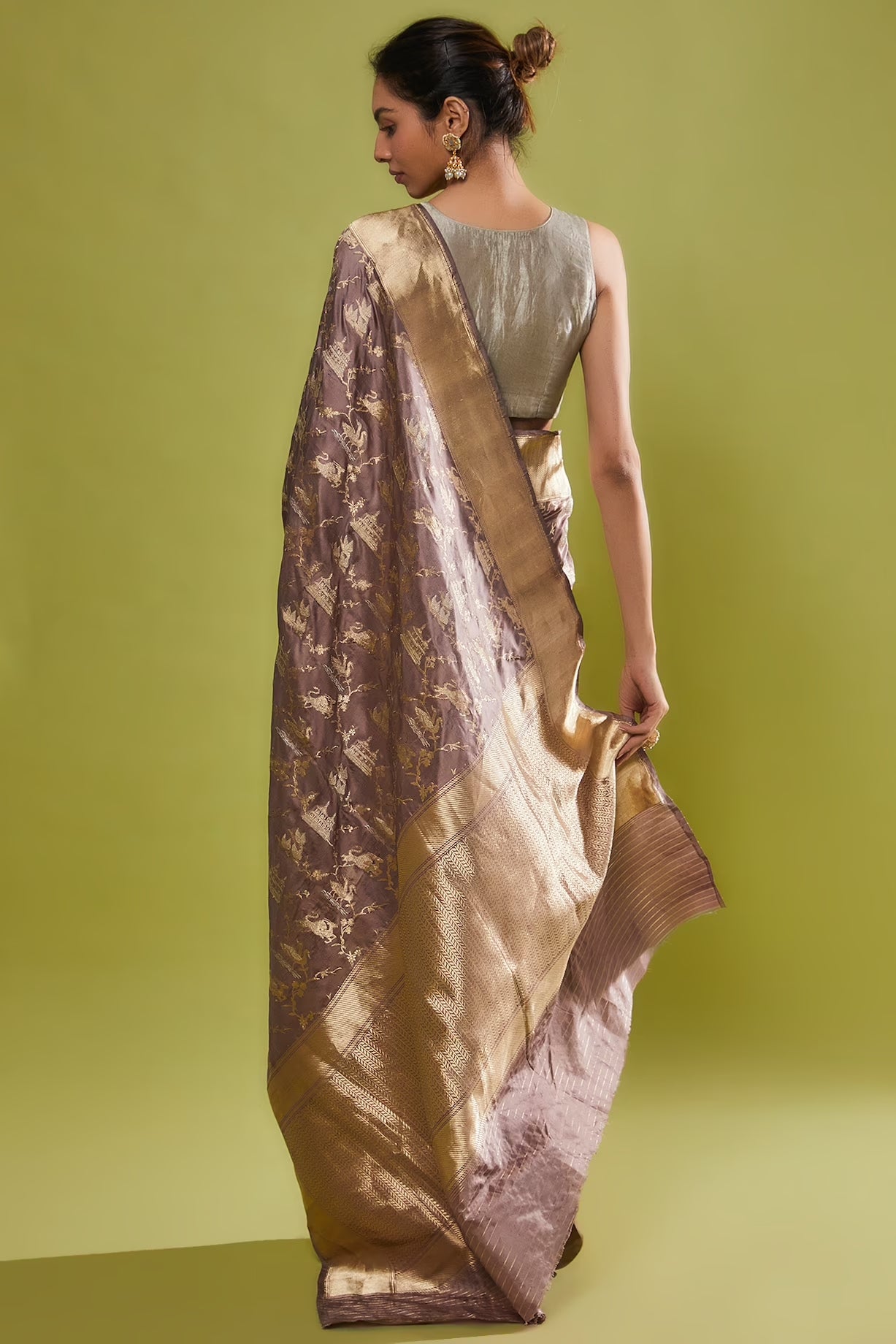Handwoven Lilac Katan Silk Temple And Birds Motifs Jaal Saree Crafted Over Kadhwa Technique. It Is Paired With An Unstitched Blouse.