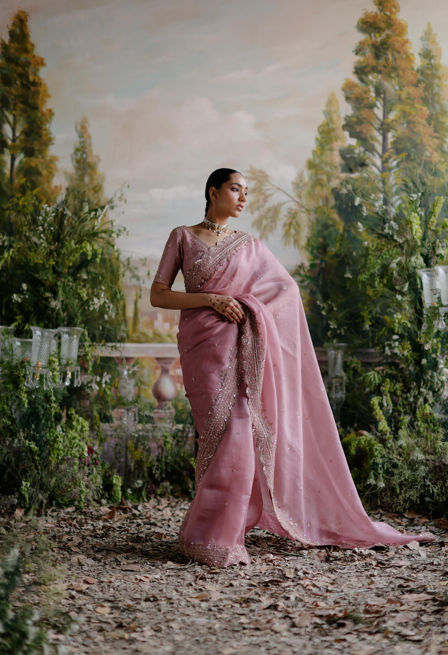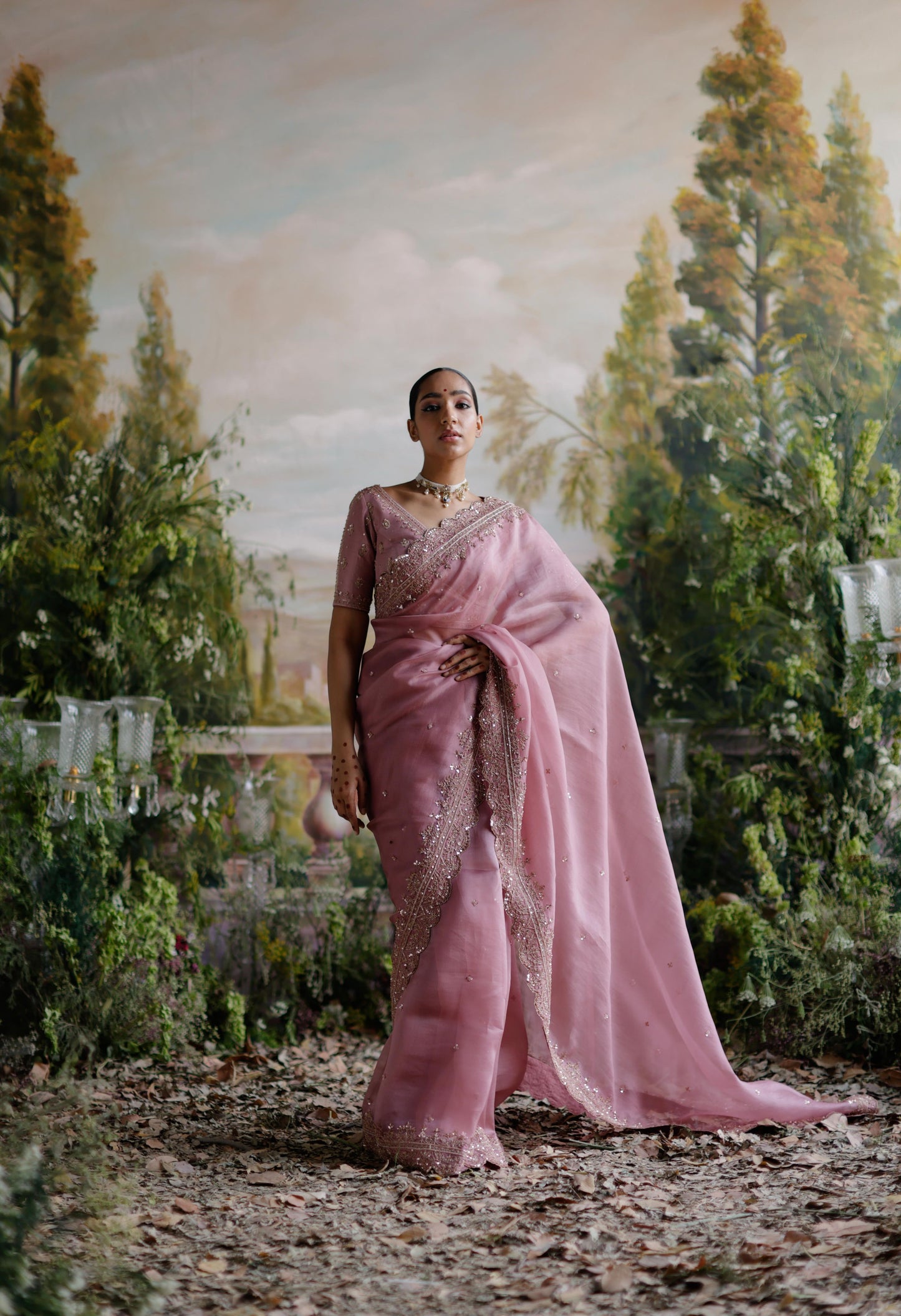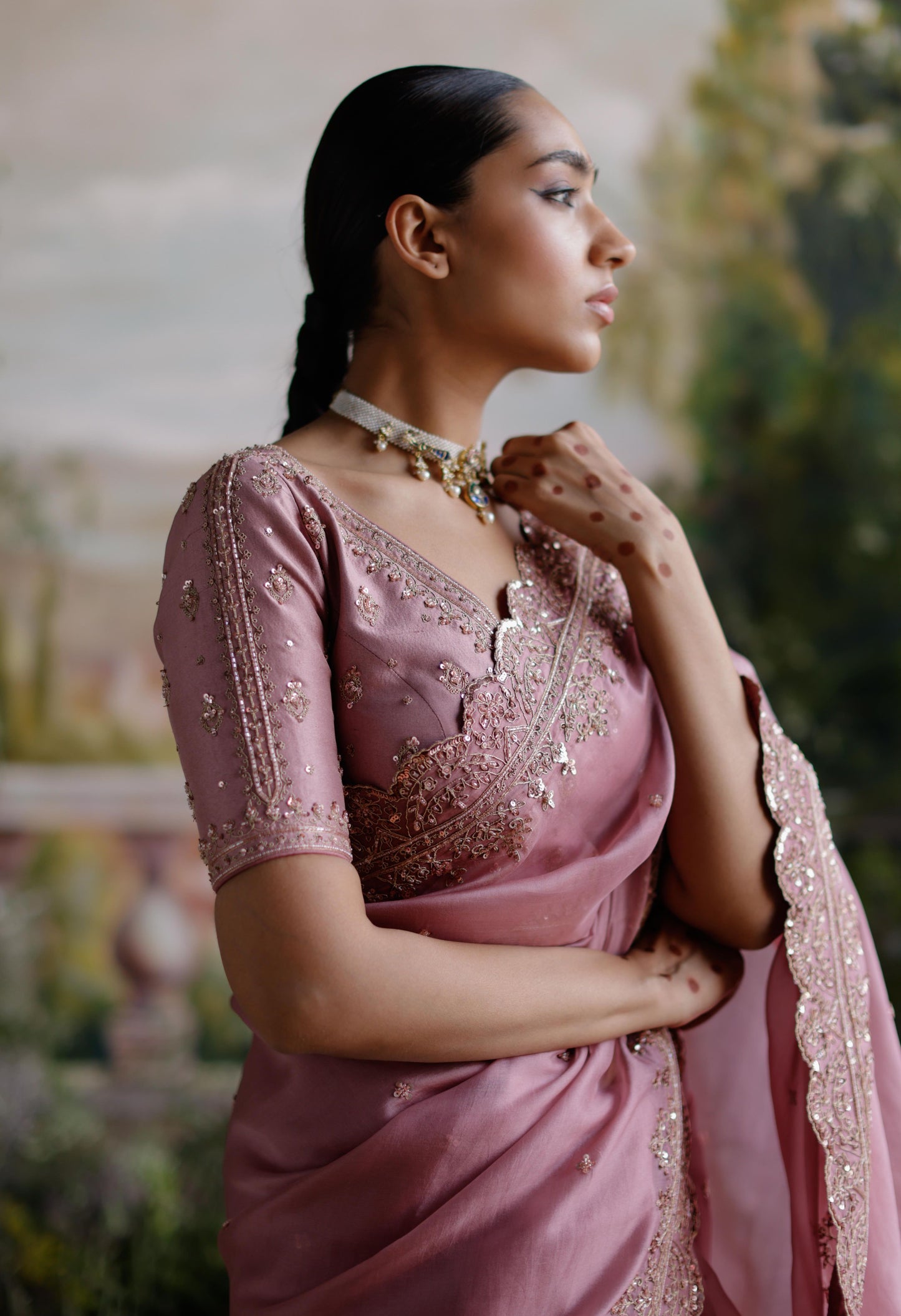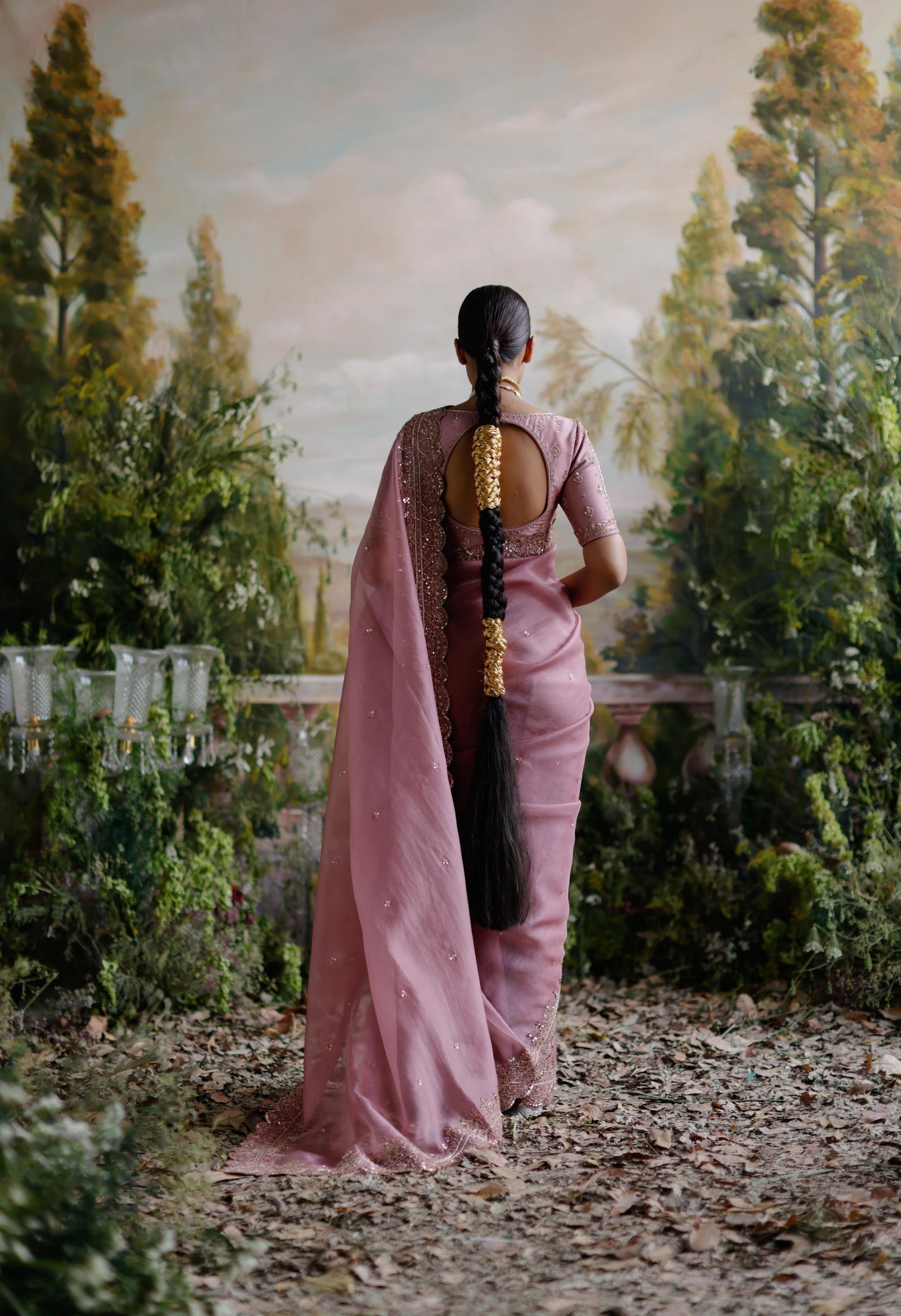 The Lilac Organza Saree Paired With A Chanderi Silk Blouse Captures The Essence Of Understated Elegance And Contemporary Finesse, Making It A Charming Choice For Those Who Seek A Perfect Balance Of Tradition And Modernity. Adorned With Antique Gold Dori, Intricate Aari Embroidery, And Embellished Handwork, The Blouse Pays Homage To The Age-Old Techniques That Define Indian Craftsmanship. The Soft Lilac Shade Exudes A Sense Of Tranquillity And Poise, Making It A Versatile Option For Both Daytime And Evening Events. Be It A Wedding Celebration, A Cultural Event, Or A Festive Occasion, The Lilac Organza Saree Is Your Key To Making An Unforgettable Impression.