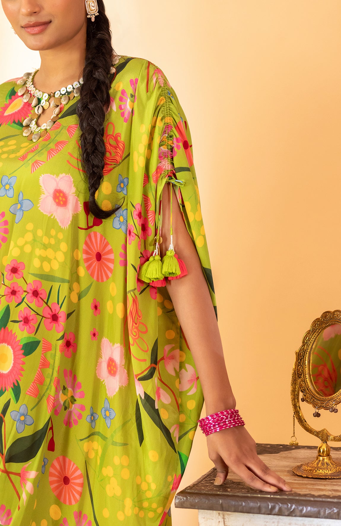 A Lime Green Kaftan Set With A Matching Floral Print Pant, Featuring Small Hangings On The Neckline And Drawstrings With Hangings On The Sleeves For Added Embellishment.