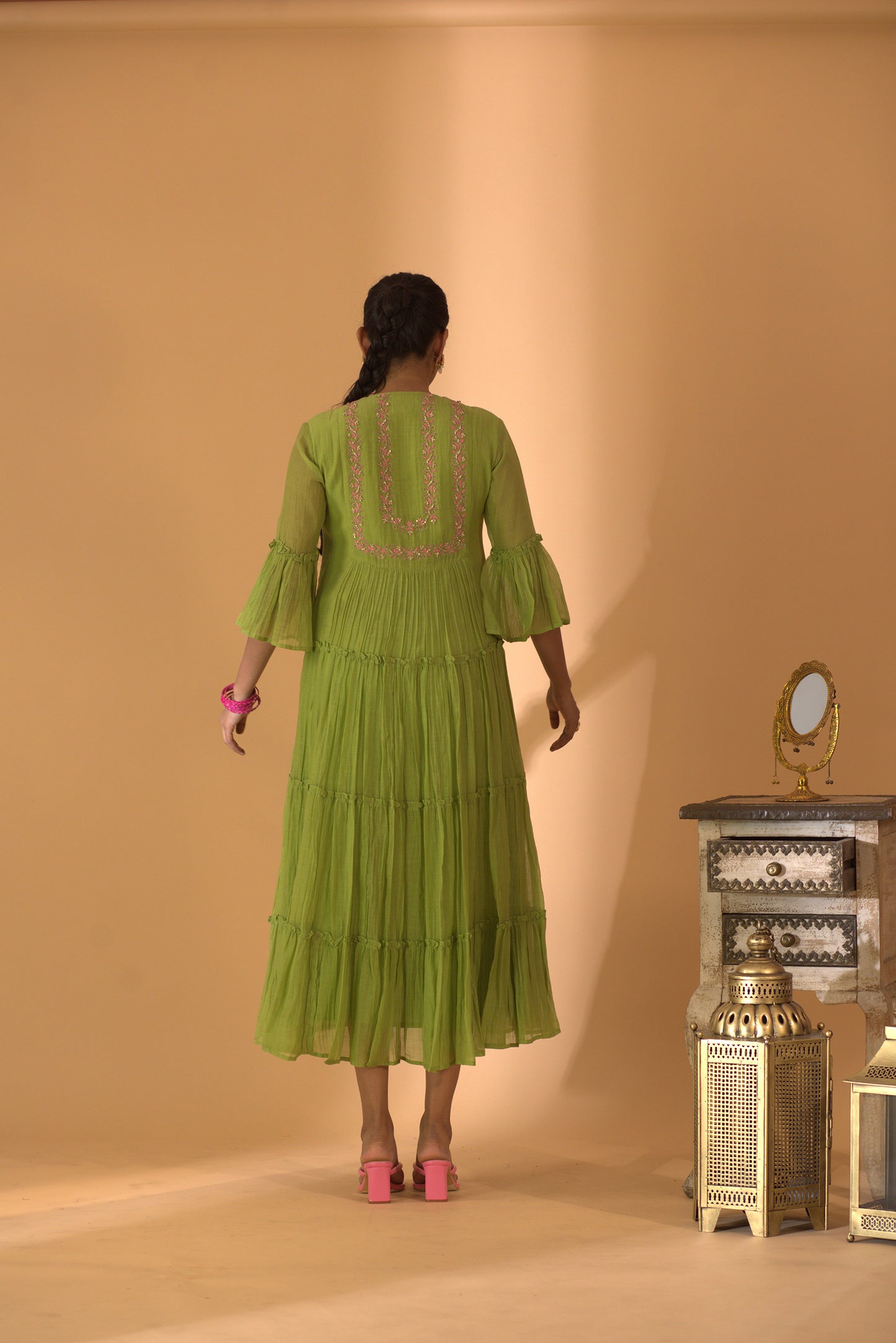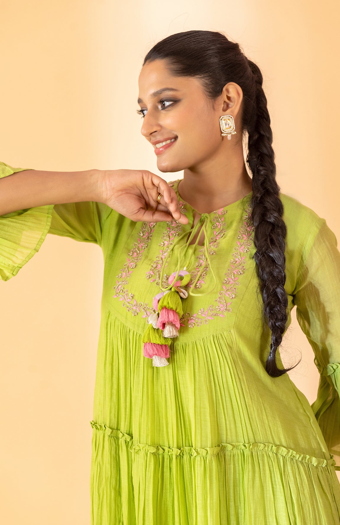 A Lime Green One-Piece Outfit With Layered Design And Intricate Contrast Thread Work And Kardana Embellishments.
