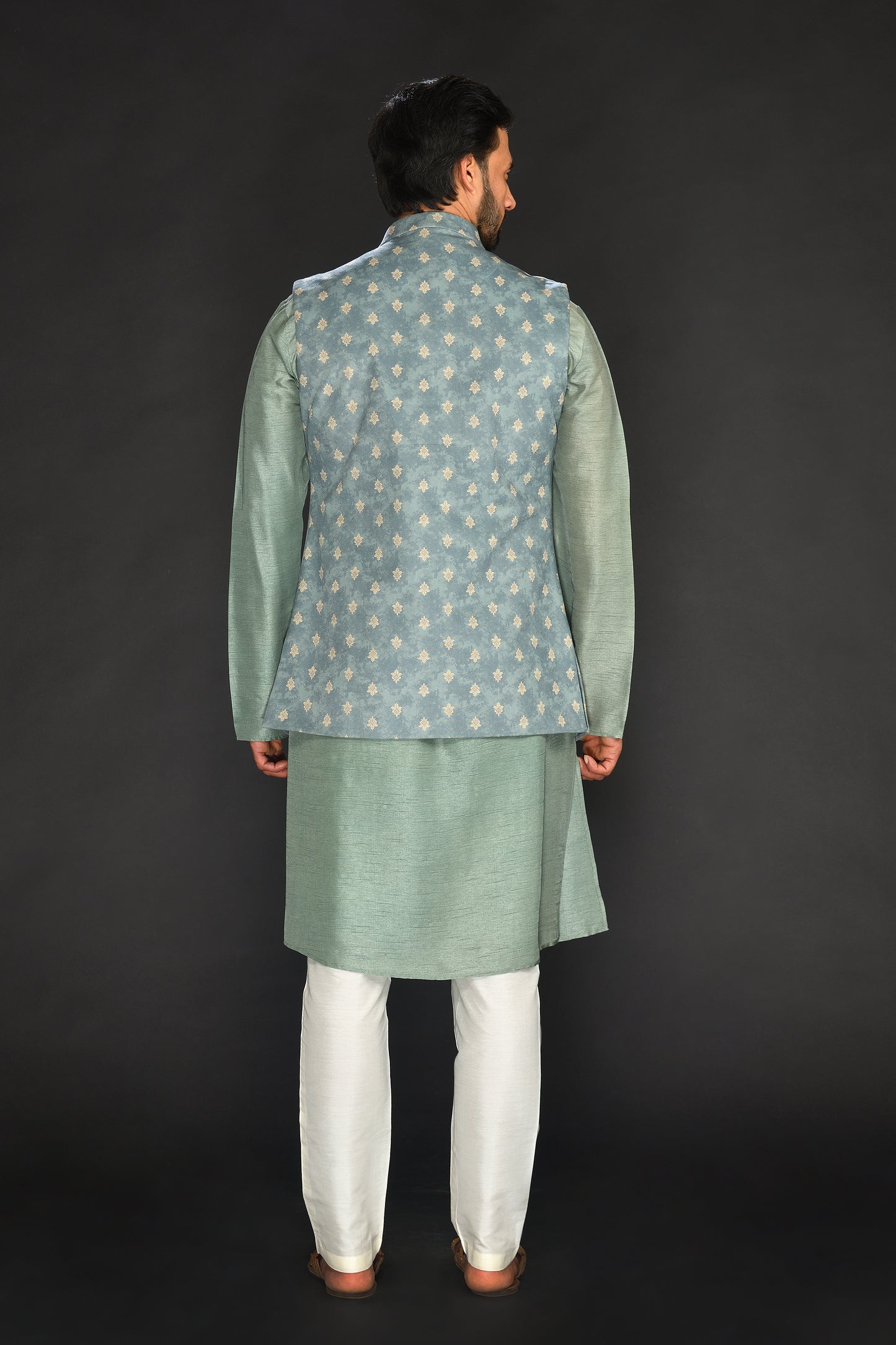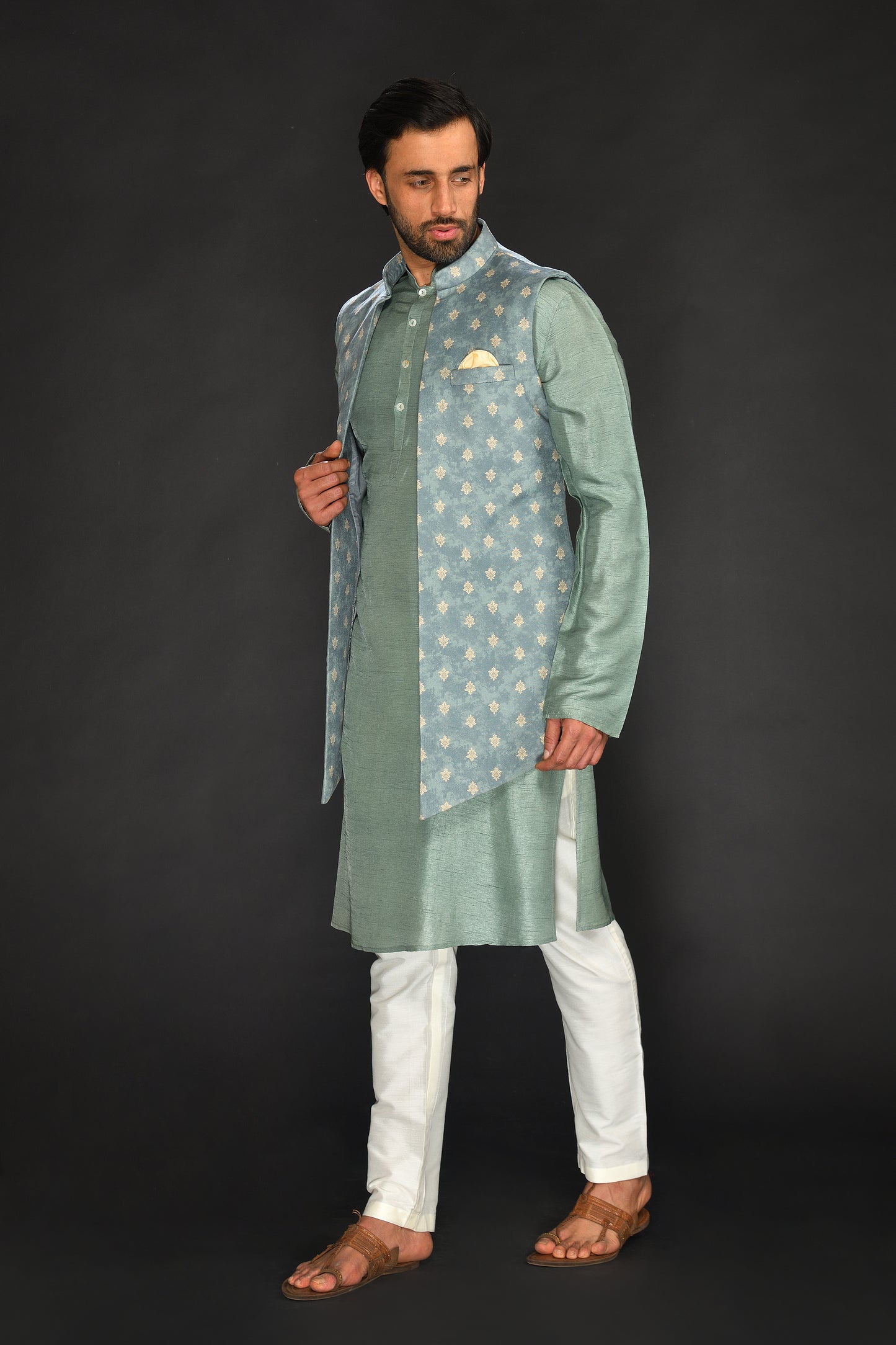A Dull Mint Green Long Bundi Based On Velvet Is Paired With A Viscose Silk Kurta And White Churidar Pant Based On Spun Silk.