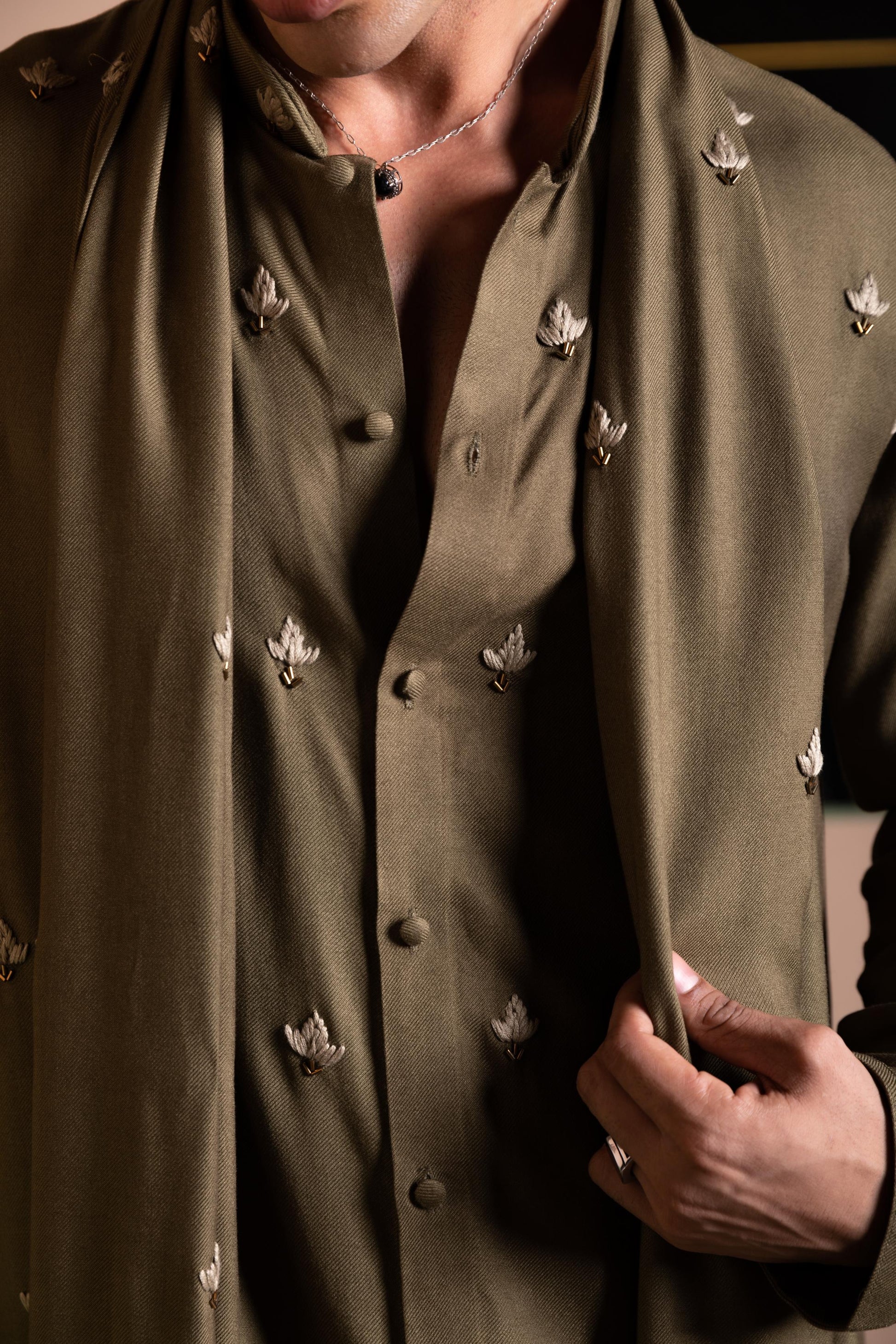 Twill Kurta And Stole With Contrast Thread Buttis And Off White Pants.
