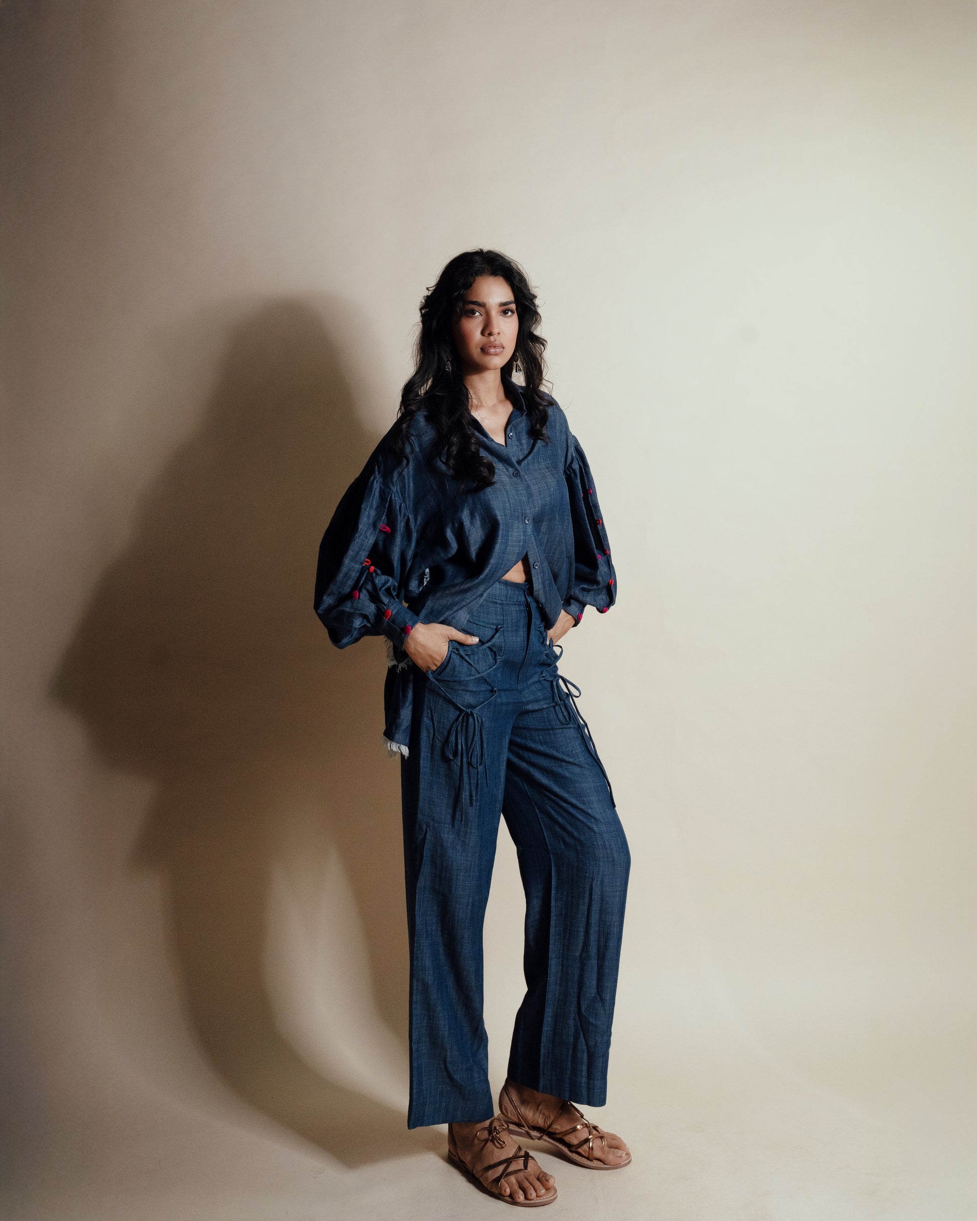 A Twist On Classic Style With A Touch Of Cool. This Drop-Shoulder Shirt Features Fabric Buttoned Placket Sleeves That Reveal A Chic Slit When Undone. With A High-Low Hemline And Frayed Denim Edges, It Combines Raw, Unfinished Edges With A Polished Look. The Red, Abstract Paisley Heart Embroidery Adds A Bold, Artistic Touch, Crafted With Towel Embroidery Technique. Pair It With Our Tencel Heart String Shorts For A Fresh Co-Ord Look, Or Go Casual With White Pants Or Your Favorite Denim — This Shirt Brings Laid-Back Yet Elevated Vibes To Any Outfit.