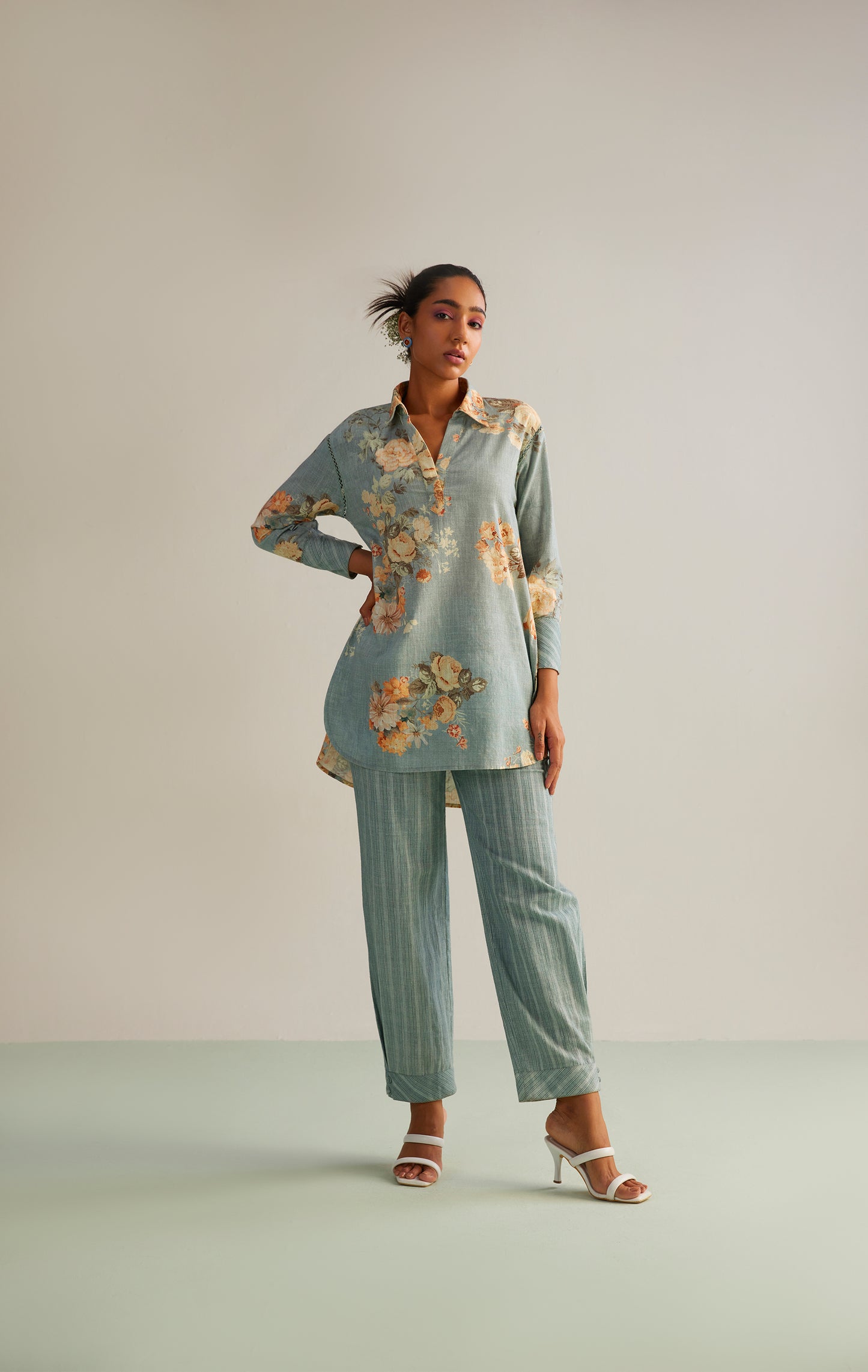 Crafted From The Finest Viscose Slub Fabric, This Tunic Set Features A Plush Tunic That Is Both Hand-Painted And Printed With Intricate Floral Motifs, Perfectly Complemented By Coordinated Striped Pants For A Look That'S Effortlessly Chic. The Combination Of Hand-Painted And Printed Floral Motifs Creates A Visual Masterpiece That Captures The Timeless Beauty Of Nature. Whether You'Re Attending A Daytime Event, A Stylish Gathering, Or A Cultural Celebration, This Ensemble Will Make You Radiate Charm And Confidence.