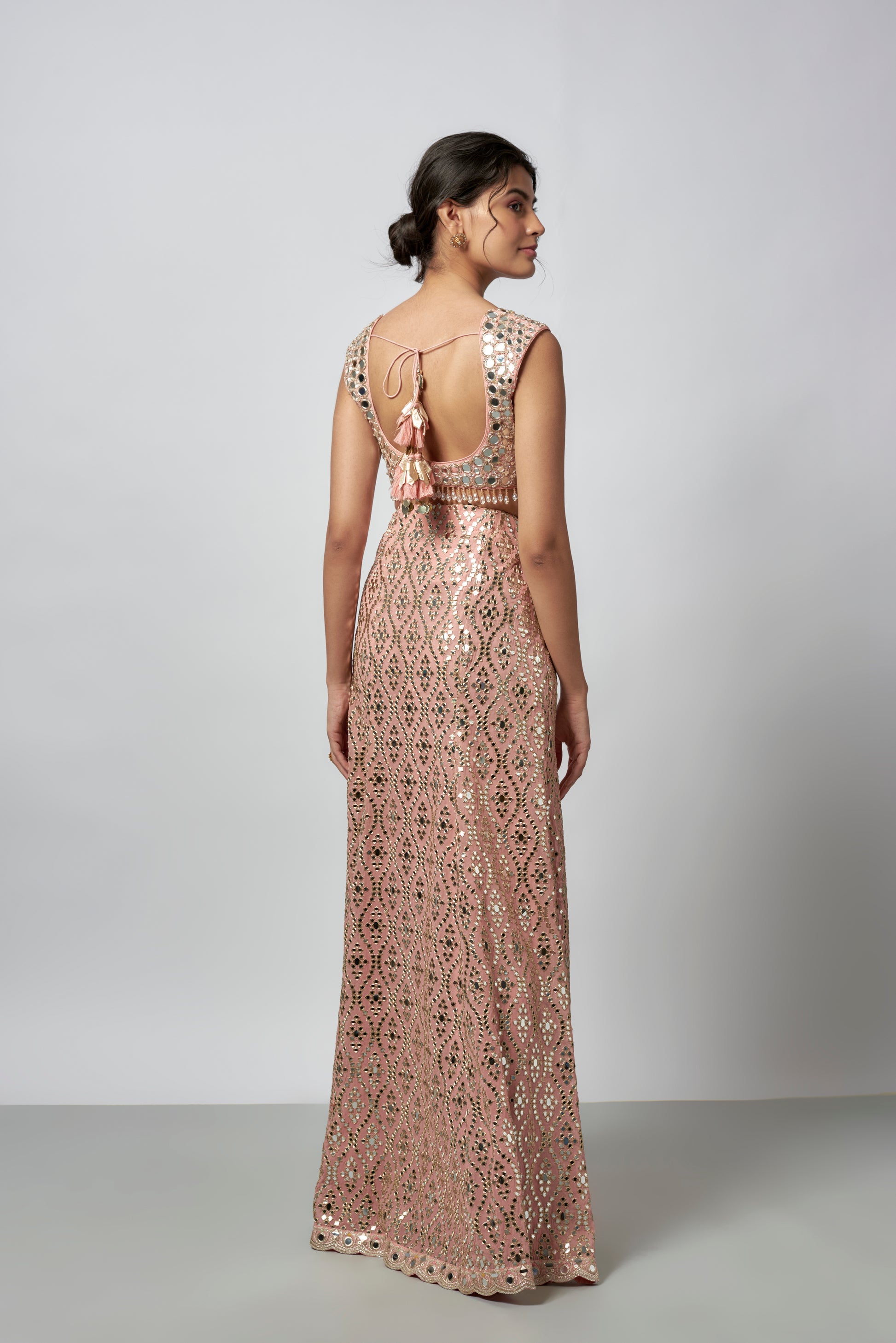 The Crop Top Is Hand Embroidered With Intricate Mirror Work And Delicate Embroidery, Featuring A Flattering Square Neckline And Beads Hanging Along Hem. The High-Slit Skirt Is Equally Captivating, Showcasing Mirror Work And Embroidery That Shimmer Beautifully.