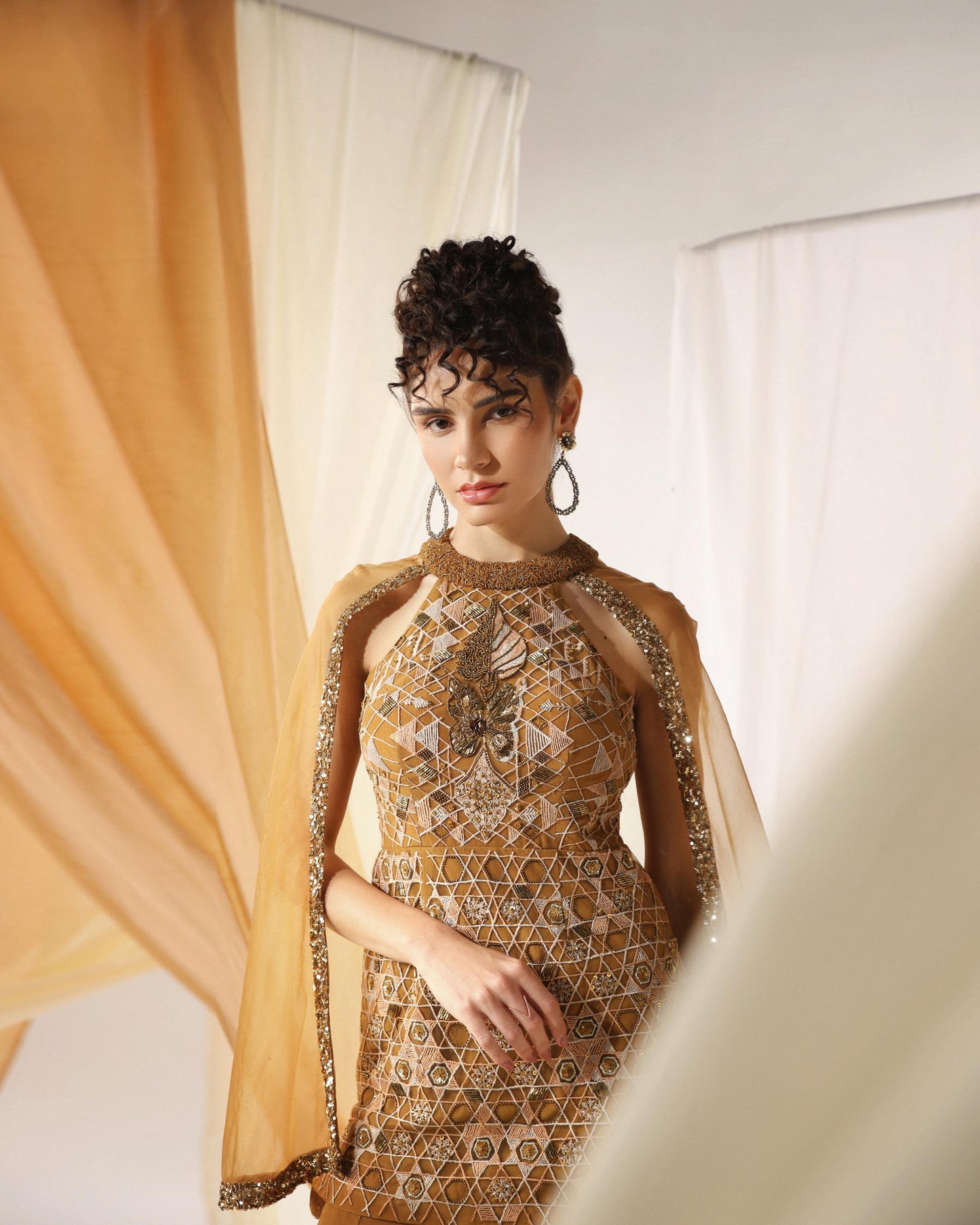 Tunic And Sharara Set With A Cape Attached In An Interesting Style. The Embroidery Features Motifs That Symbolise The Harmony Between Natural And Artificial Intelligence. The Jaal Illustrates The Intricate Web Of Gen Alpha.