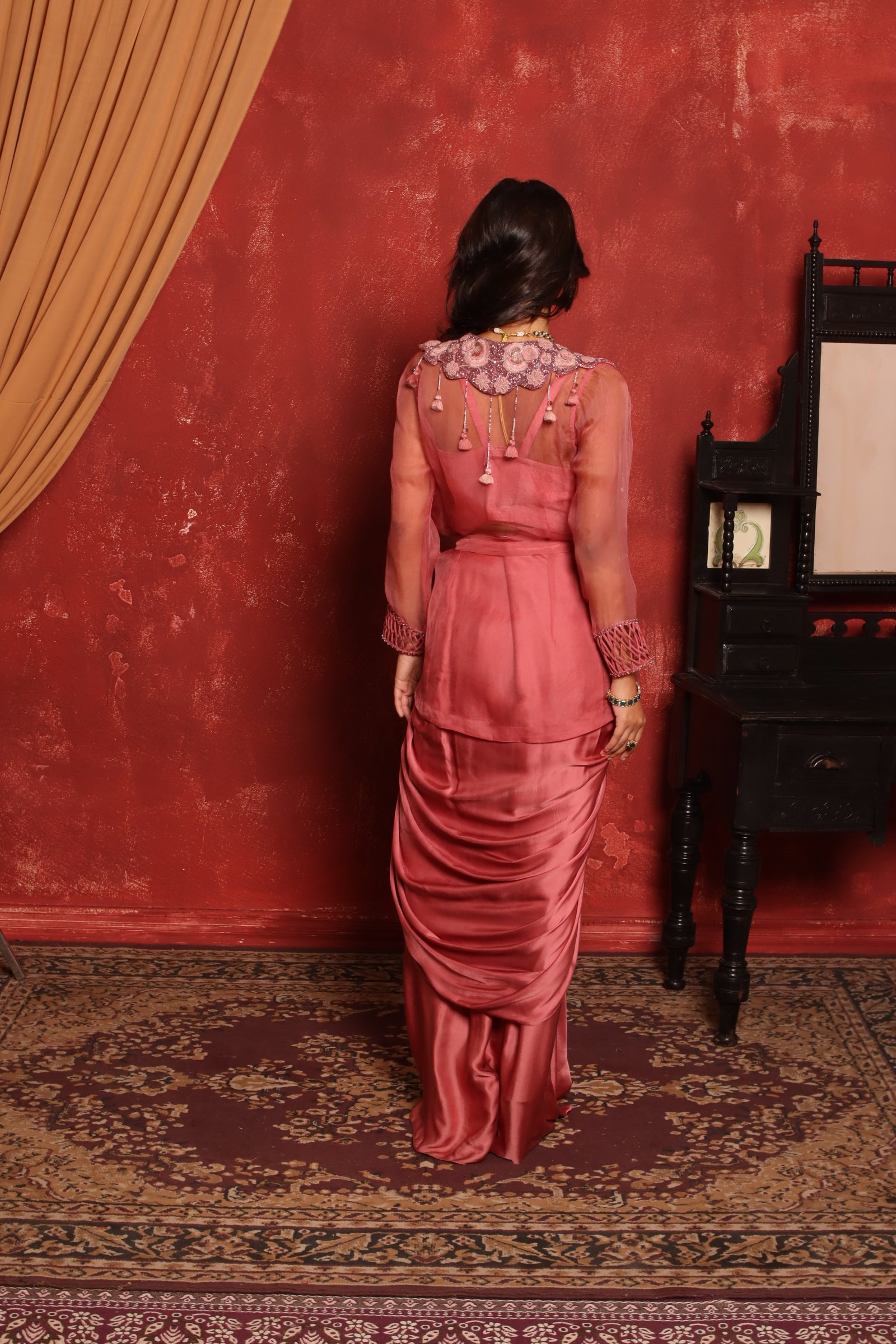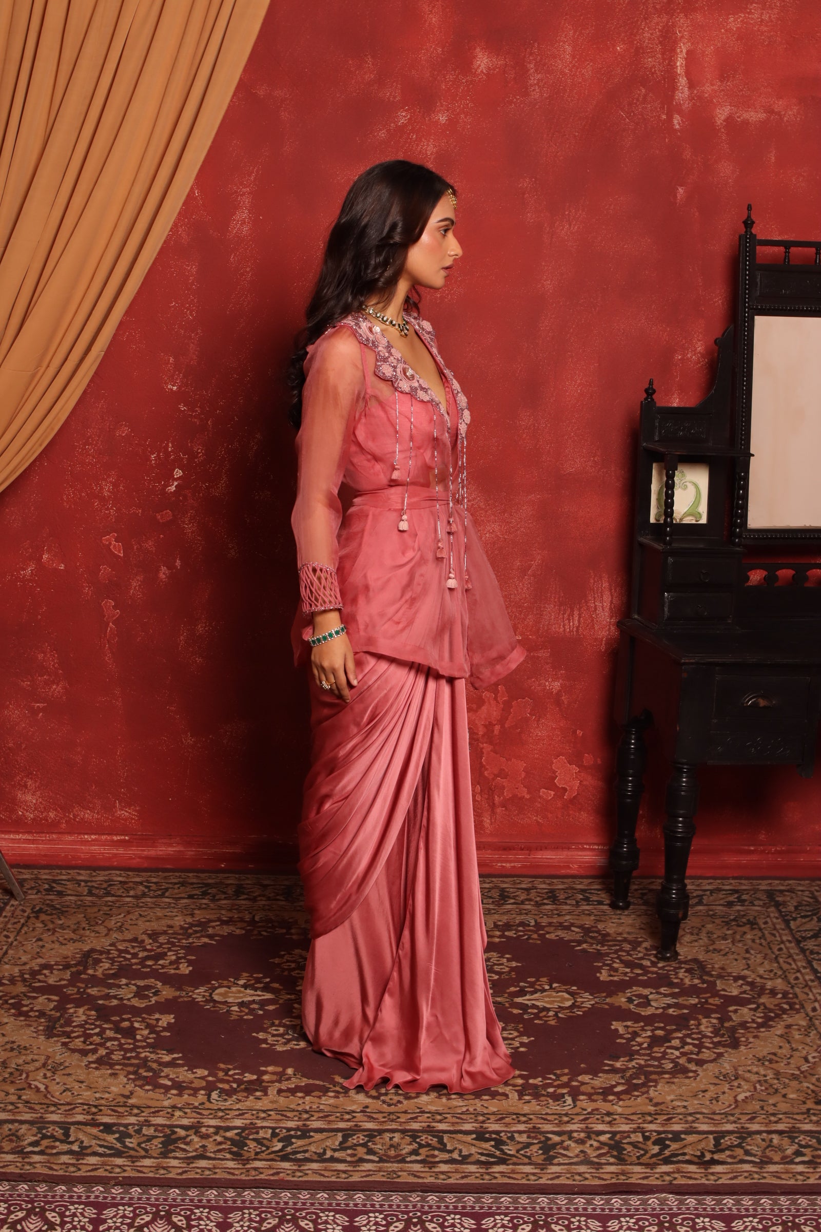 Elegant Finesse! This Outfit Is All About Luxurious Textures & Exquisite Detail. Featuring Katdana & Chir Embroidery On The Organza Long Jacket Highlighting The Collar, Bustier & Flowy Skirt With A Decorated Belt Create A Look That's Both Glamorous & Comfortable.
