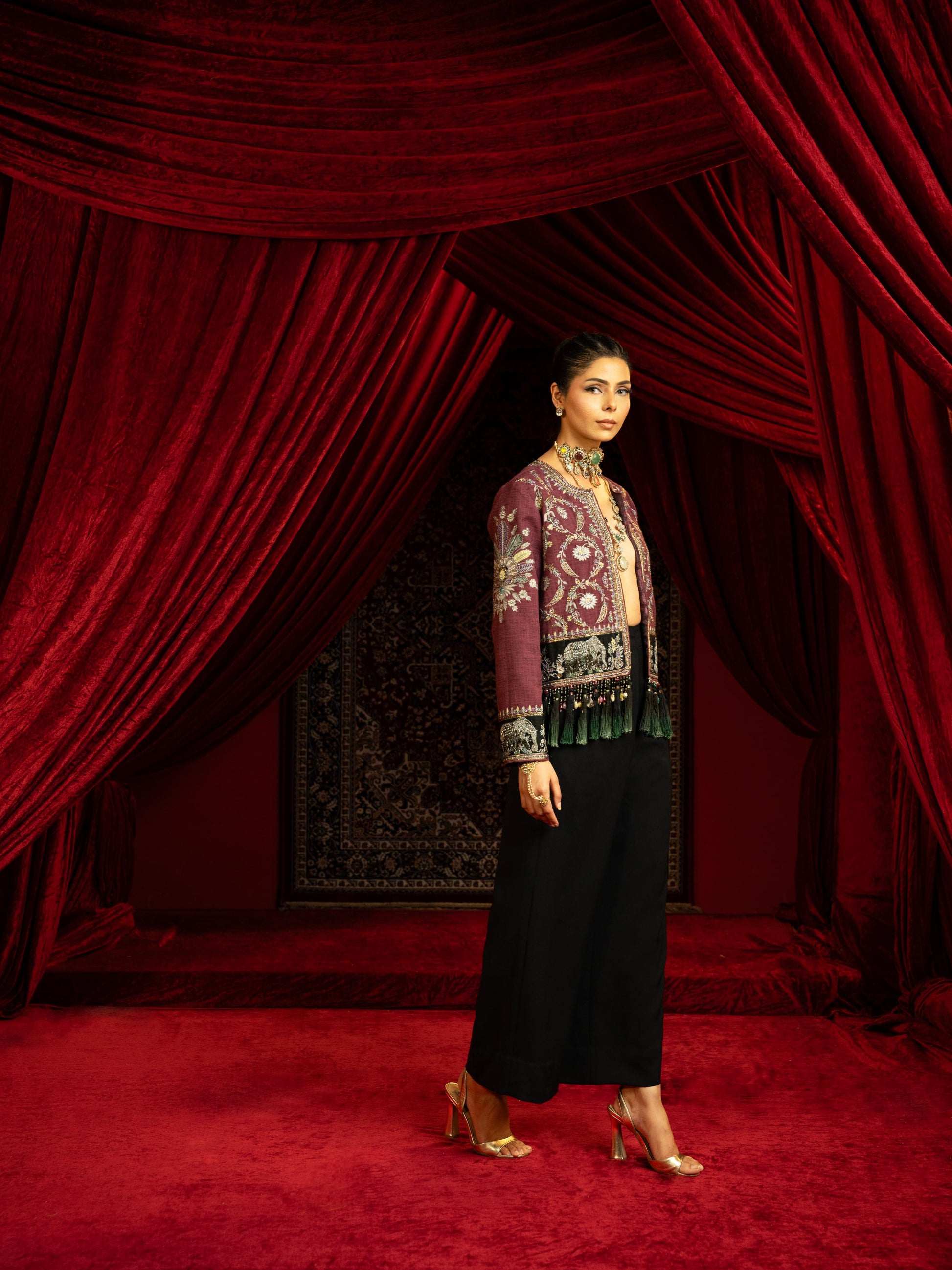 A Chic And Contemporary Fusion Set, Featuring A Short Front-Open Mauve Jacket Fully Adorned With Vintage Embroidery, Jewel Beads, And Ombré Silk Thread Long Tassels, Paired With Elegant Black Flared Pants. This Look Combines Intricate Craftsmanship With Modern Silhouettes For A Striking Statement. Perfect For Festive Soirées, Cocktail Events, Or Stylish Evening Gatherings.