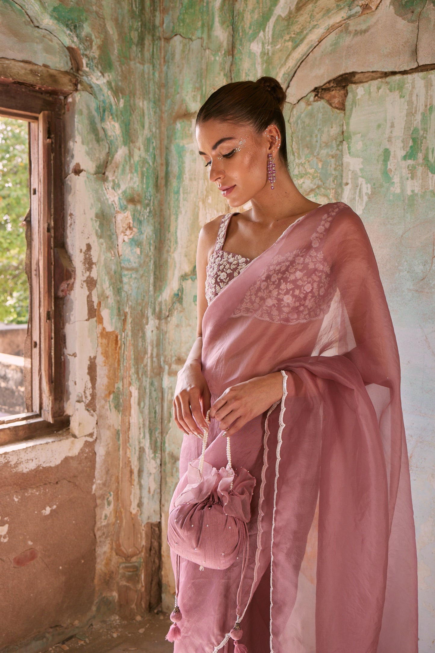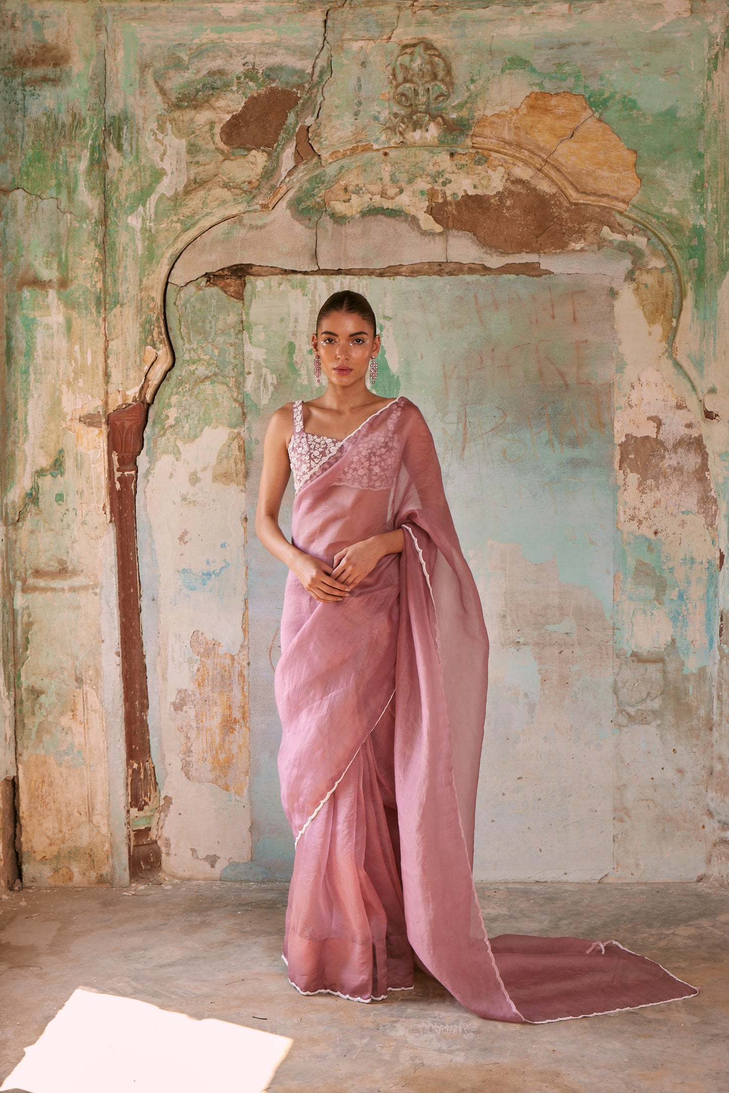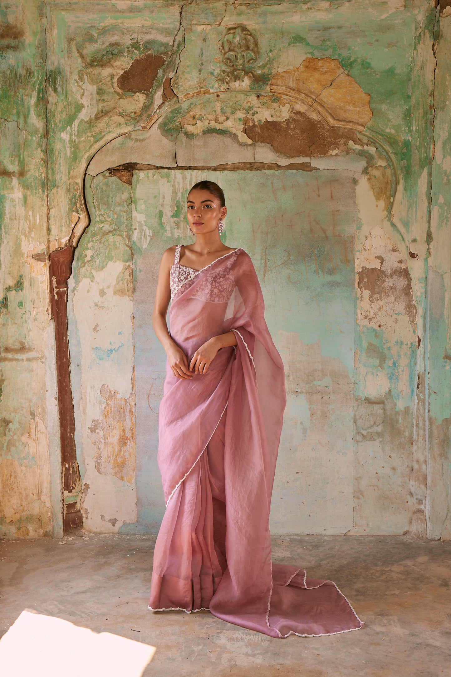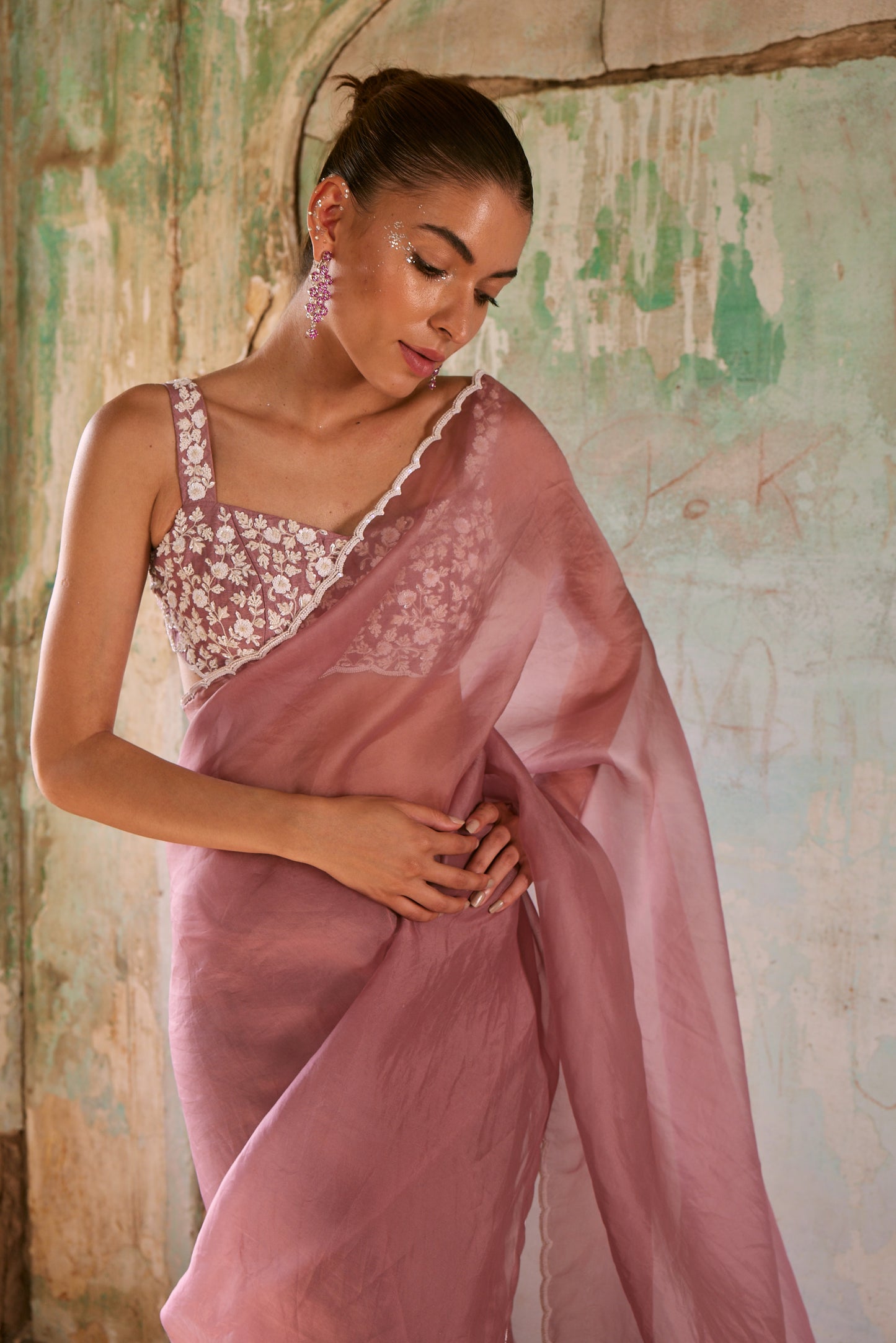 The Mauve Saree Is A Vision Of Understated Elegance And Femininity. Crafted From Delicate Organza Fabric, The Saree Drapes Gracefully, Creating A Sense Of Ethereal Charm. The Accompanying Blouse, Made From Luxurious Dupion Silk, Features Delicate Floral Thread Embroidery, Adding A Touch Of Sophistication And Natural Beauty To The Ensemble. The Soft Mauve Colour Of The Saree Complements A Variety Of Skin Tones, Making It A Versatile Choice For Weddings, Festivities, Or Any Special Occasion. With Its Graceful Drape And Subtle Embroidery, The Mauve Saree By Label Mayaa Is Sure To Make You Look And Feel Elegant And Confident On Your Special Day.