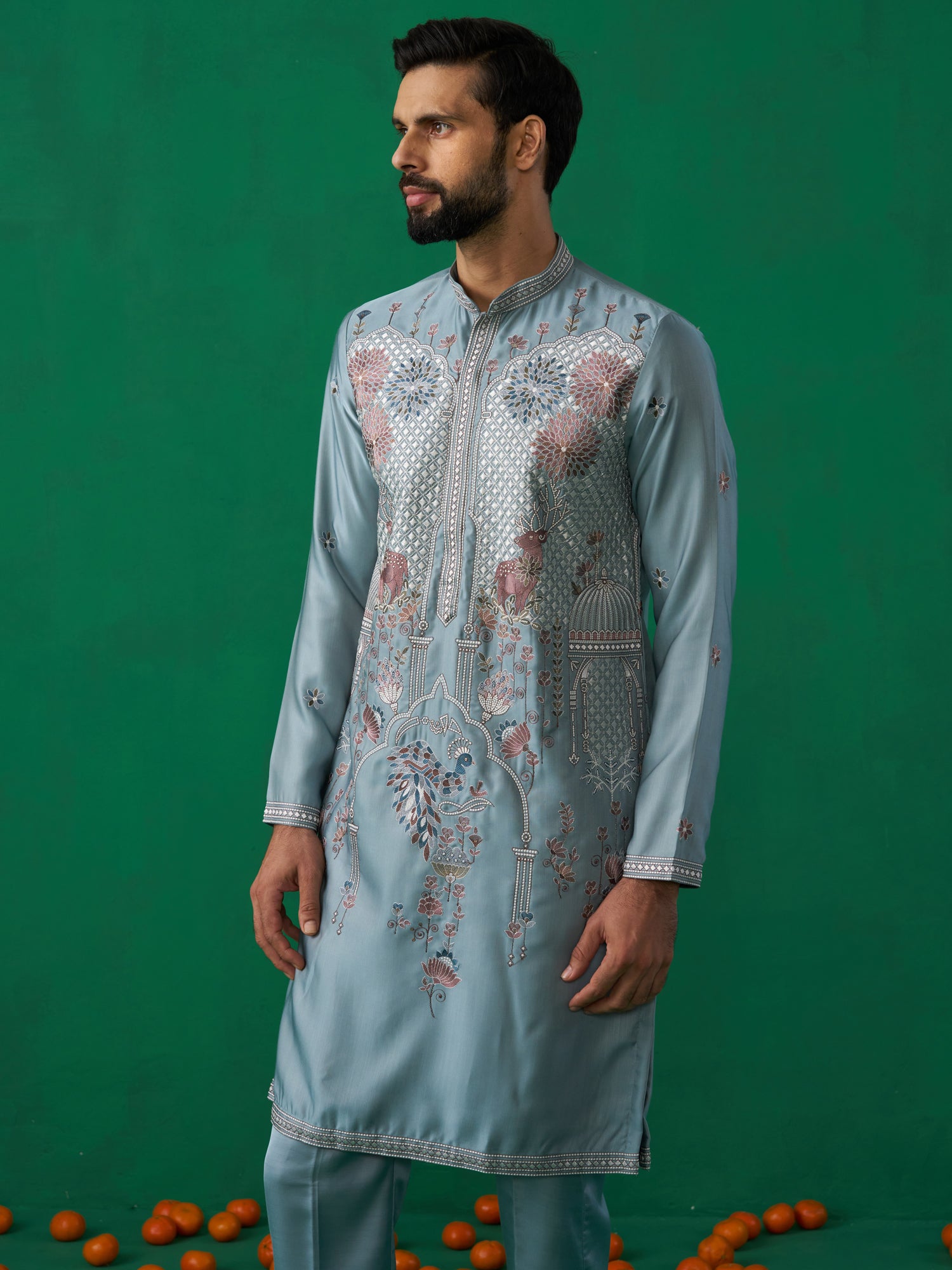 This Exquisite Kurta Set Is A Masterpiece Of Contemporary Festive Wear. The Long-Sleeved Kurta Is A Canvas For A Striking, Intricate Embroidered Design That Commands Attention. The Pattern Is A Fusion Of Stylized Architectural Elements And Graceful Floral And Peacock Embroidery, Creating A Visually Stunning Facade. The Detailing Extends To The Cuffs And Hem, Framing The Garment With Subtle Sophistication. The Clean, Straight-Cut Trousers Complete The Look, Making It A Perfect Ensemble For Festive And Wedding Wear.