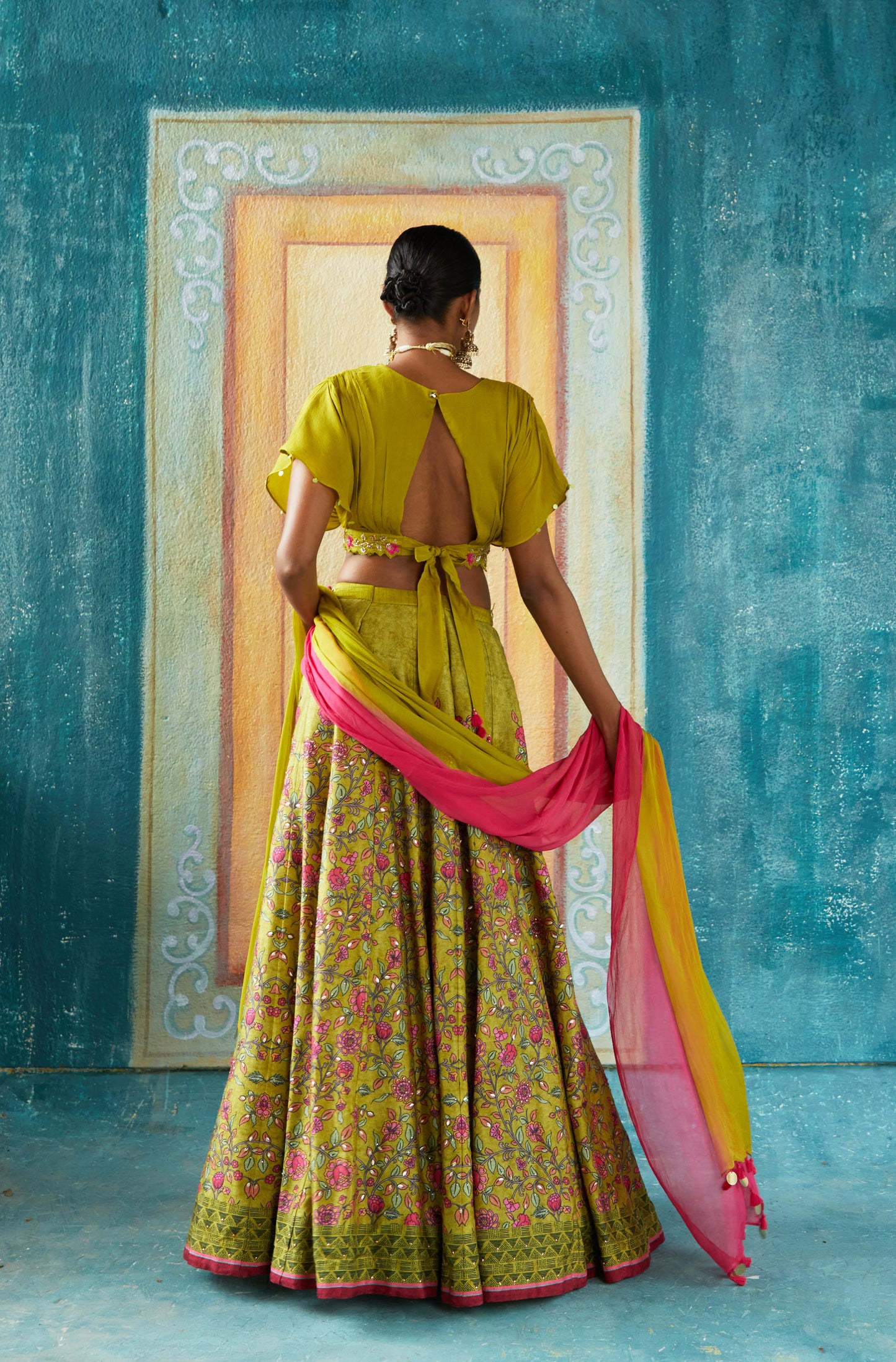 Mehendi Printed Lehenga Set With Hand Embroidery Neckline And Shaded Chiffon Dupatta.