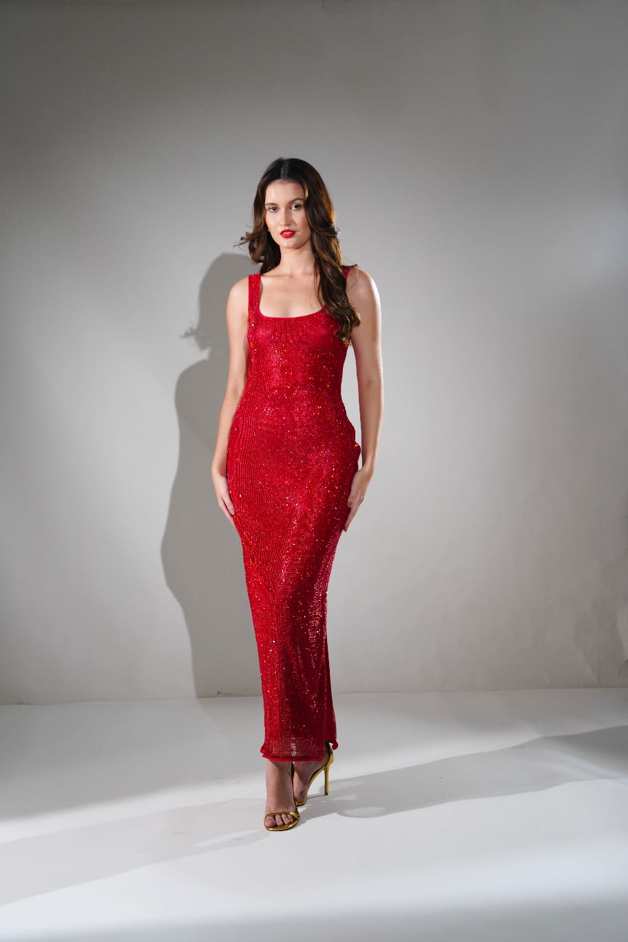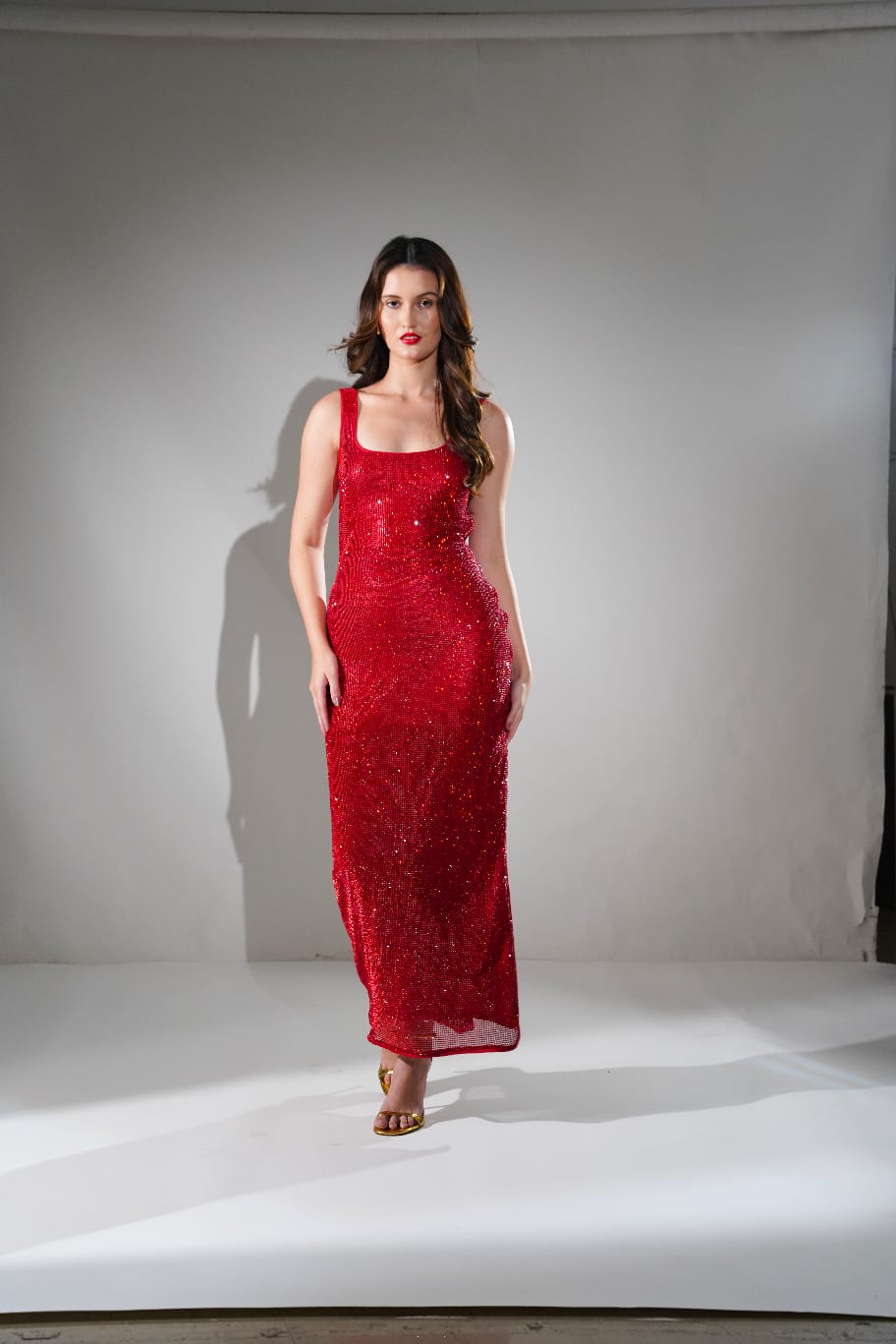 MIDNIGHT RED CHAINMAIL METALLIC MAXI DRESS