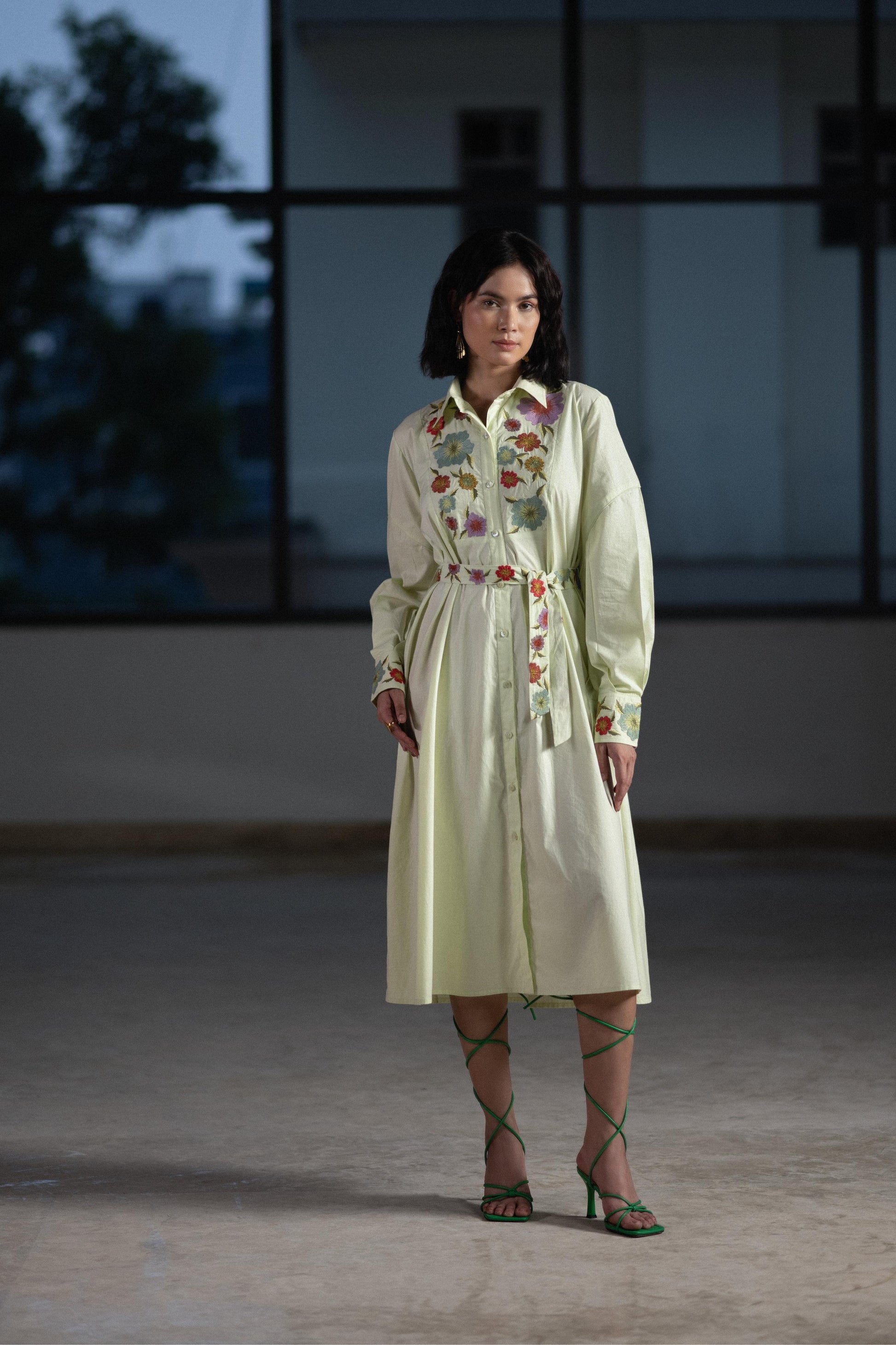 Midi Dress Adorned With Exquisite Floral Thread Embroidery, Gracefully Cascading From The Yoke To The Belt And Cuffs. The A-Line Silhouette, Front Button Placket And Seam Detailing On The Sleeves Enhance Its Timeless Appeal.