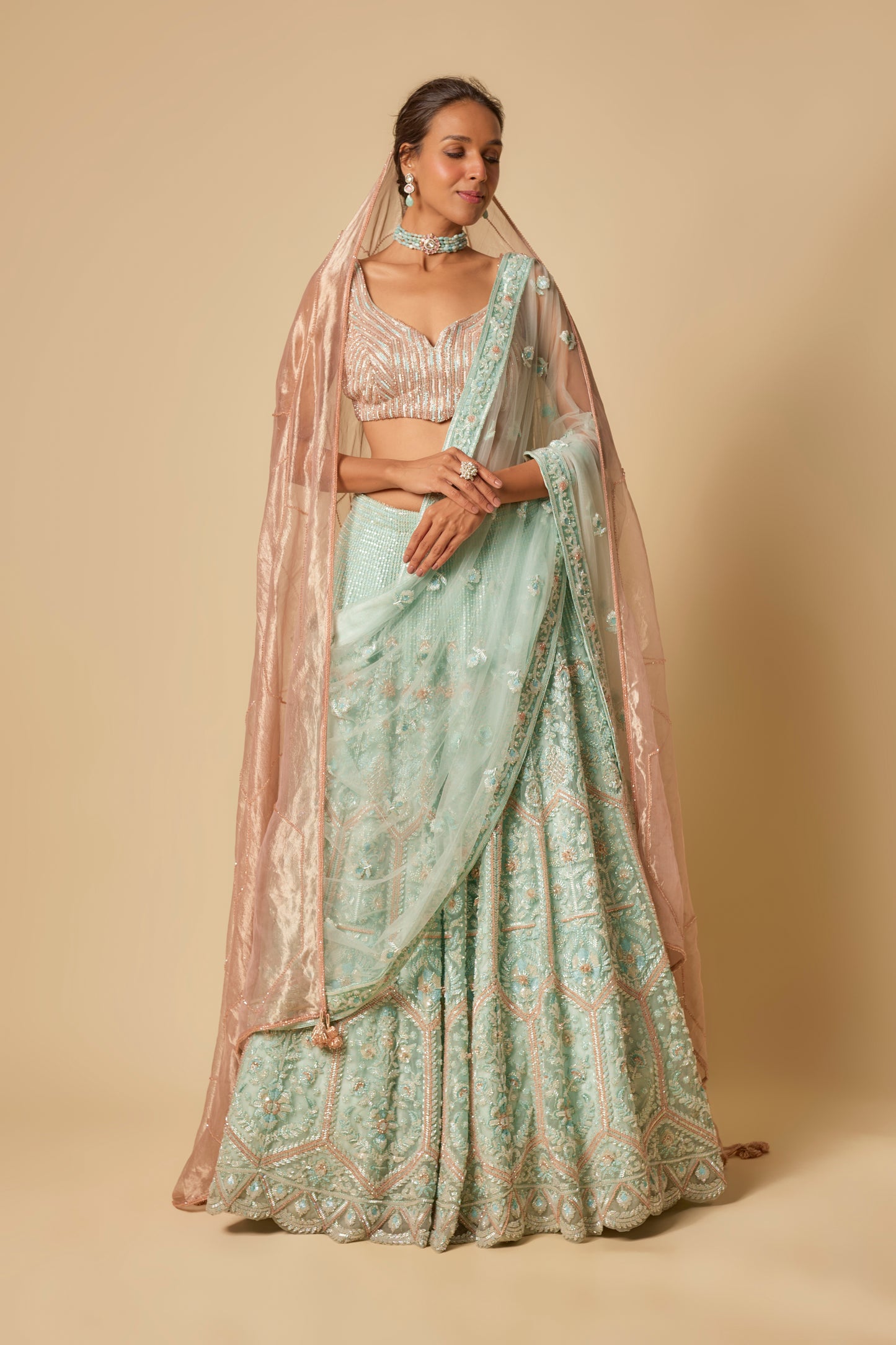 Featuring Mint Heavy Embroidered Lehenga In Tulle With 2 Dupatta And Matching Embroidered Blouse In Mashroo Silk.