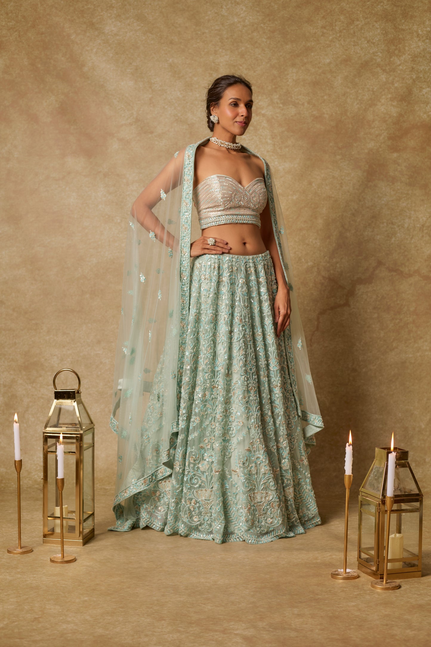 Featuring Mint Heavy Embroidered Lehenga In Tulle With Embroidered Blouse In Mashroo Silk