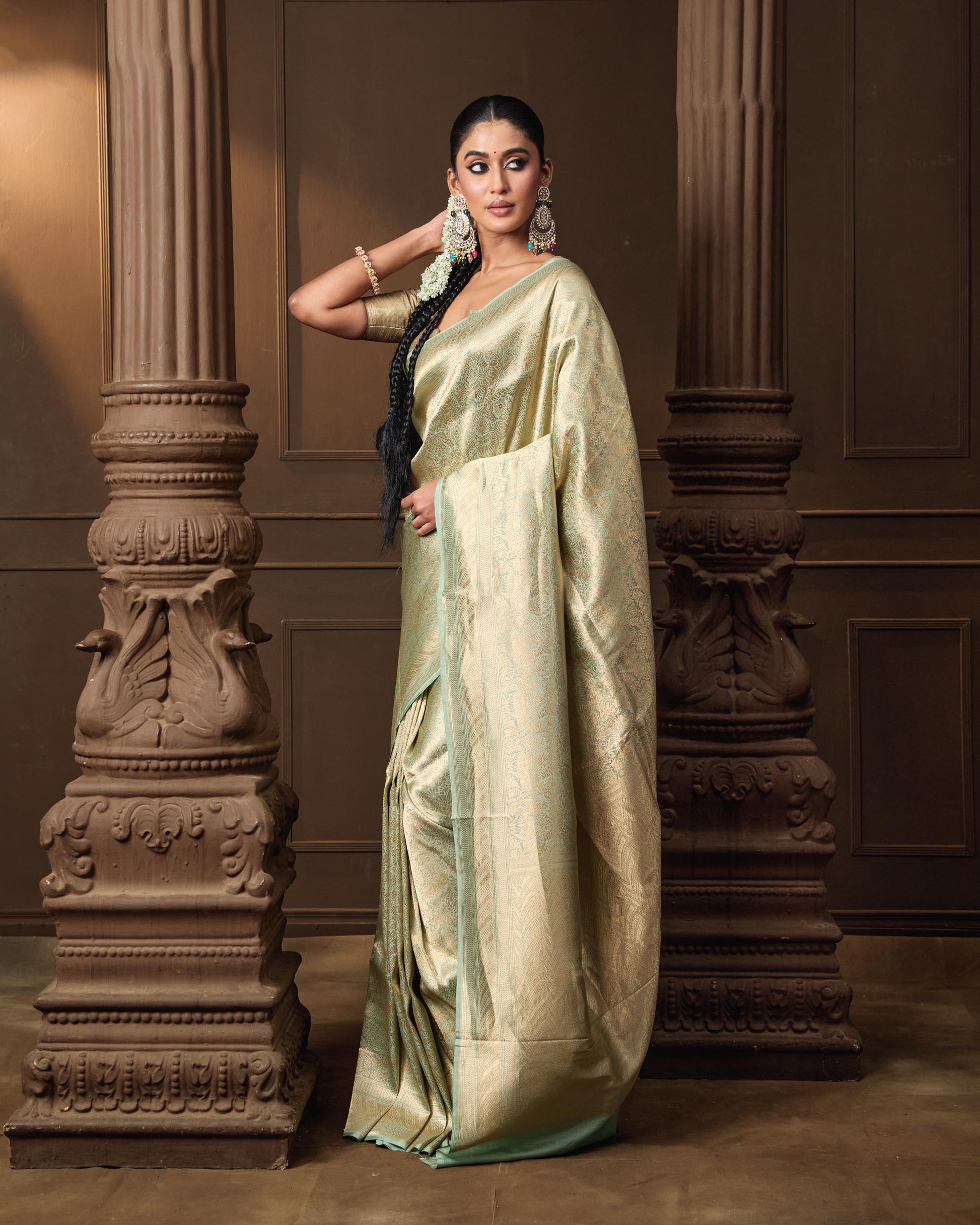 Mint Brocade Silk Saree With Running Blouse Piece.