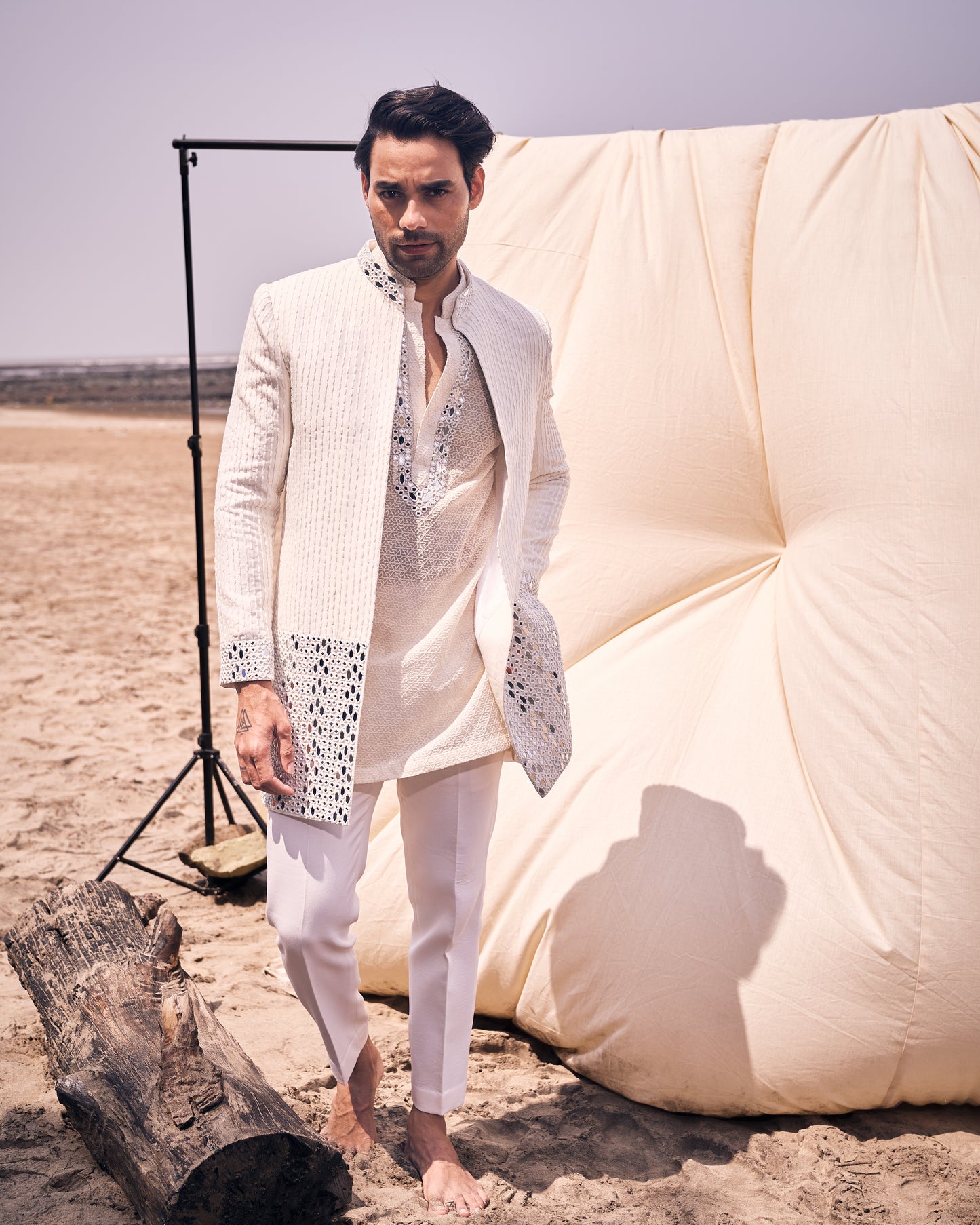 Textured Silk Jacket With Mirror Work Paired With A Lucknowi Kurta With Mirror Neckline And White Formal Pants.