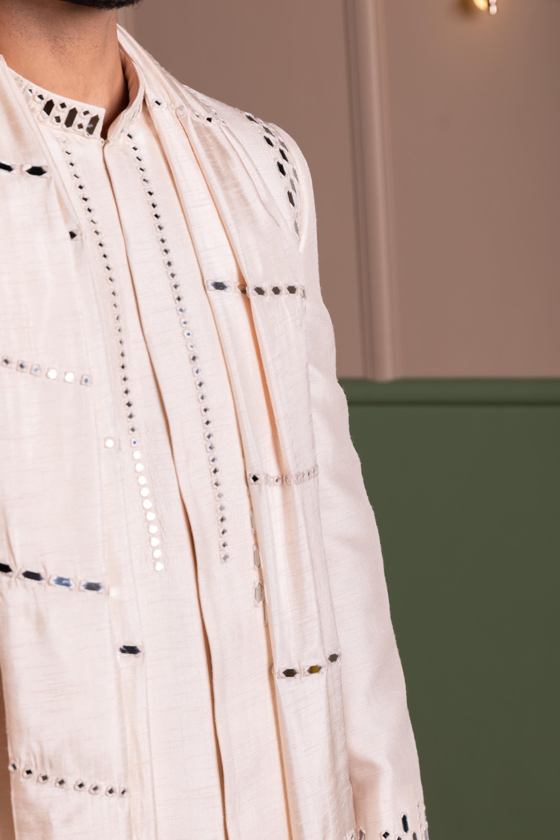 Silk Achkan With Kurta With Mirror Work Paired With A Dupatta And Pants.