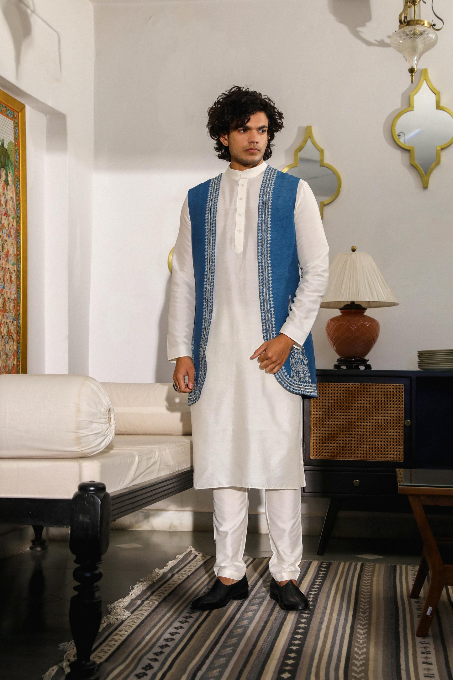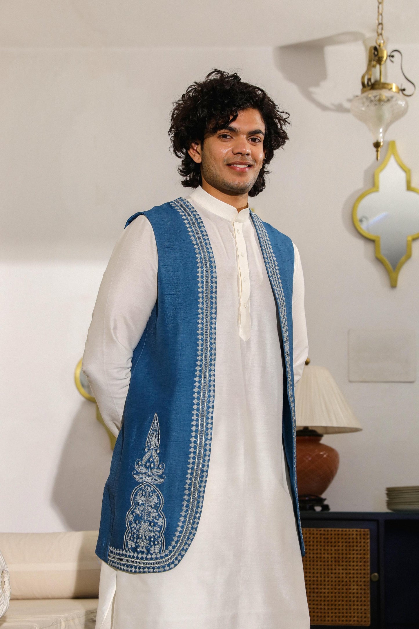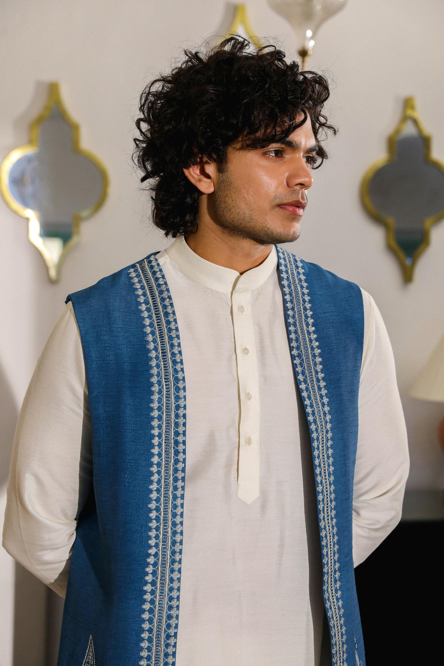 The Meticulous Detailing Showcases The Skill And Artistry Of Our Craftsmen, Making This Mirza Bundi A True Work Of Art. Crafted With Meticulous Attention To Detail, This Bundi Features Intricate Embroidery In Contrasting Tones At The Front And Enhancing The Vibrant Cobalt Blue.
