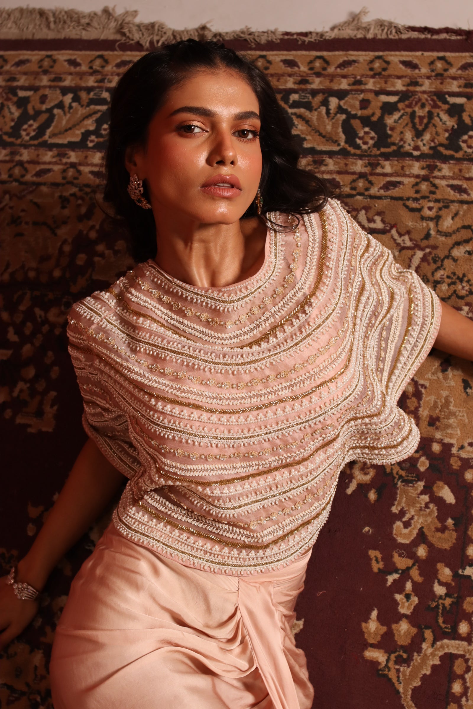 Indulge In The Moti Experience! The Moti Three-Piece Ensemble Is A Celebration Of Exquisite Detail & Luxurious Comfort. The Show-Stopping Cape, Adorned With Intricate Hand-Embroidery, Cascades Gracefully Over A Fitted Bustier That Accentuates Your Silhouette. The Accompanying Drape Skirt Flows Effortlessly, Completing The Look With Grace.