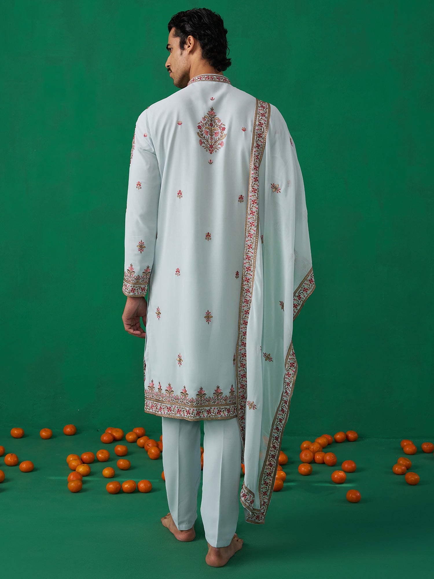 This Kurta Set Features A Long-Sleeved Kurta With Elaborate, Decorative Embroidery On The Front, Centered Around The Placket And Extending Vertically Down The Garment. The Intricate Design Includes Floral And Vine-Like Motifs. Small, Scattered Embroidered Details Are Also Visible On The Sleeves And Throughout The Body Of The Kurta. The Bottom Hem Is Finished With A Detailed Embroidered Border. The Set Includes Straight-Cut Trousers And A Matching Dupatta With A Wide, Ornate, Embroidered Border. The Entire Ensemble Is Suitable For Festive And Wedding Wear.