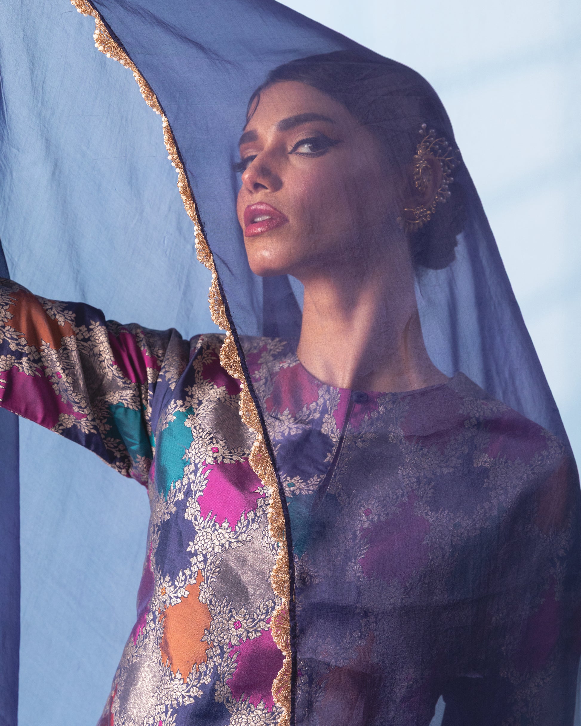 Rangkaat Banarsi Silk Kurta Sharara Set With Organza Duppata.