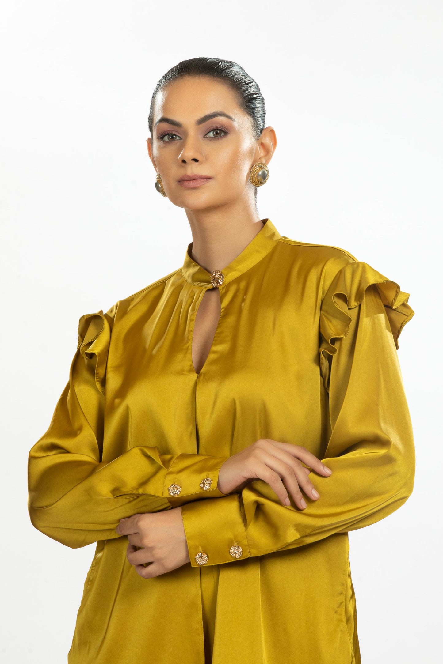 This Mustard Yellow Satin Shirt Features Golden Classy Buttons And Full Sleeves With A Frilled Design, Combining Elegance With A Touch Of Playful Sophistication.