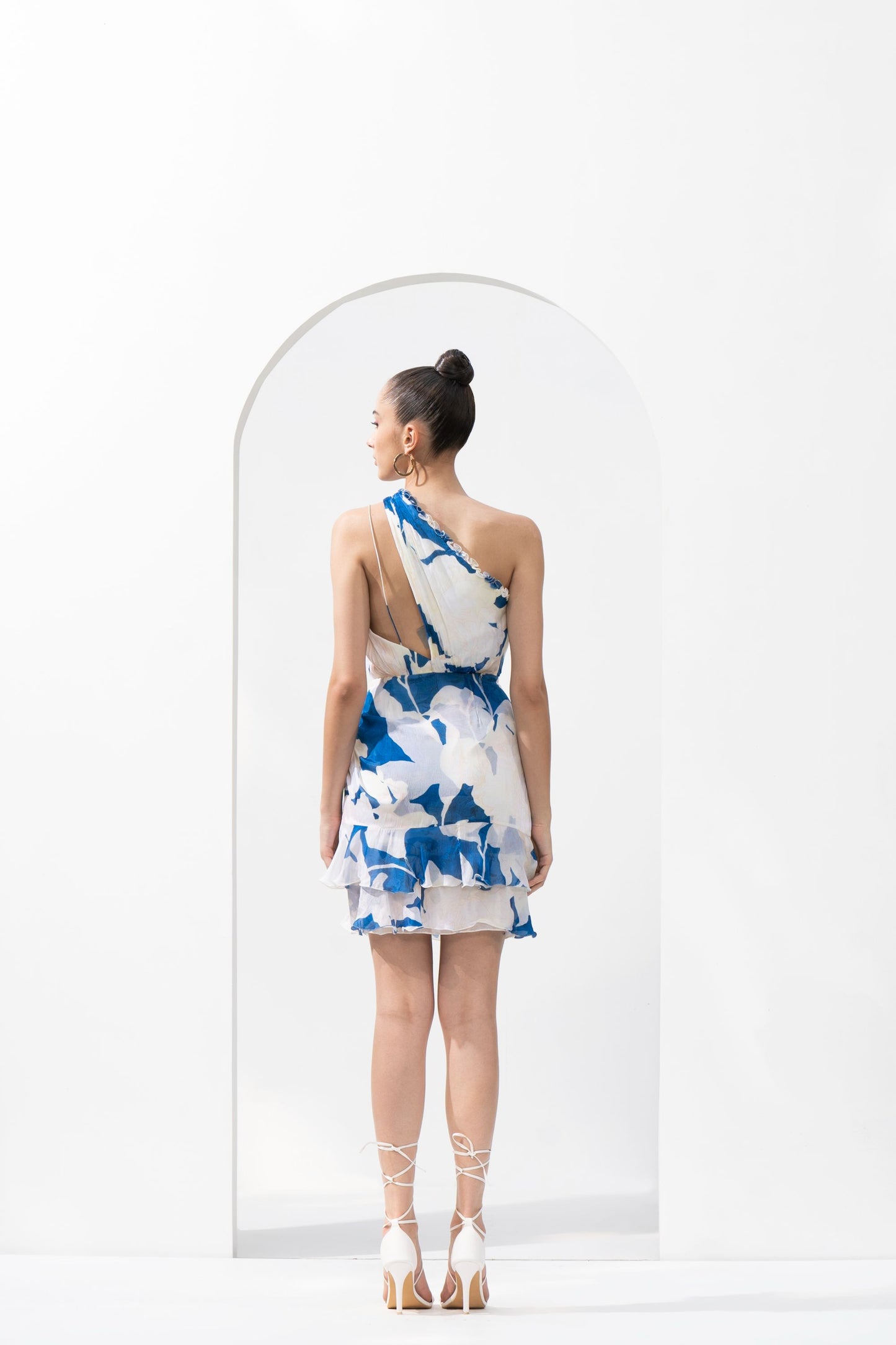 Crafted From Chiffon Fabric, This Dress Drapes Gracefully, Creating A Flowy Silhouette That Exudes Femininity. The Mystic Blue Texture Print Adds A Touch Of Mystique And Allure, With Its Captivating Patterns That Resemble The Beauty Of Texture. The Standout Feature Of This Dress Is The One-Shoulder Design And Gold Accessory.