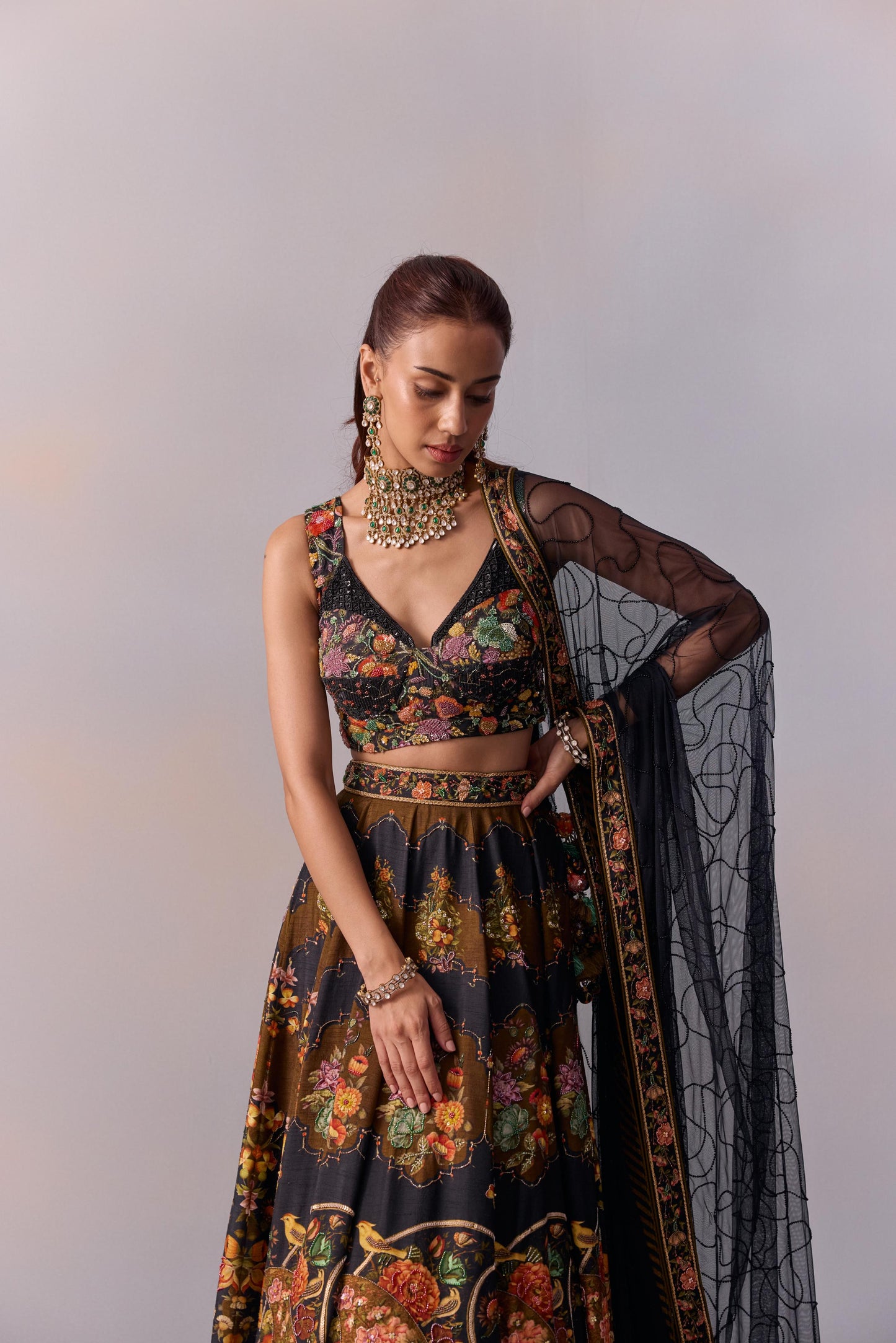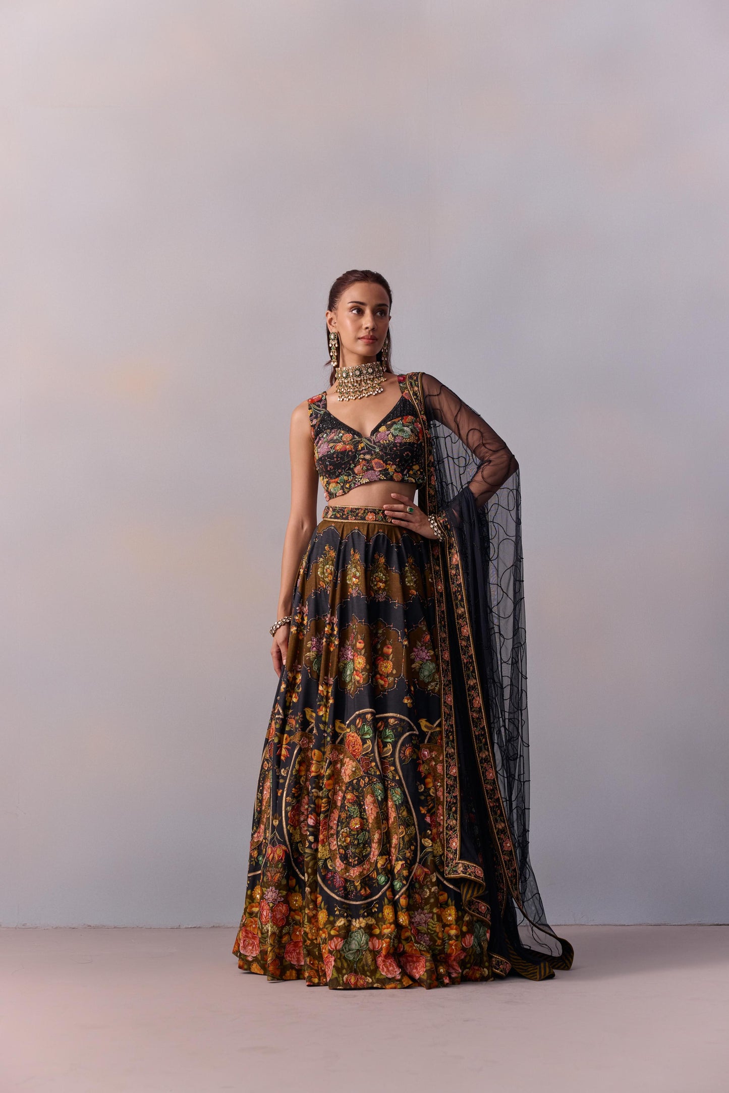 Presenting A Contemporary Twist To The Classic Lehenga Design With Vintage Floral Motifs And Paisley Motifs .The Set Is Paired With V Shaped Neckline Stylish Blouse With Heavy Hand Embroidery Detailing. Adorn Yourself In The Vibrant Floral Capturing The Essence Of Modern Sophistication.