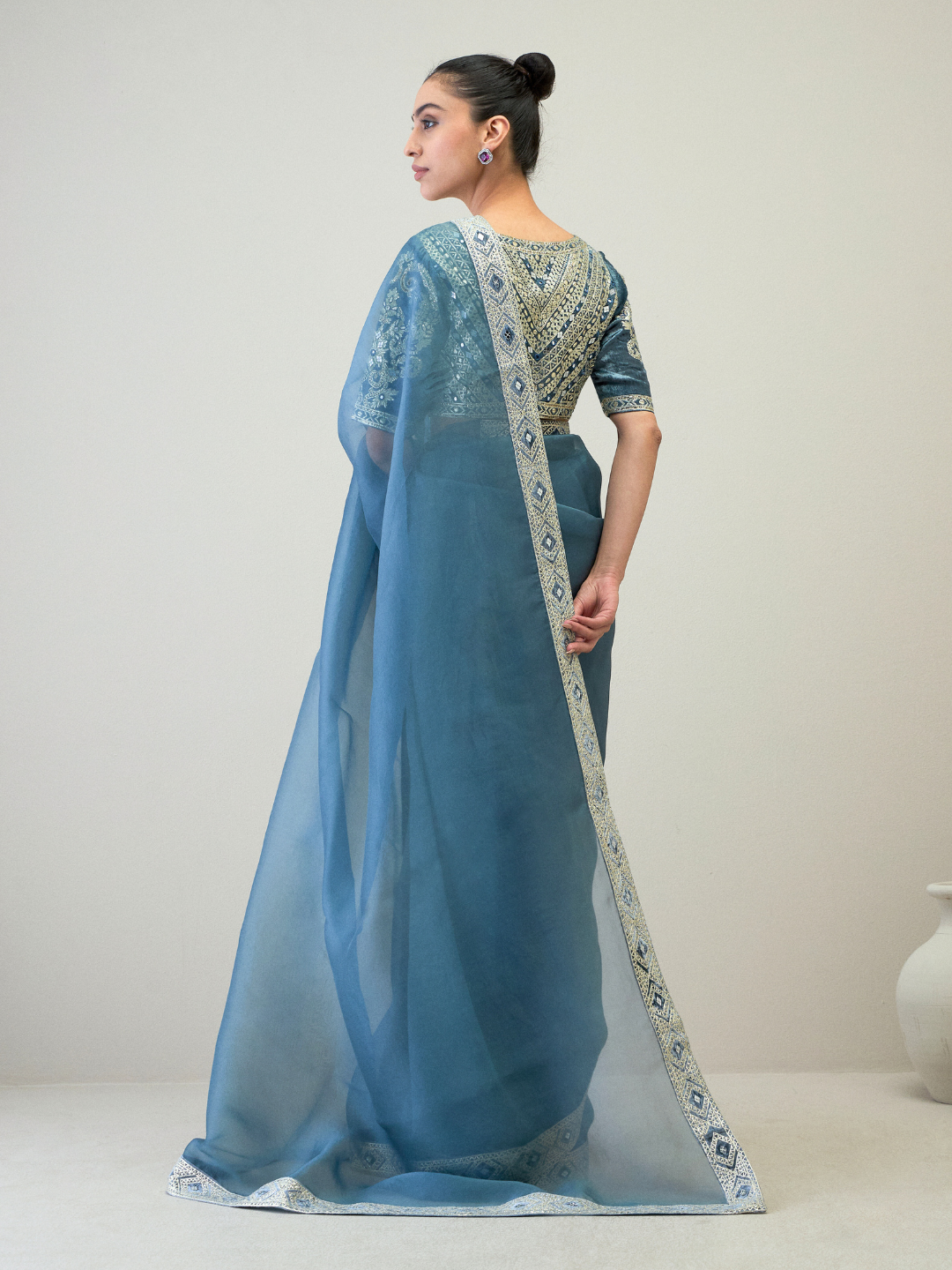 The Saree Features A Stunning Border Adorned With Intricate Mirror Work And Delicate Embroidery, Further Enhanced By Plush Velvet Accents. The Blouse Showcases Dazzling Mirror Work And Intricate Zari Patterns, Creating A Spectacular Effect That Ensures You’ll Be The Center Of Attention. Complete Your Look With Elegant Heels Or Traditional Juttis For A Perfect Blend Of Style And Comfort.