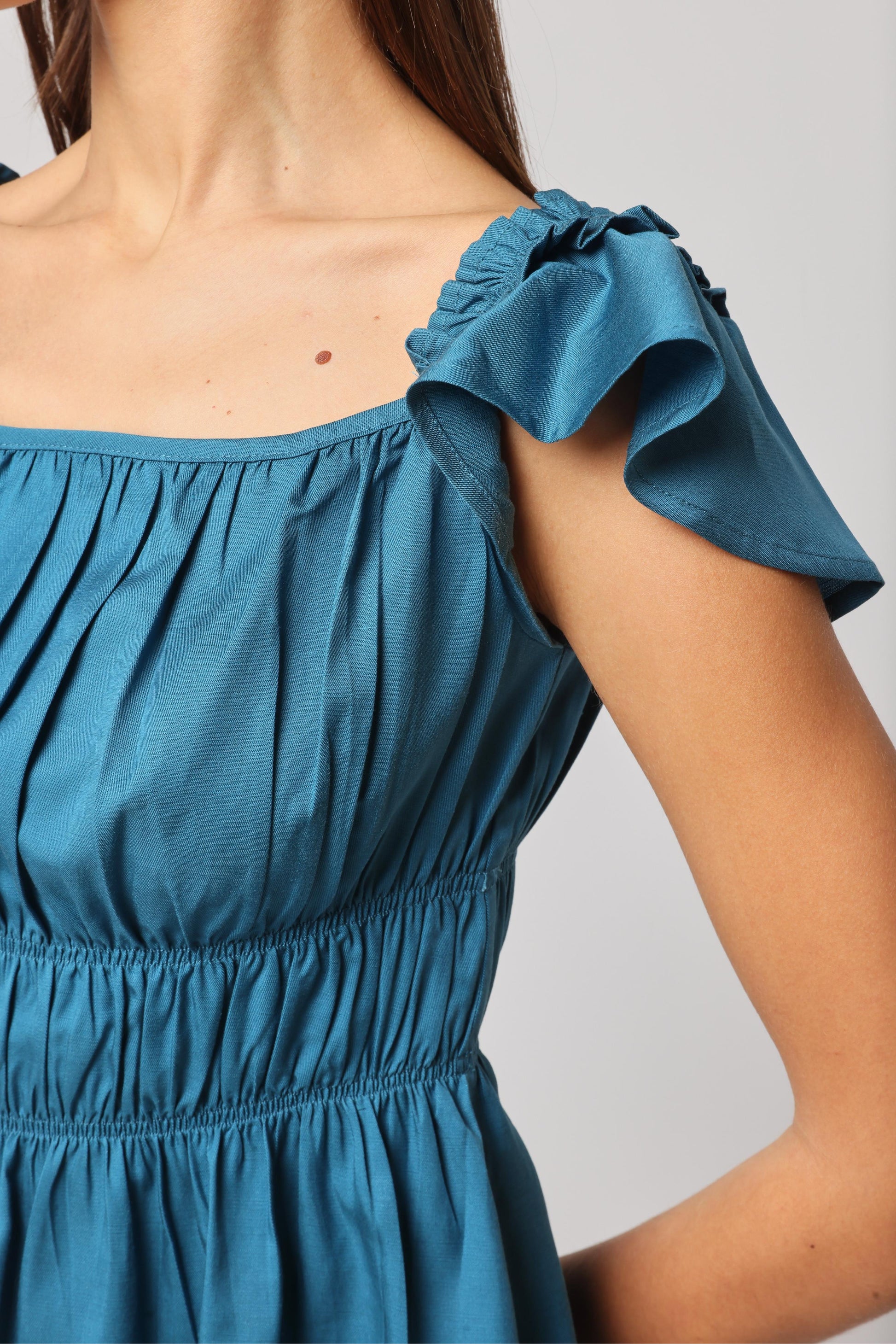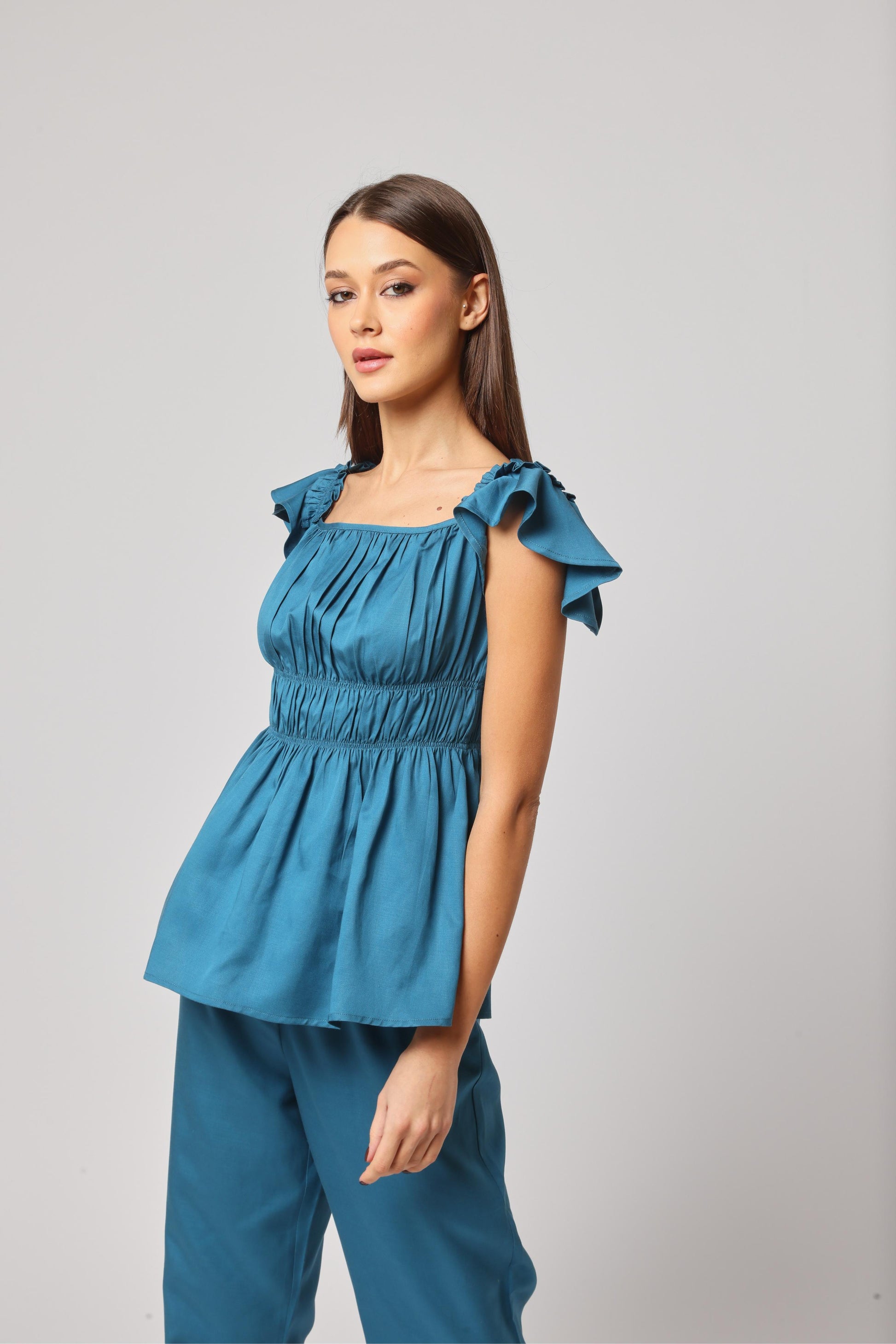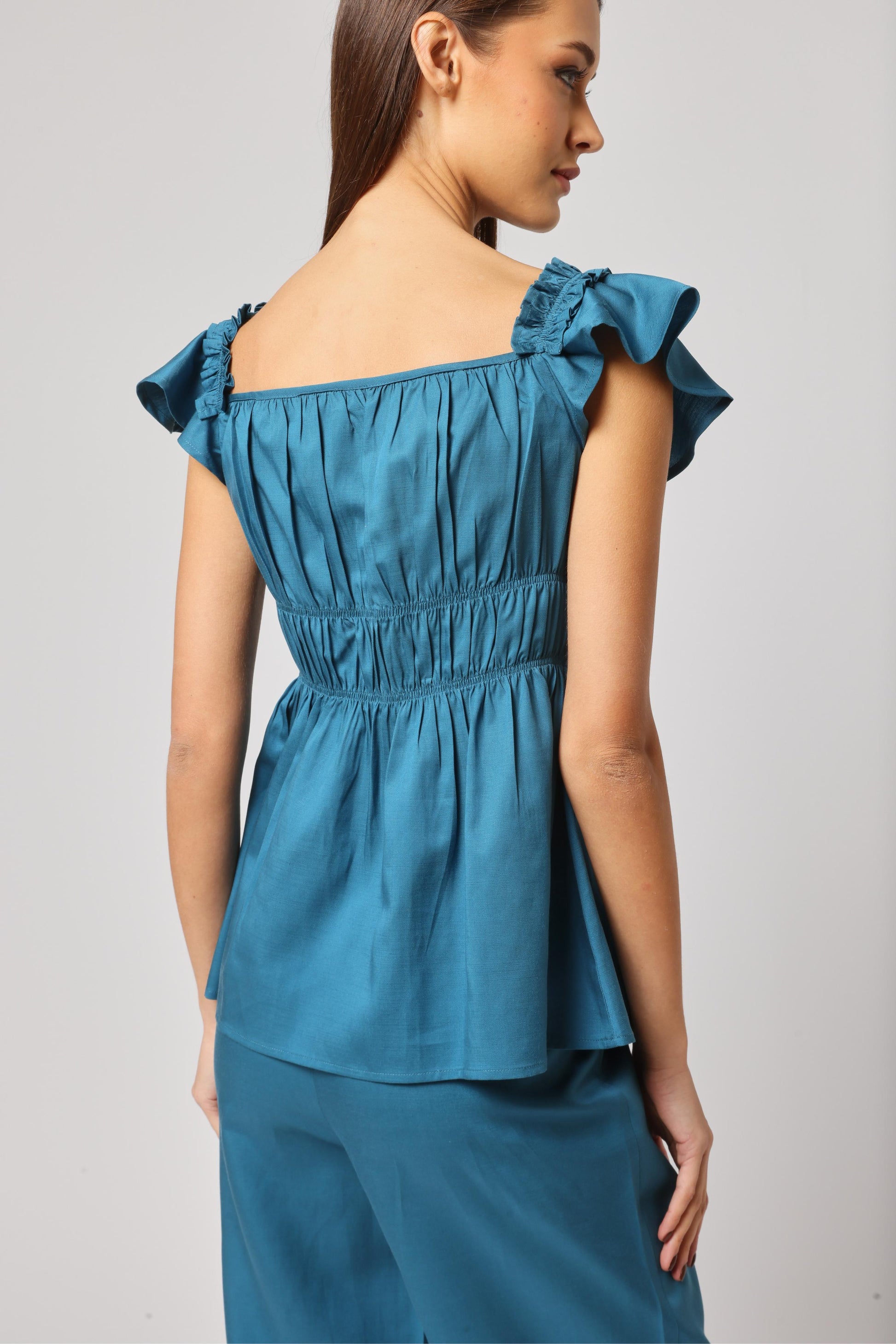 Neckline & Sleeves: A Soft, Gathered Neckline With Delicate Ruffle Sleeves Adds A Touch Of Femininity Fit & Silhouette: A Relaxed, Flowy Fit With A Peplum-Style Waist Creates A Flattering Drape. Fabric: Made From A Premium Linen Blend, Ensuring Breathability And Ease Of Movement. Perfect For Pairing With Wide-Leg Trousers, Denim, Or Skirts For A Versatile, Timeless Look.
