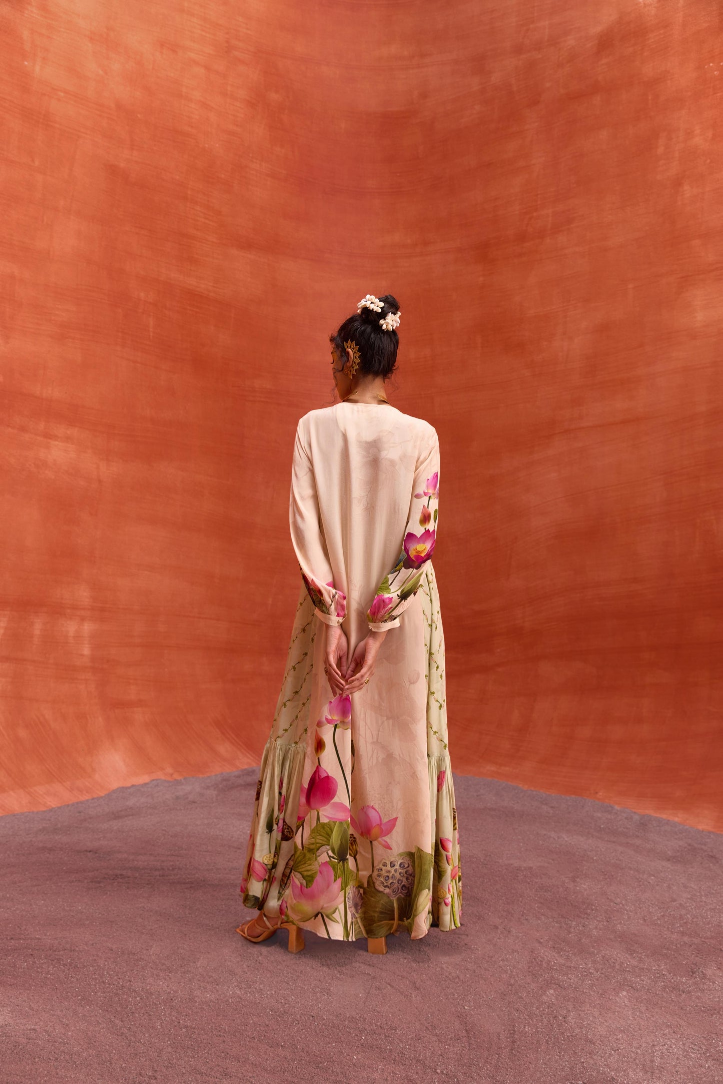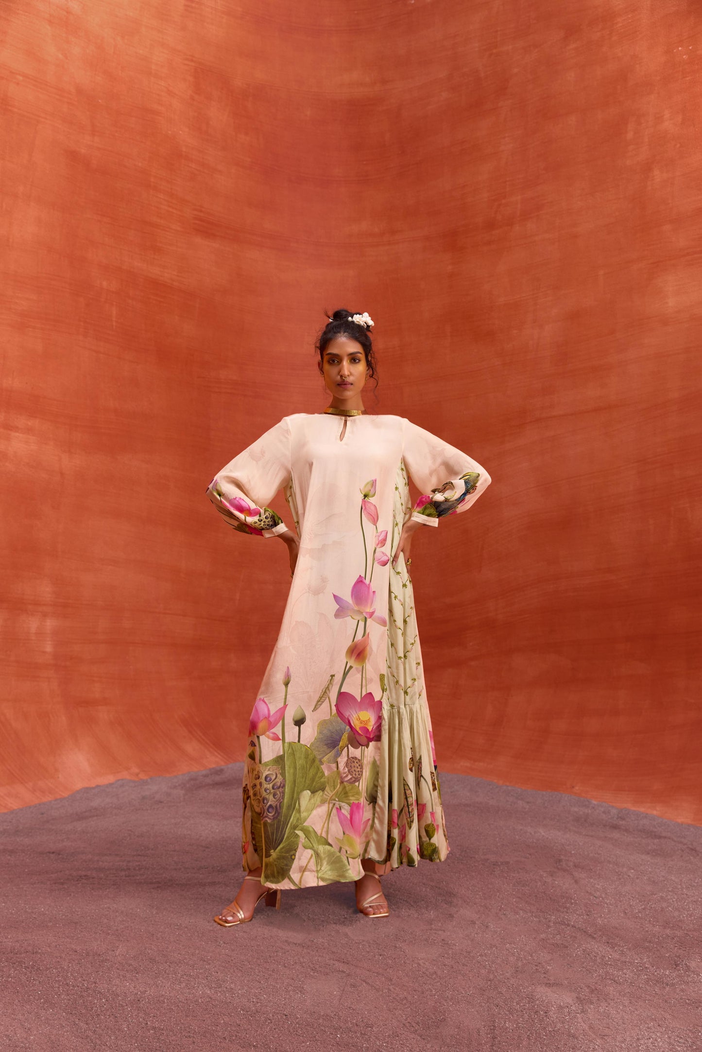 Featuring Melinda Midi Dress In Soft Floral Exudes Daisy Charm With V Shade Neckline And Loose Fit Sleeves. Adorned With A Touch Of Elegance In This Inflorescence Stylish Midi Dress, Perfect For Uber Chic Holiday Statement Look.