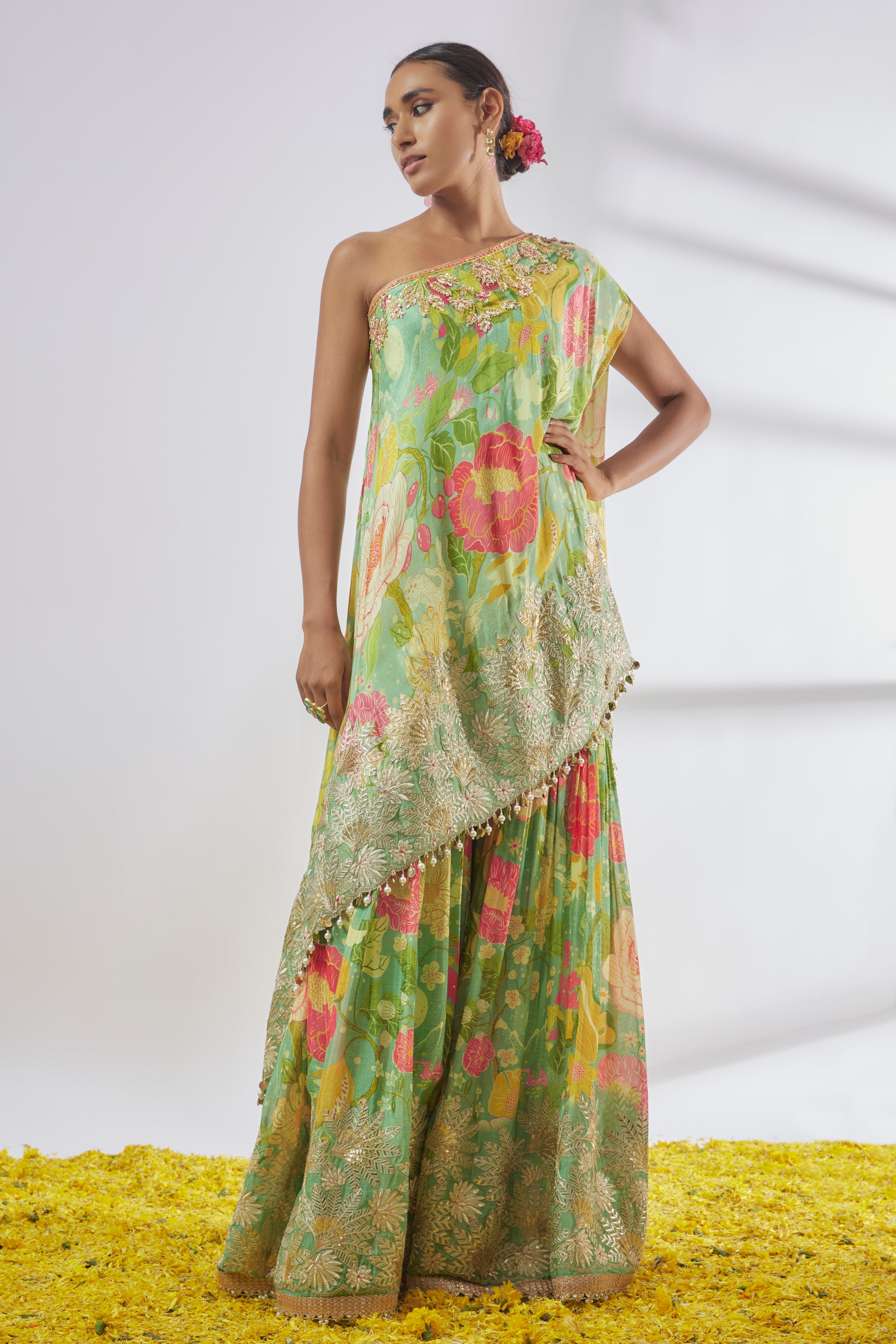 This Stylish Indo-Western Set Blends Bold Femininity With A Smart, One-Shoulder Top Paired With Sharara Featuring Delicate Embroidery. Tailored For Events, Providing The Versatility To Flow Seamlessly With Your Movements And Leave A Lasting Impression.