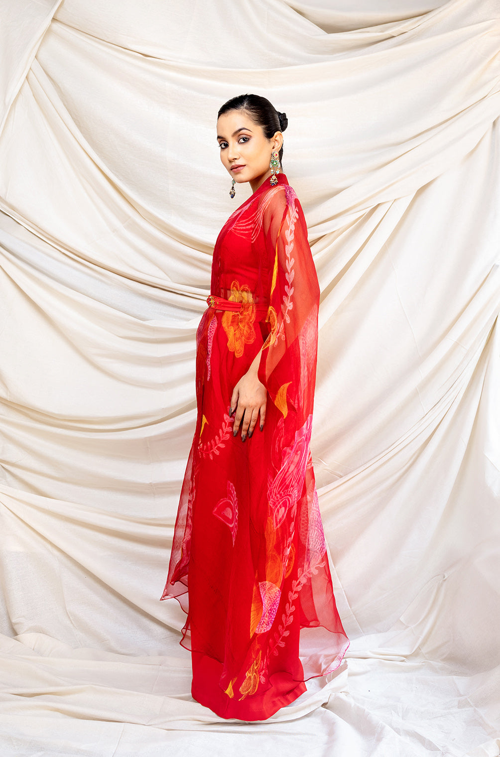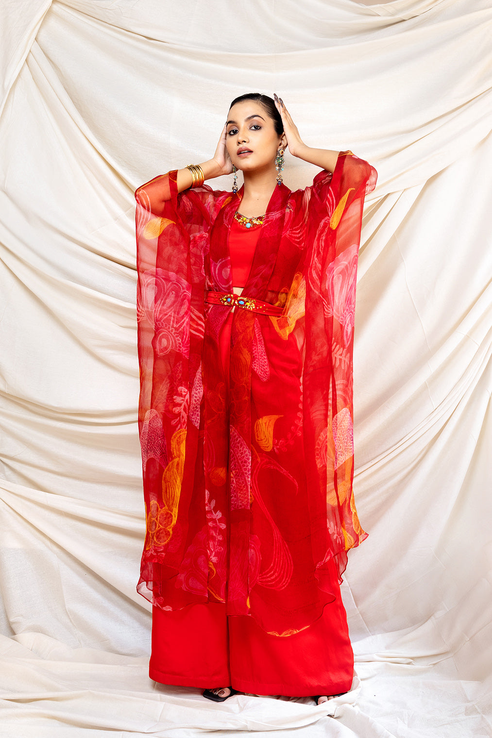 Elevate Your Style With This Crop Top, Palazzo, And Sheer Printed Cape Set, Featuring A Jeweled Look Belt. Hand-Embroidered With Colorful Stones And Metal Sequins, The Design Draws Inspiration From Crown And Temple Dome Motifs, Making It Ideal For Special Occasions.