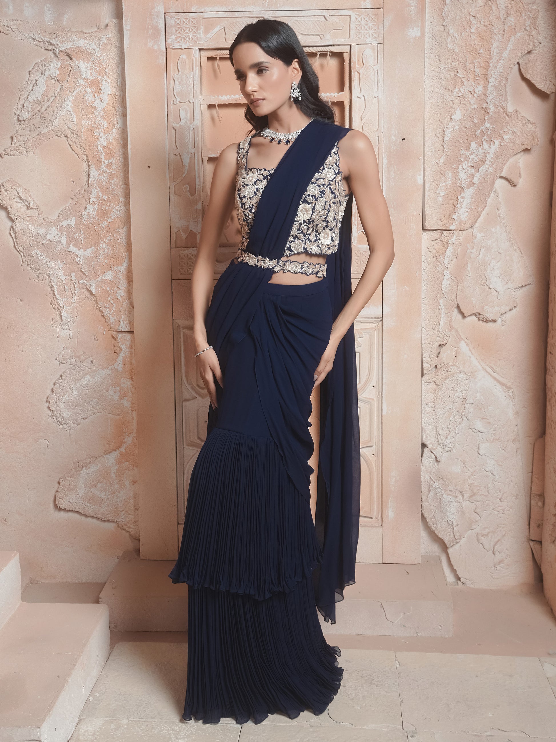 Navy Hand Embroidered Drape Saree Set.