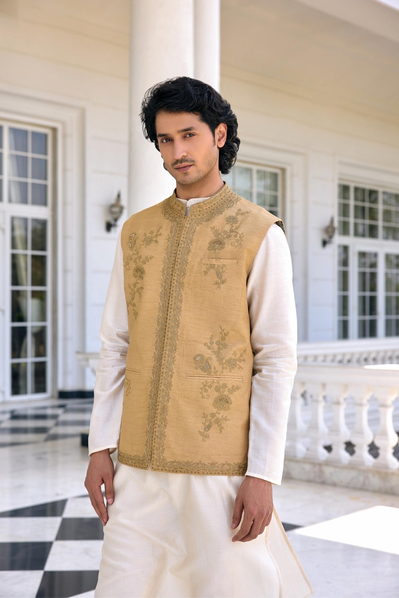 Ace The Ethnic Contemporary Look In Nazeer Bandi Set Featuring Exquisite Textured Zari Work On Neckline And Placket, Paired With A Contrasting Kurta And Churidar. This Ensemble Is The Perfect Blend Of Tradition And Sophistication, Perfect For Soft And Subtle Look.