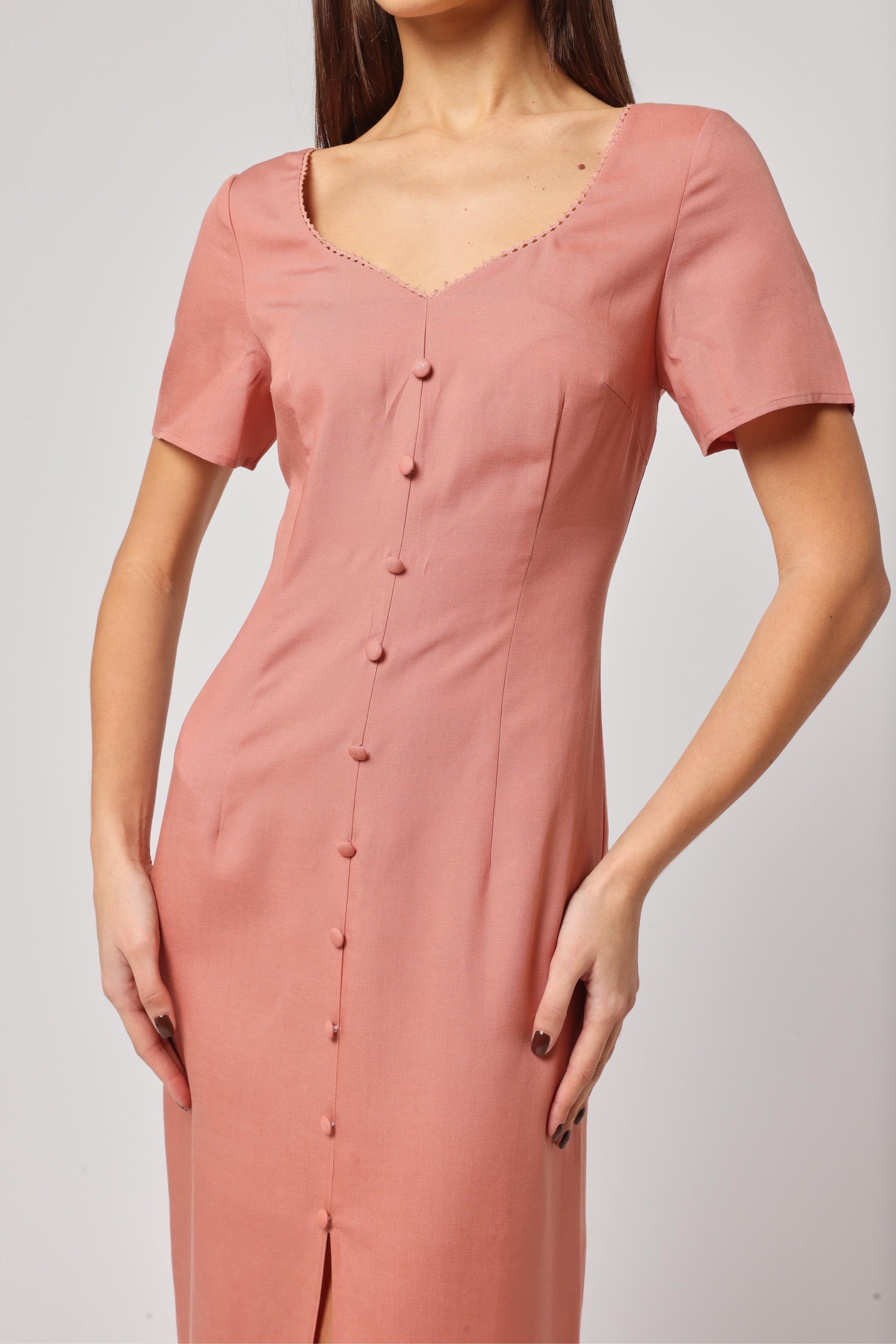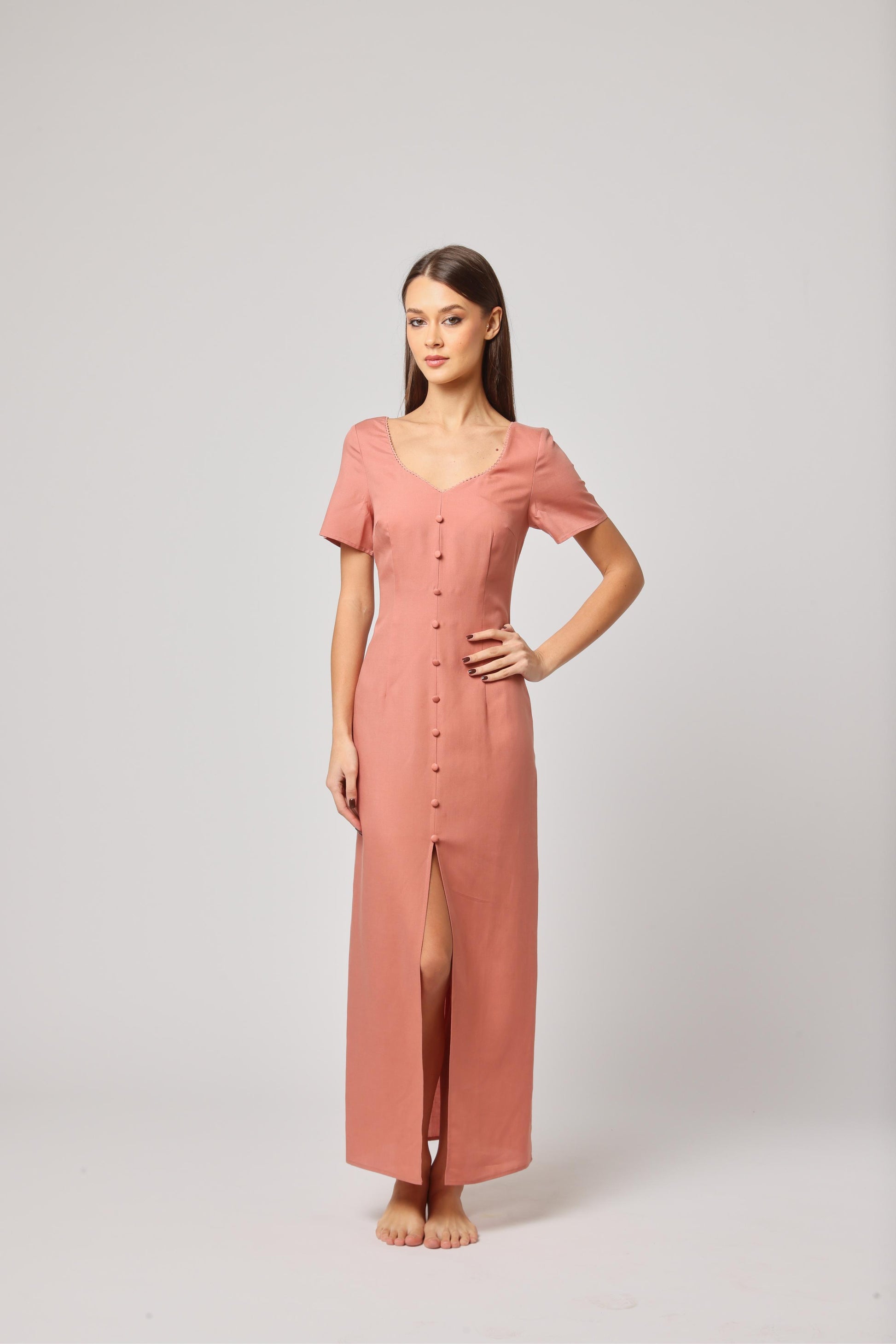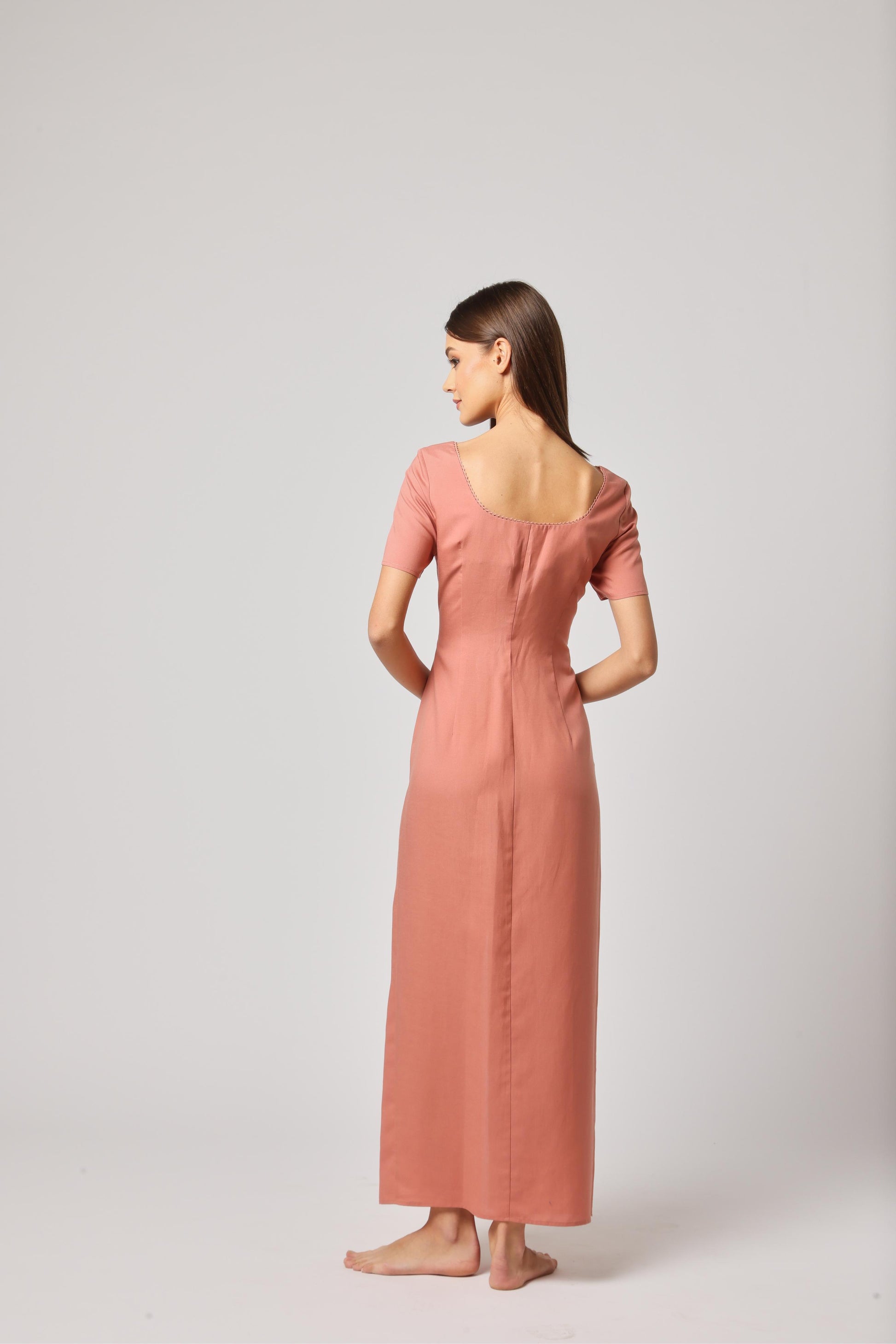 The Nazm Set Features A Midi-Length Button-Down Silhouette Designed To Sculpt Natural Curves While Maintaining Relaxed Elegance. A Soft Scoop Neckline And Delicate Short Sleeves Enhance The Feminine Touch, While A Refined Front Slit Adds Effortless Movement. Handcrafted Linen-Covered Buttons Embody Artisanal Sophistication, Making This Ensemble Truly Special.