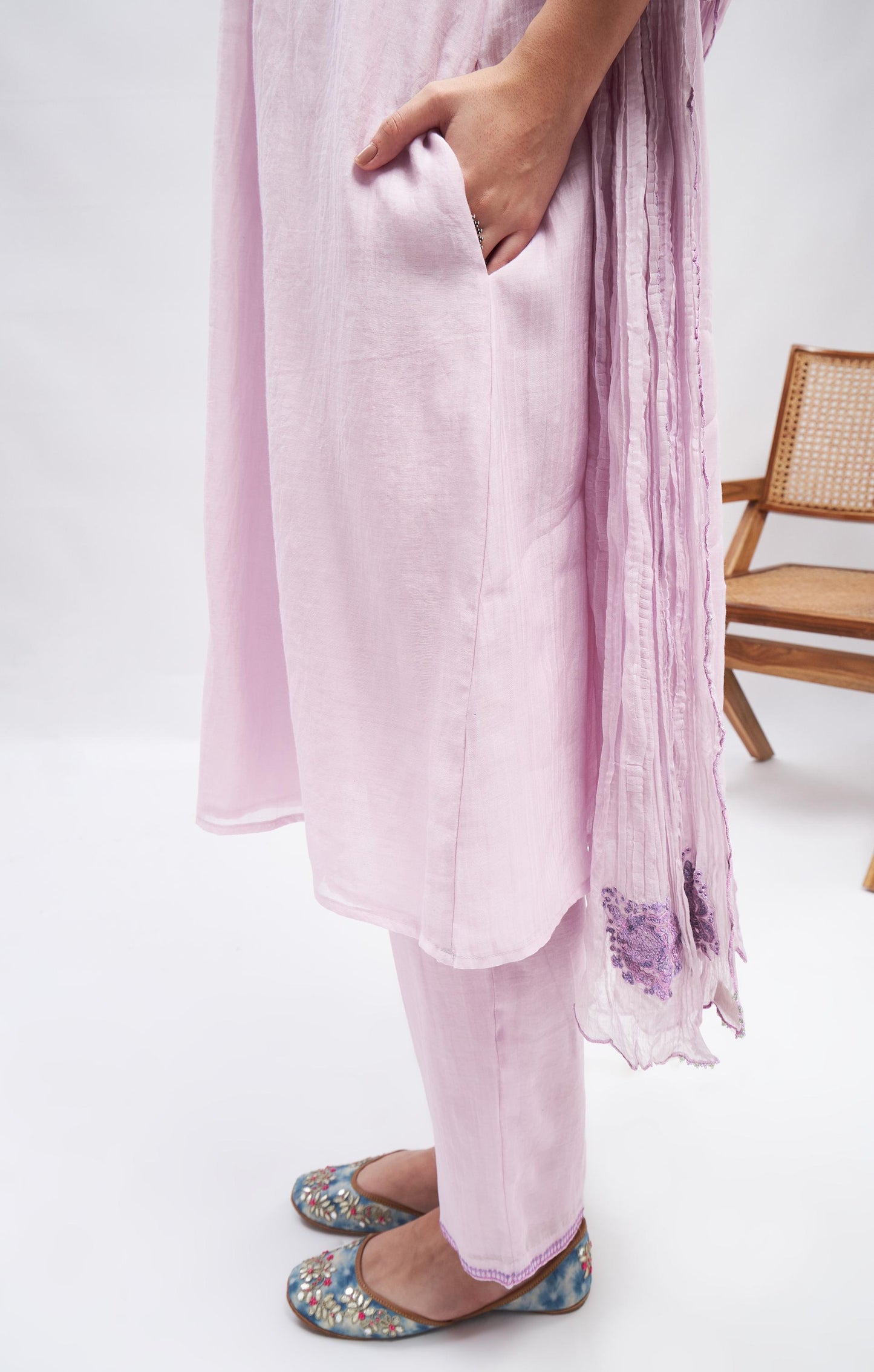 Lilac Kurta Set With Tonal Pants And Dupatta. Lilac Chanderi Kurta Set With Tonal Pants And Dupatta. The Kurta Set Comes With Fine Mulmul Lining And Beautiful Floral Motif Embroidery.