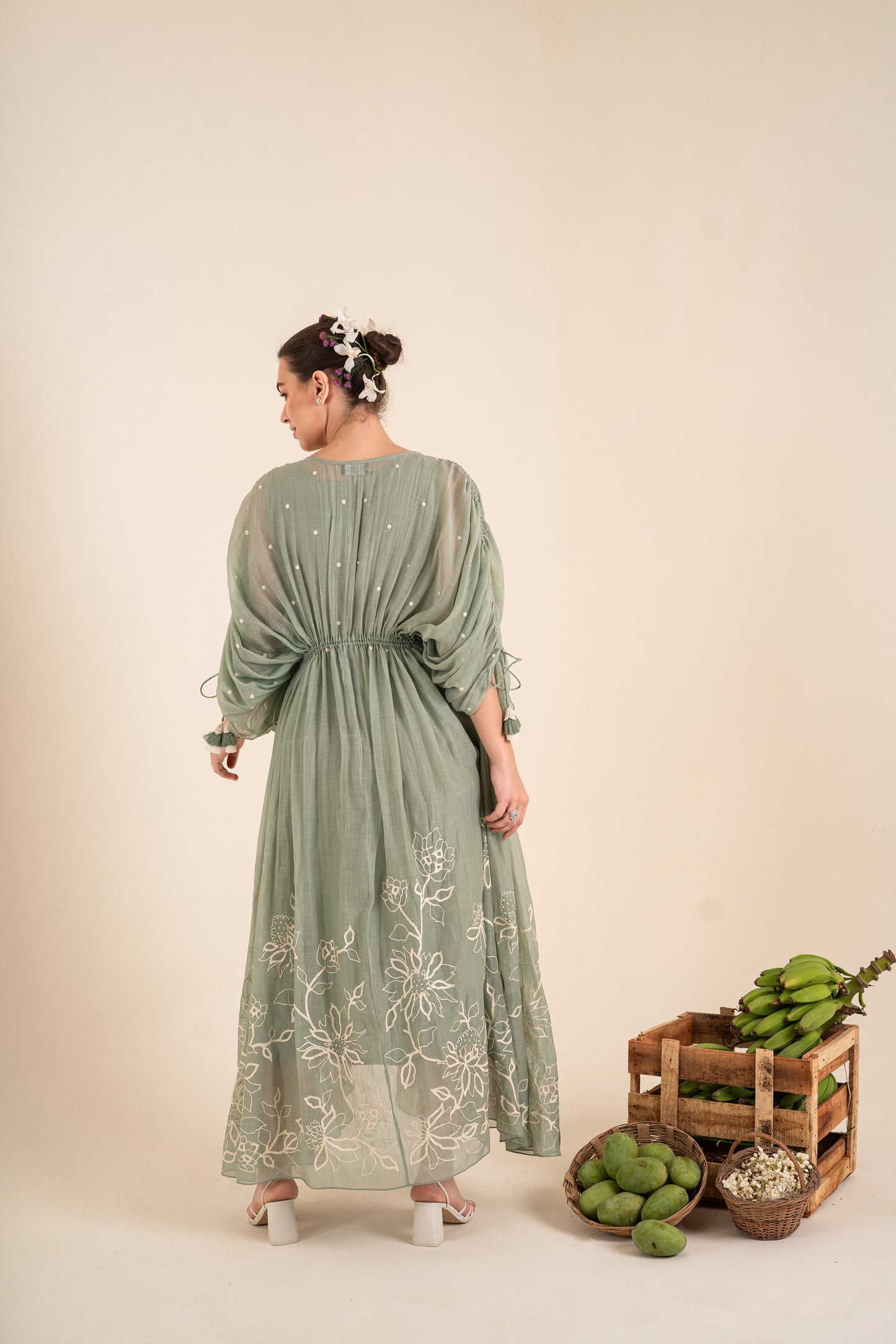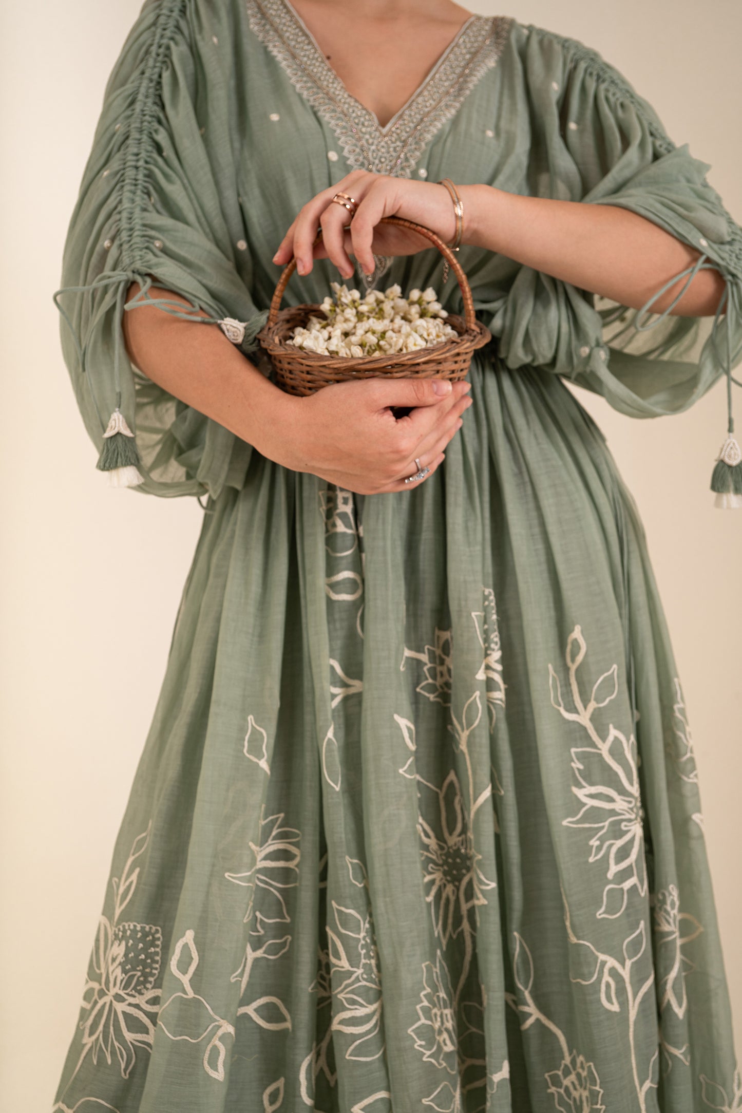 An Ocean Blue Tie Up Kaftan With Beautiful Tassels Detailing And Comes With An Inner. Kaftan Is Embellished With Aari Work And Hand Highlighted.