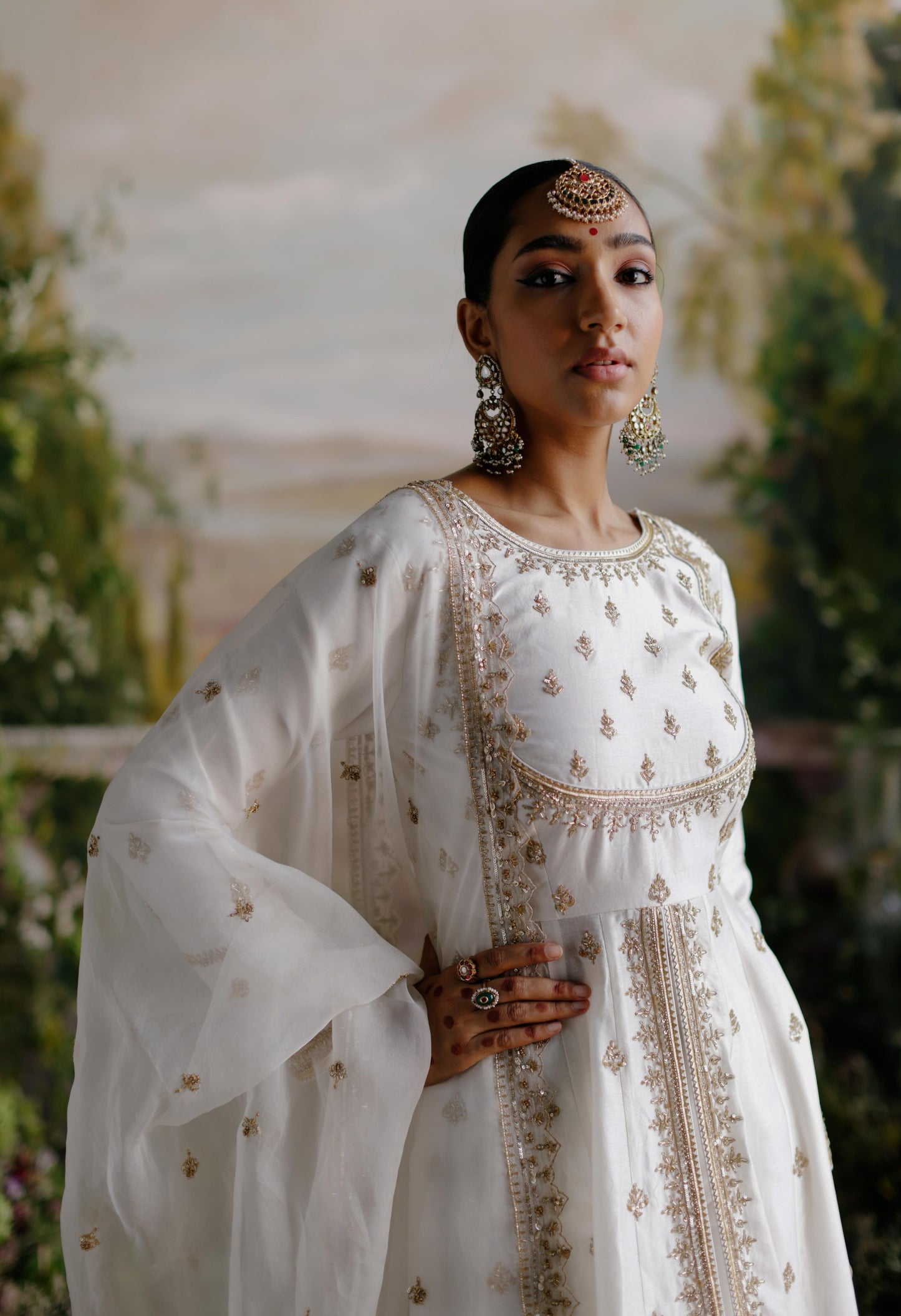 Crafted With Intricate Aari Embroidery And Delicate Motifs, The Jacket Pays Homage To The Rich Tradition Of Indian Craftsmanship. The Soft Off-White Hue Exudes A Sense Of Purity And Grace, Making It A Versatile Piece That Radiates Sophistication. Accompanying The Jacket Is An Organza Base Dupatta, Embellished With Antique Gold Dori That Adds A Touch Of Vintage Allure. Whether It'S A Wedding, A Cultural Event, Or A Celebratory Gathering, The Off-White Jacket Set Will Ensure You Radiate Timeless Elegance With A Modern Touch.