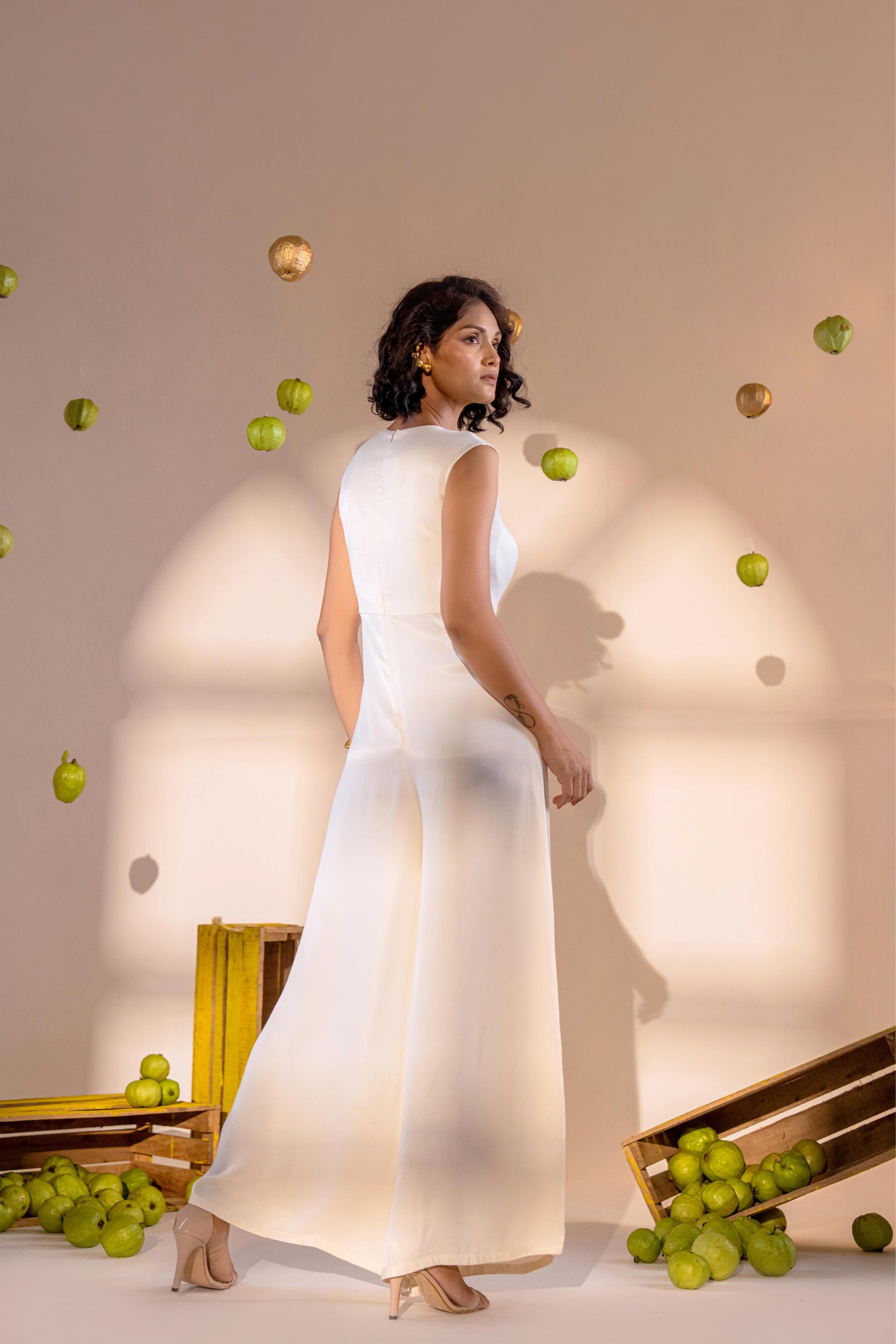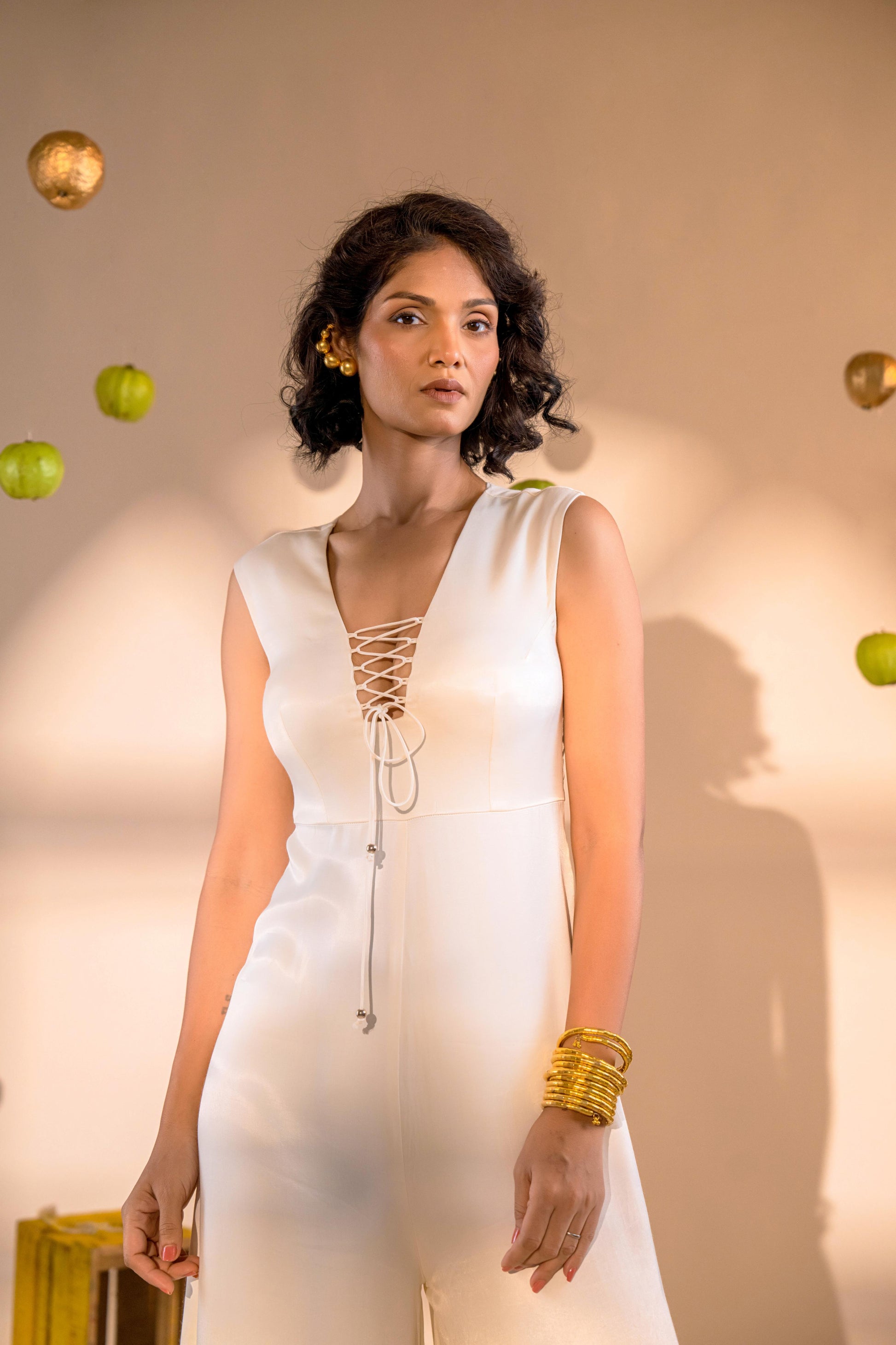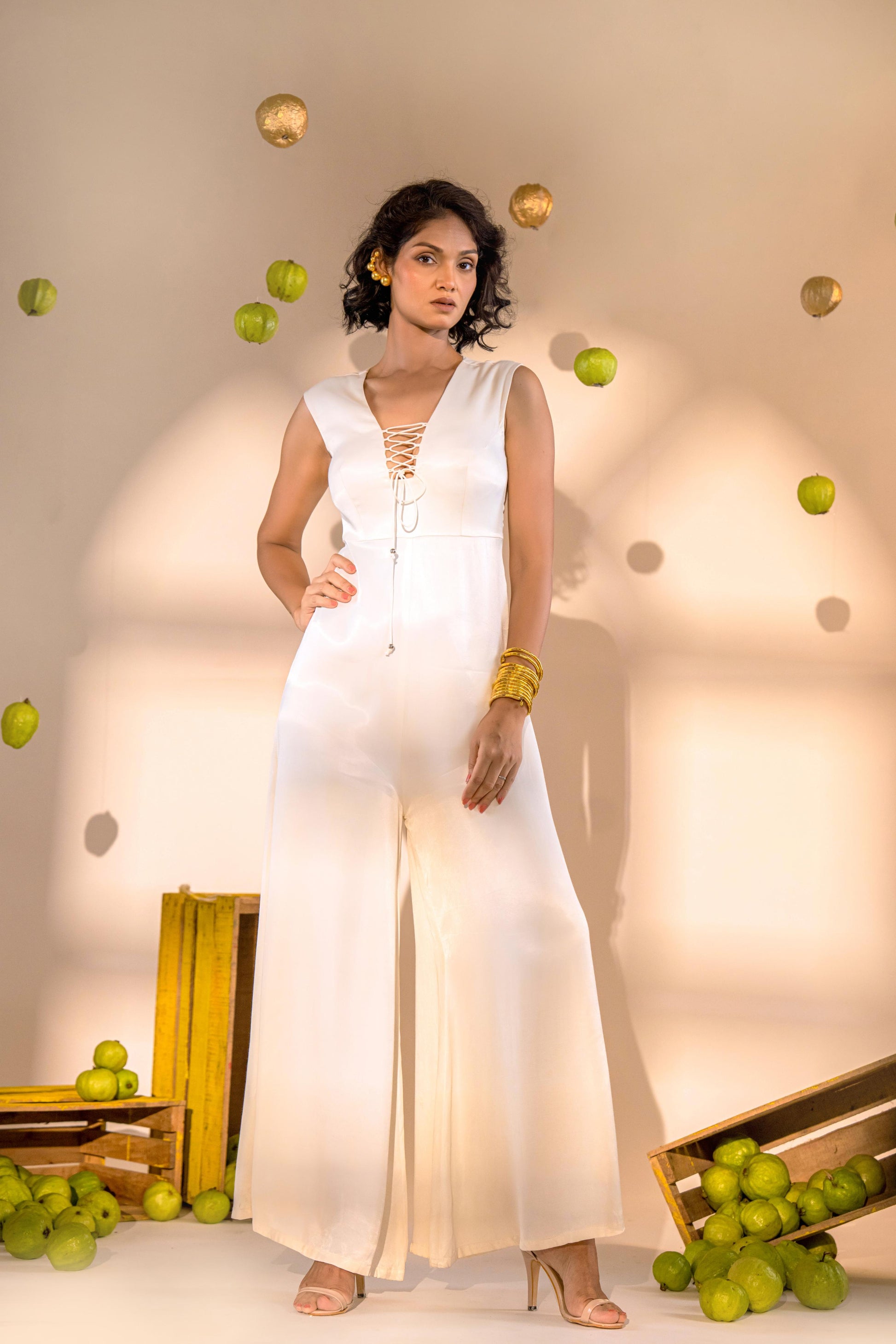 Step Up Your Style With This Off-White Jumpsuit Featuring A Chic Front Tie Detail.