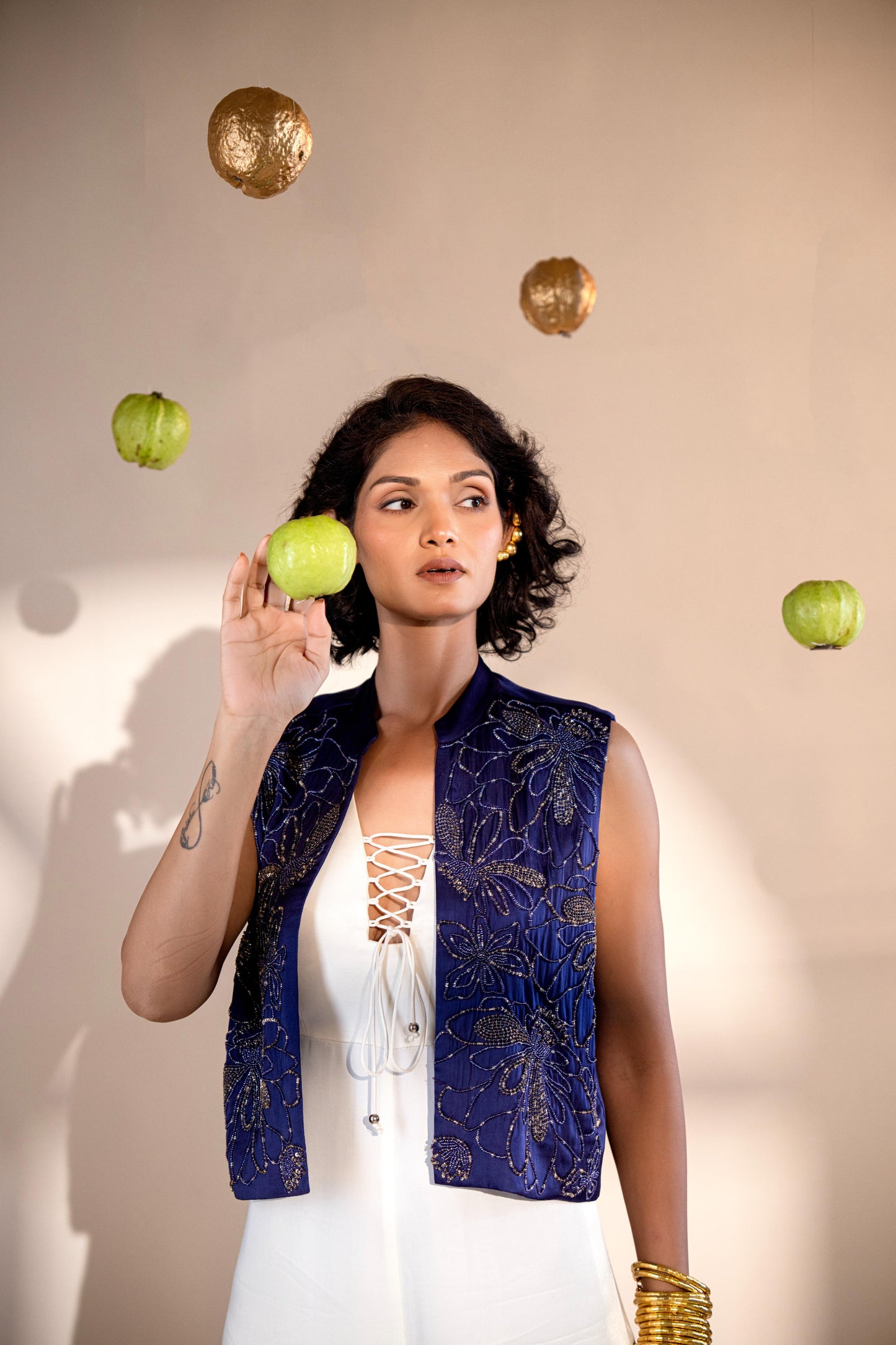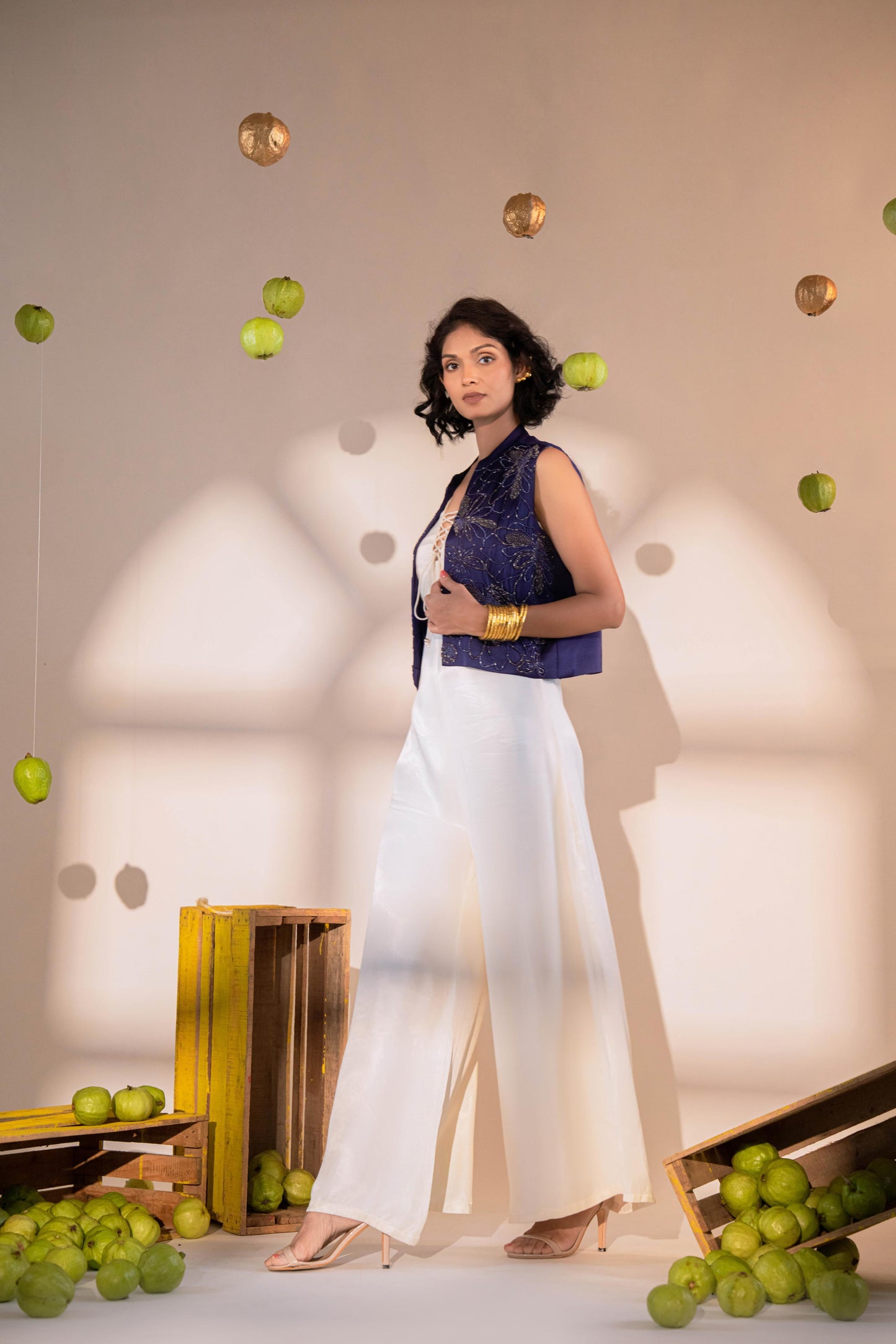 Step Up Your Style With This Off-White Jumpsuit Featuring A Chic Front Tie Detail. Paired With A Sleeveless Embroidered Jacket, It's Perfect For A Modern, Elegant Look.