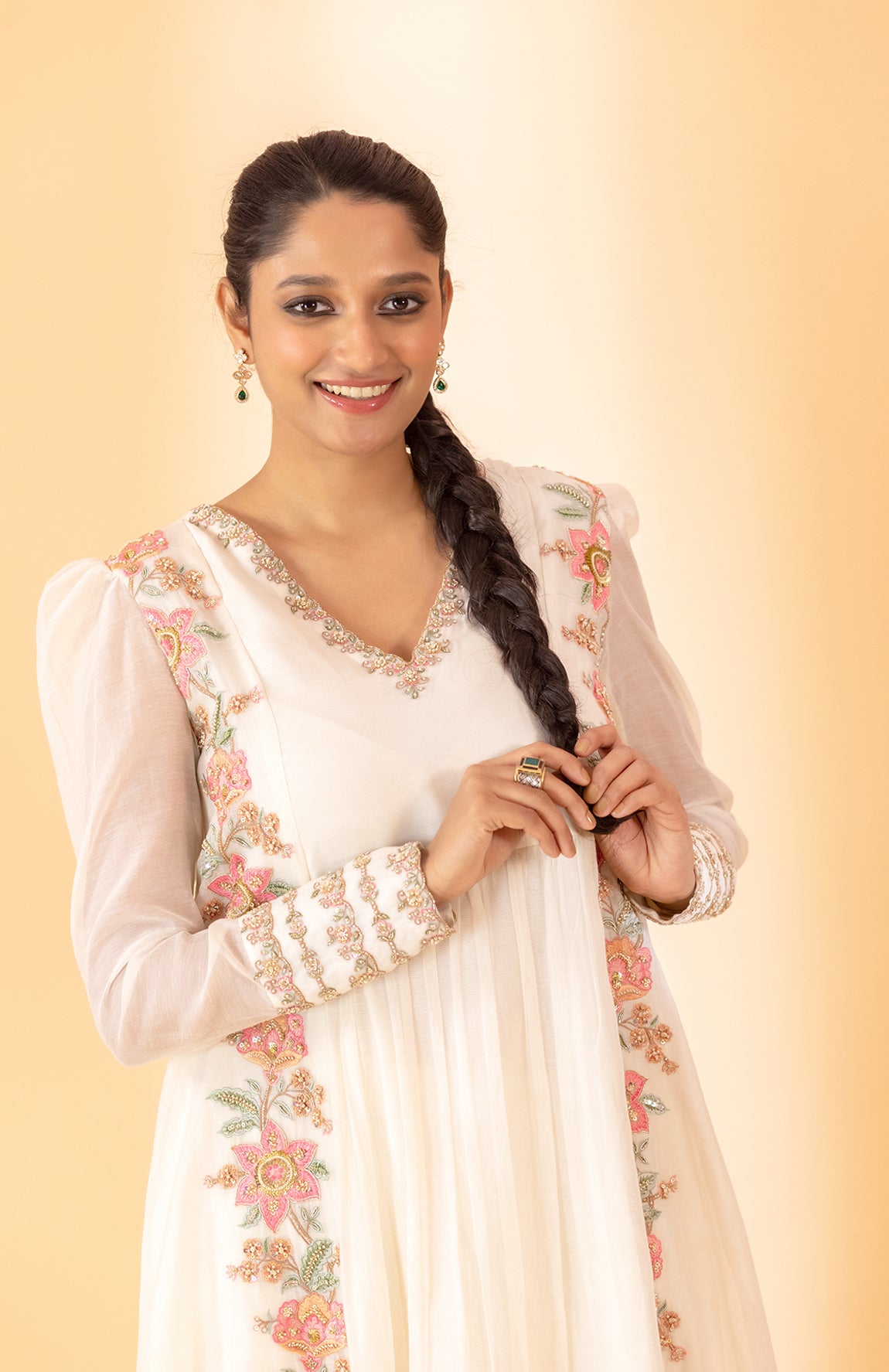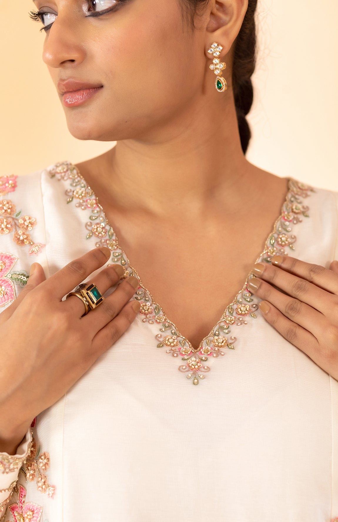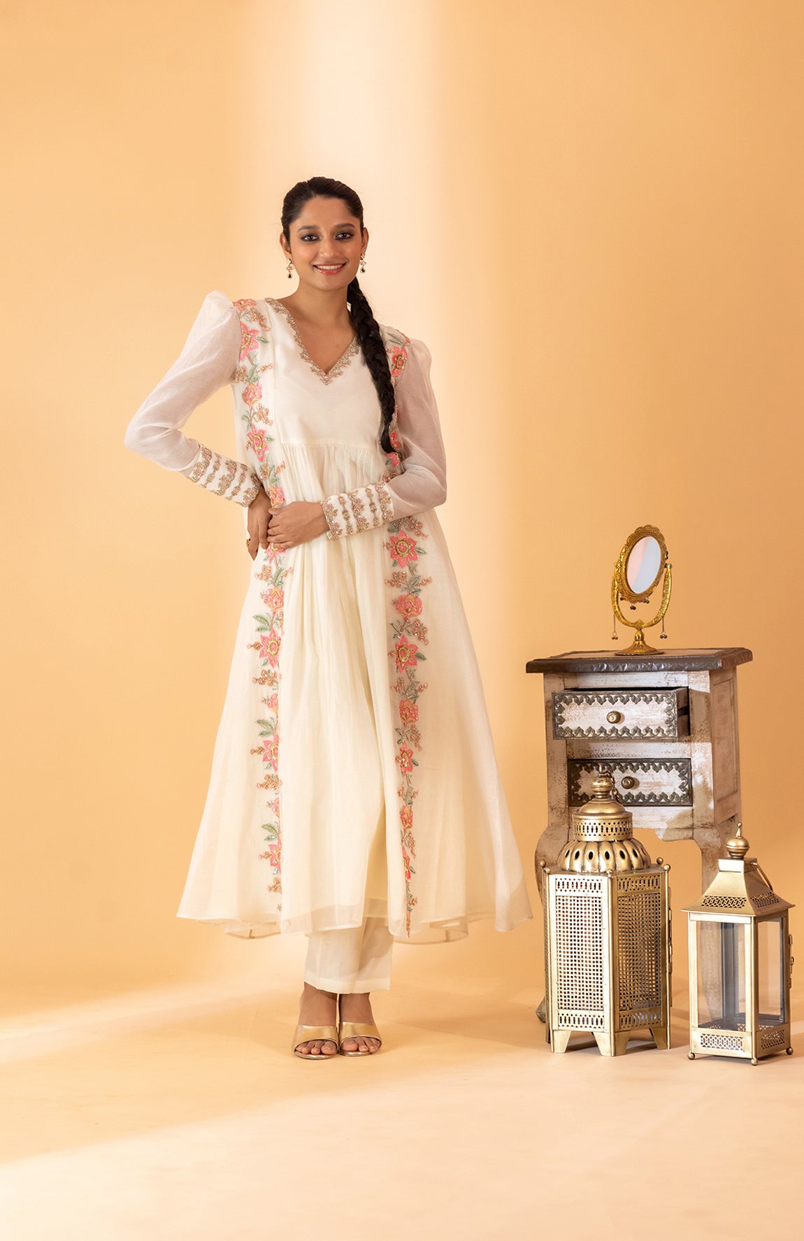 A White Kurta Set With Thread Work And Hand Embroidery, Paired With Pants.