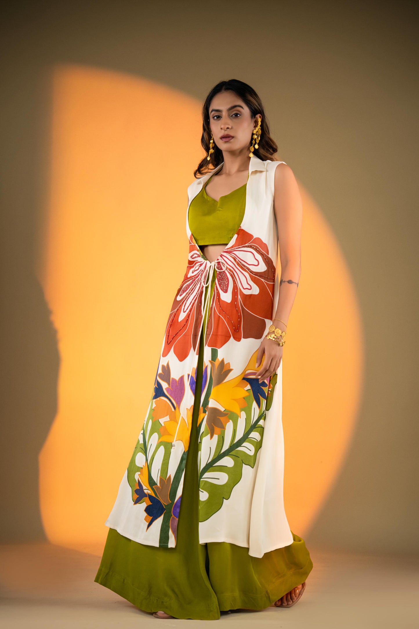 Enhance Your Style With This Off-White Kurta Set, Featuring Cut Sleeves, A Collared Design, And Tie-On Detailing. Adorned With Floral Embroidery, It Pairs Beautifully With Green Flared Pants For A Chic And Contemporary Look.