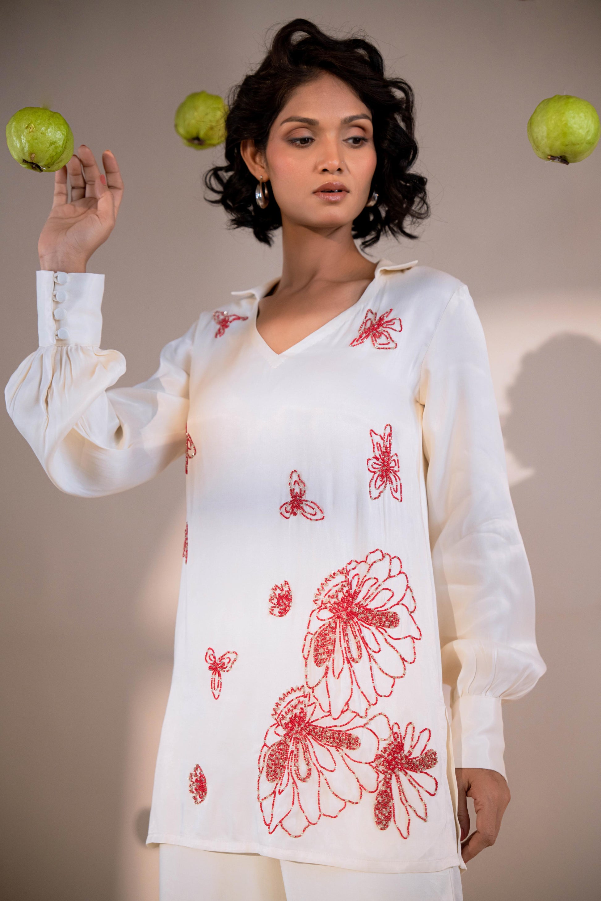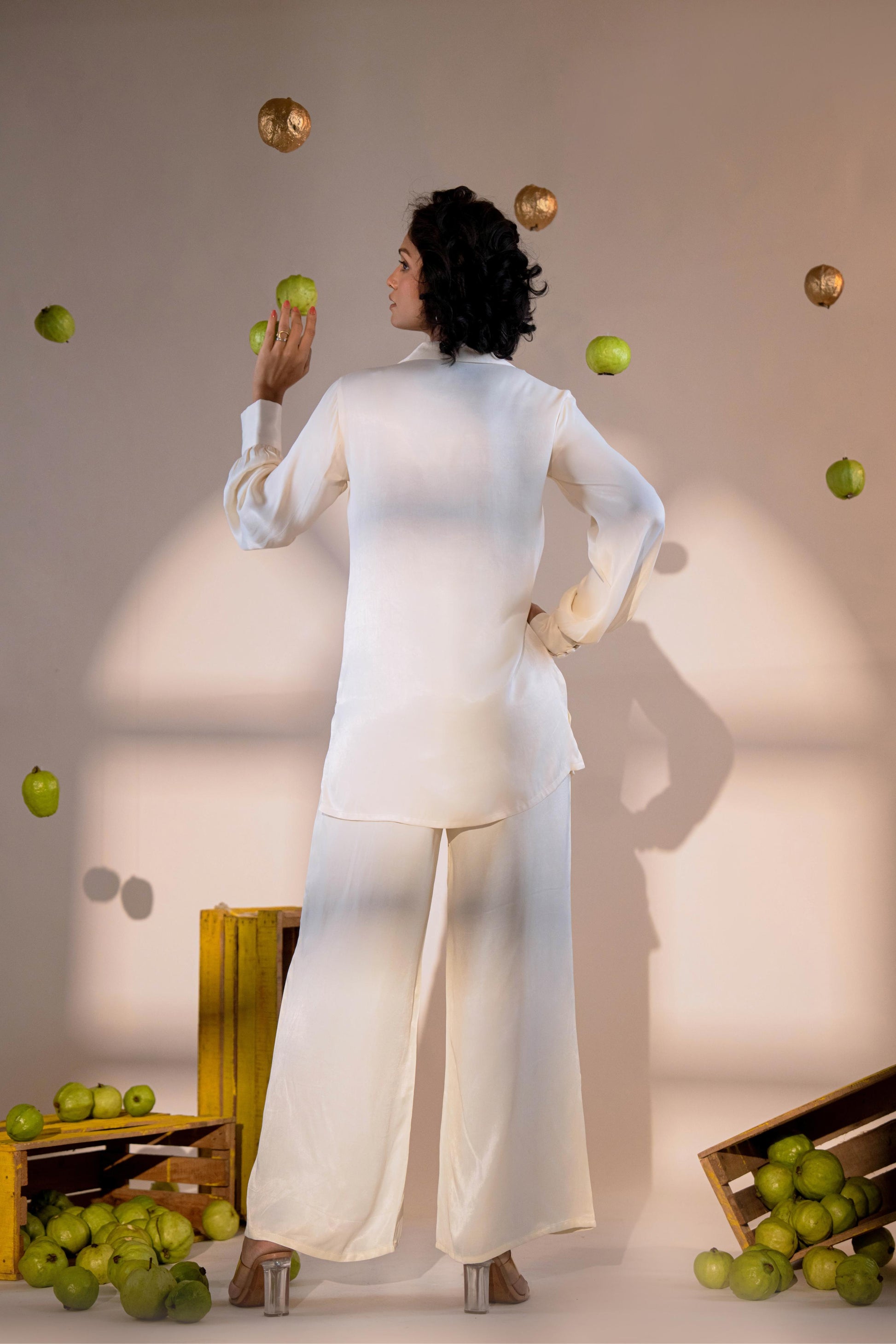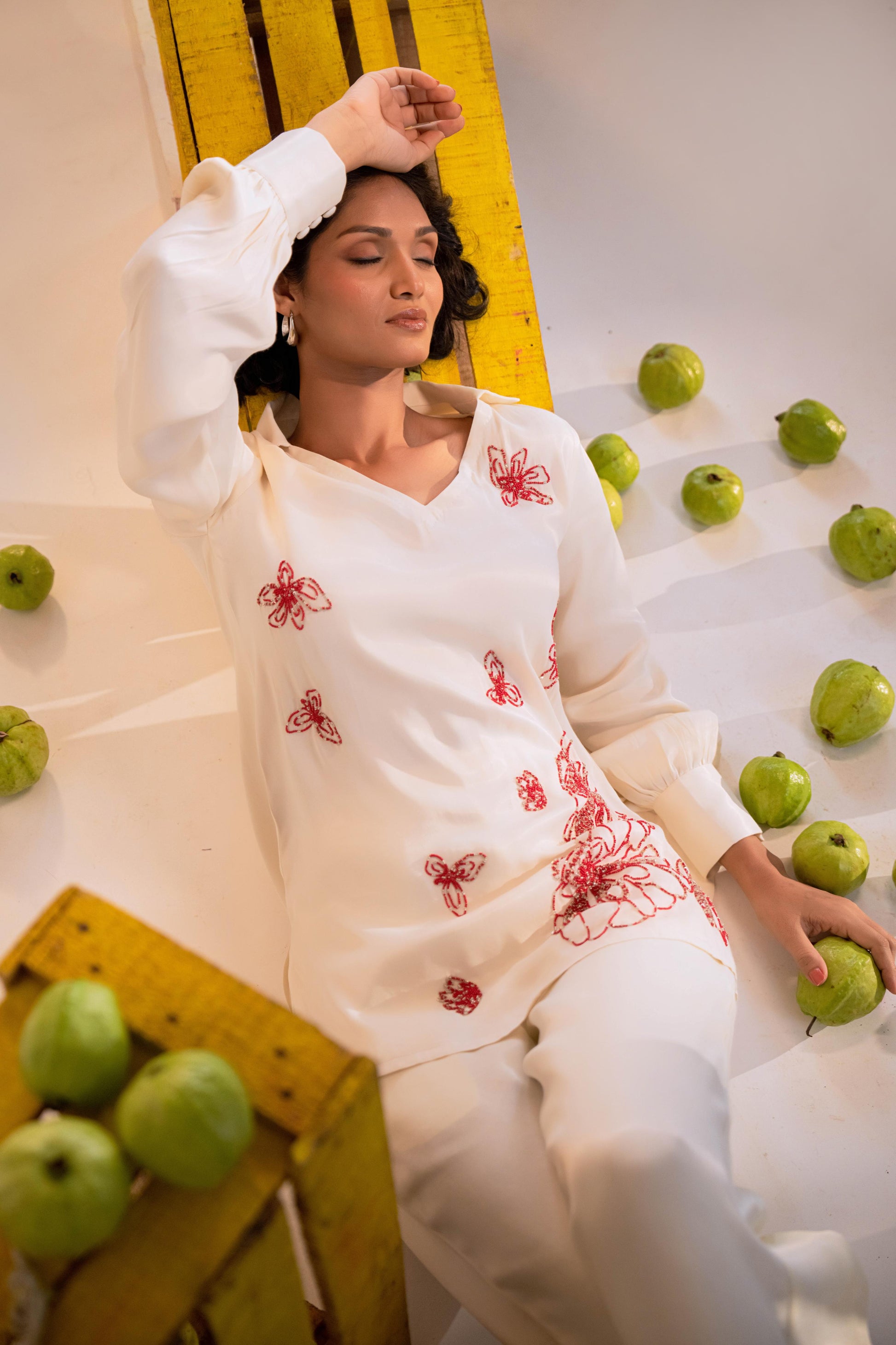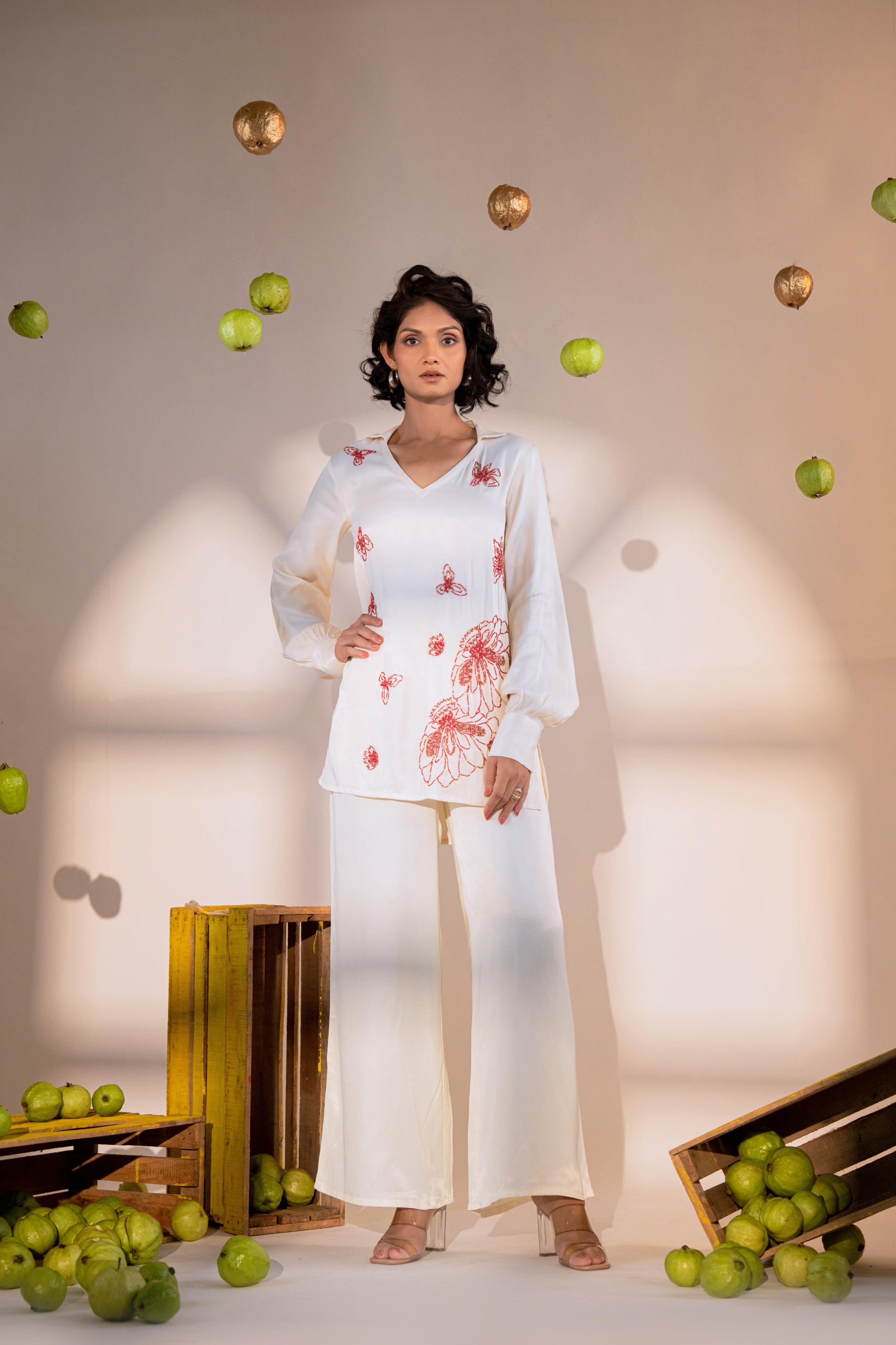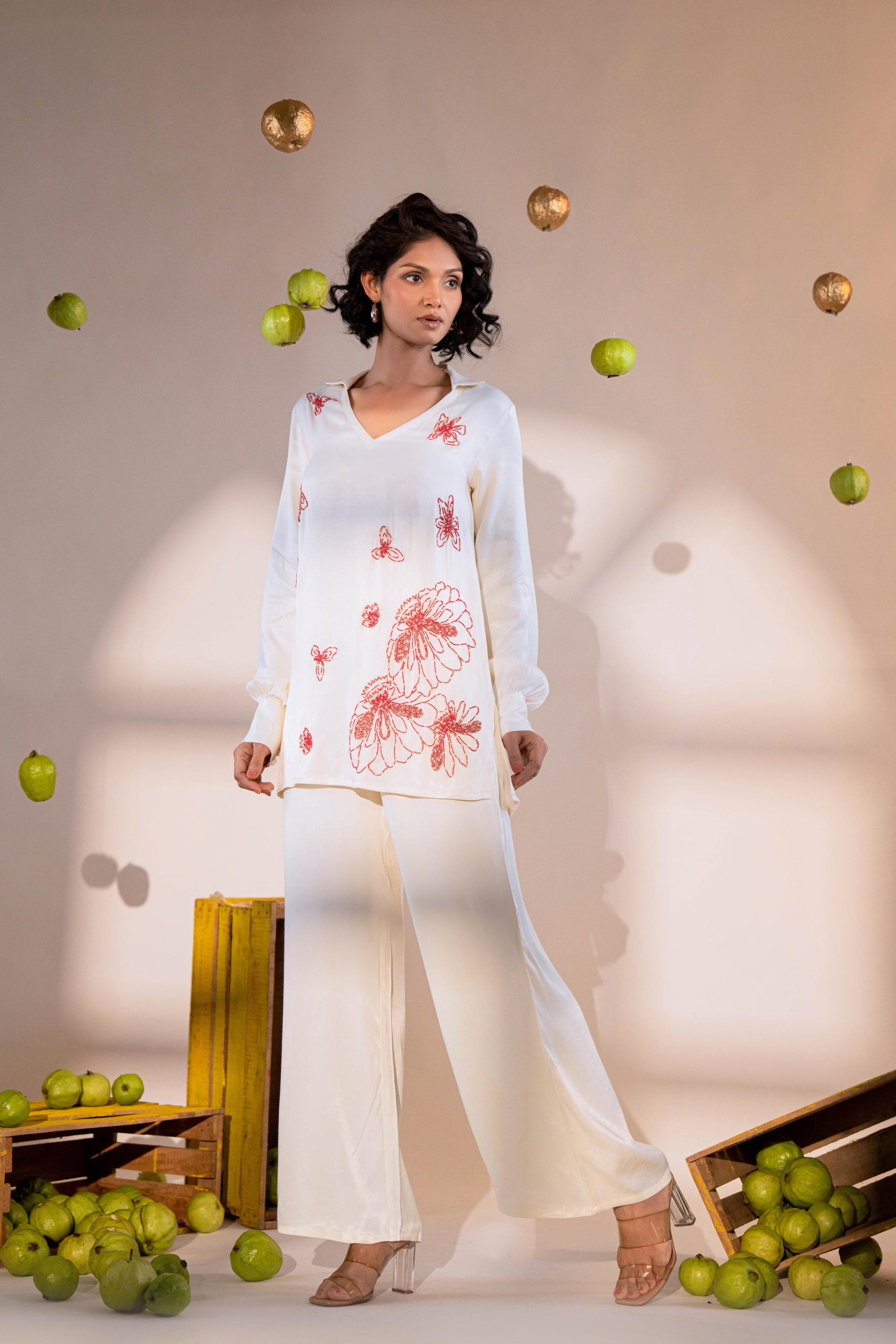 Exude Elegance In This Off-White Co-ord Set With Full Sleeves. The Top Features Beautiful Embroidery, Adding A Refined Touch To The Classic Color. Paired With Matching Bottoms, This Set Is Perfect For A Sophisticated And Stylish Look.