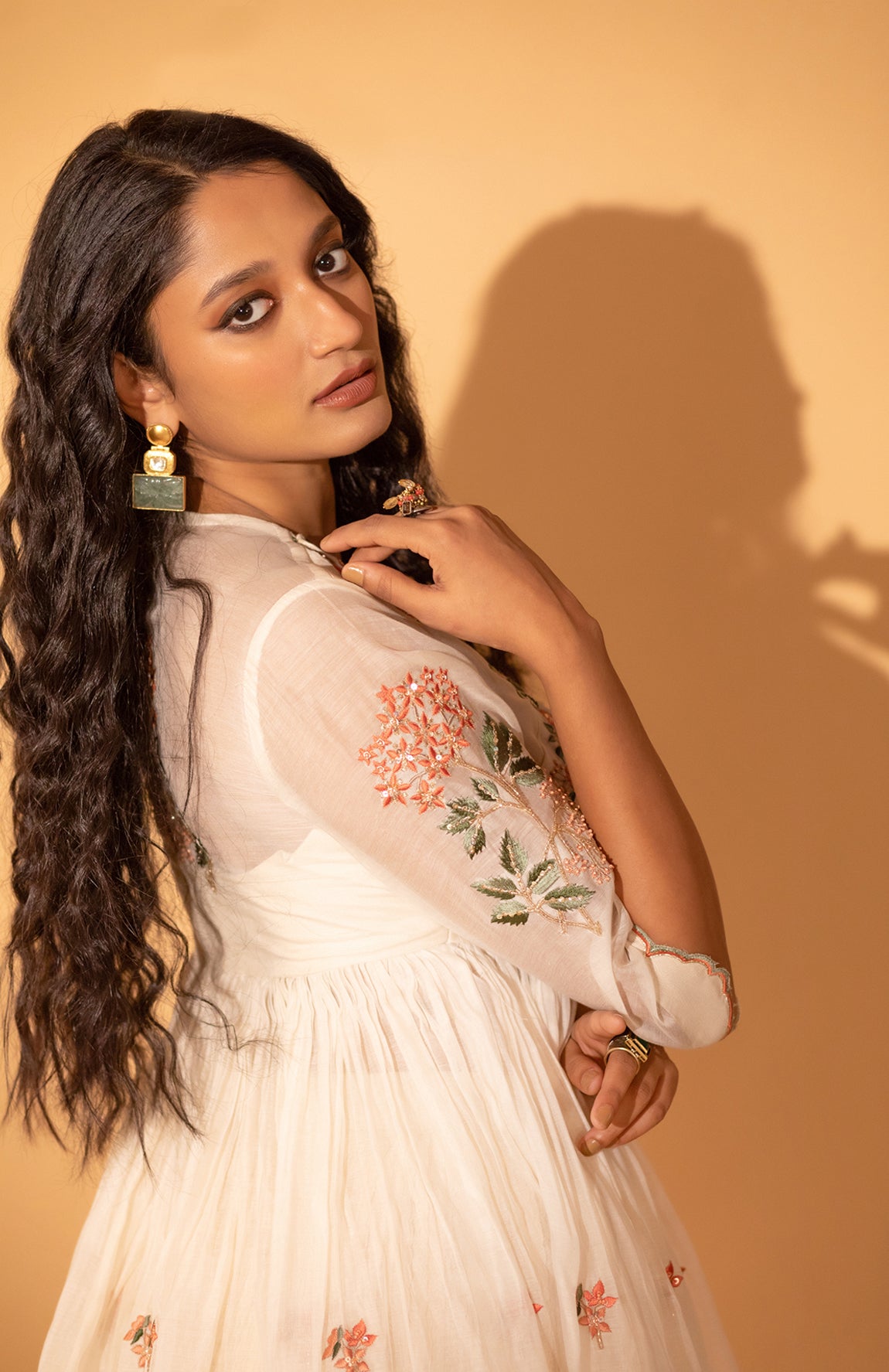 A White Skirt Set With Beautiful Thread Work Highlights And An Embroidered Peplum Finish, Paired With A Hand-Embroidered Scallop Dupatta.