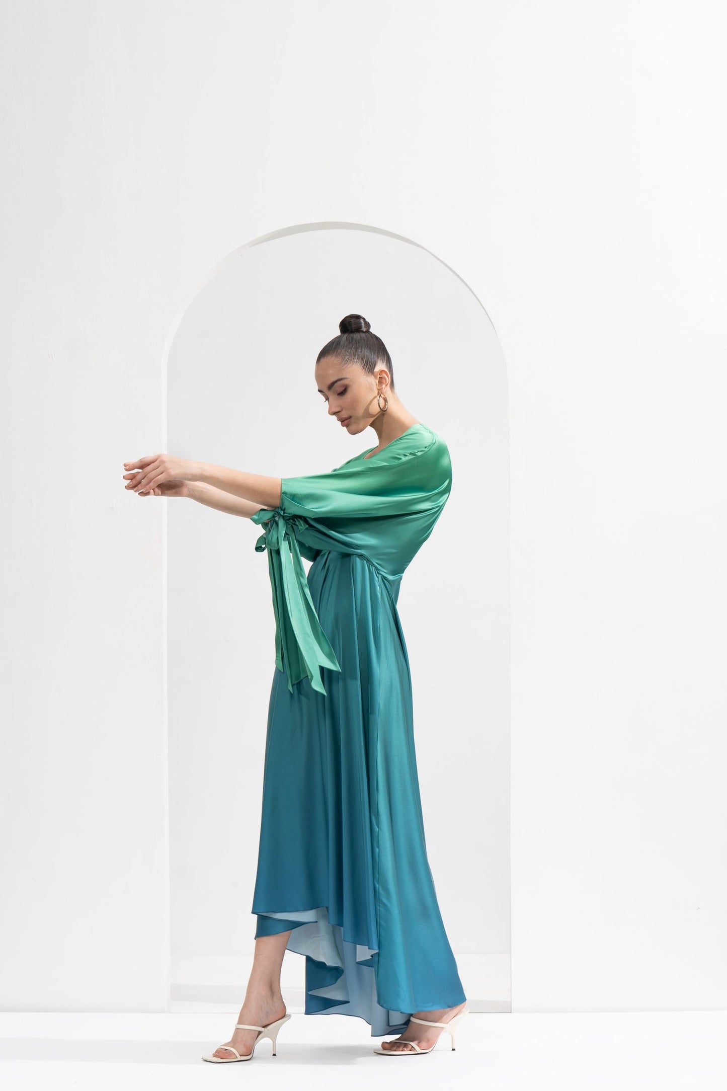Crafted From The Finest Satin, This Green-Blue Dress Boasts An Ombre Gradient Print That Adds A Touch Of Artistry And Allure. The Drapery And Flowy Silhouette Of This Dress Evoke A Sense Of Ethereal Beauty, While The High-Low Hemline Adds A Modern Twist To The Classic Design, Adding A Touch Of Drama. One Of The Most Charming Features Of This Dress Is Its Batwing Sleeves With Ties That Can Be Elegantly Styled Into Bows. These Sweet And Feminine Accents Add An Extra Touch Of Sophistication And Allow You To Customize The Fit According To Your Preference.