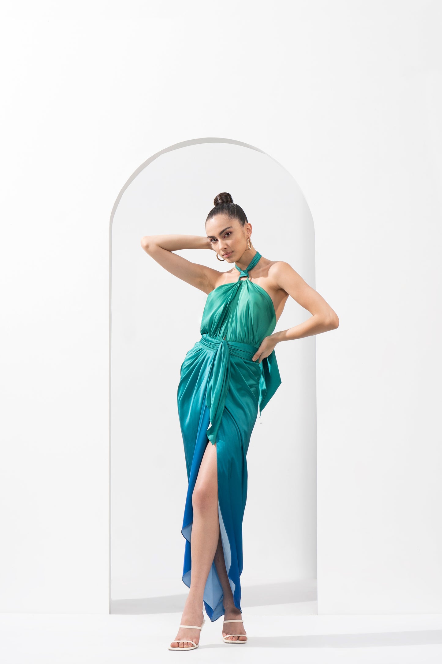 Crafted From The Finest Satin, This Green-Blue Dress Boasts An Ombre Gradient Print That Adds A Touch Of Artistry And Allure. The Standout Feature Of This Dress Is The Beautifully Designed Accessory Detail On The Neckline, Enhancing The Dress'S Elegance And Adding A Touch Of Glamour To Your Overall Look. The Draped Waist Accentuates Your Curves And Creates A Flattering Silhouette, Making You Feel Confident And Graceful.