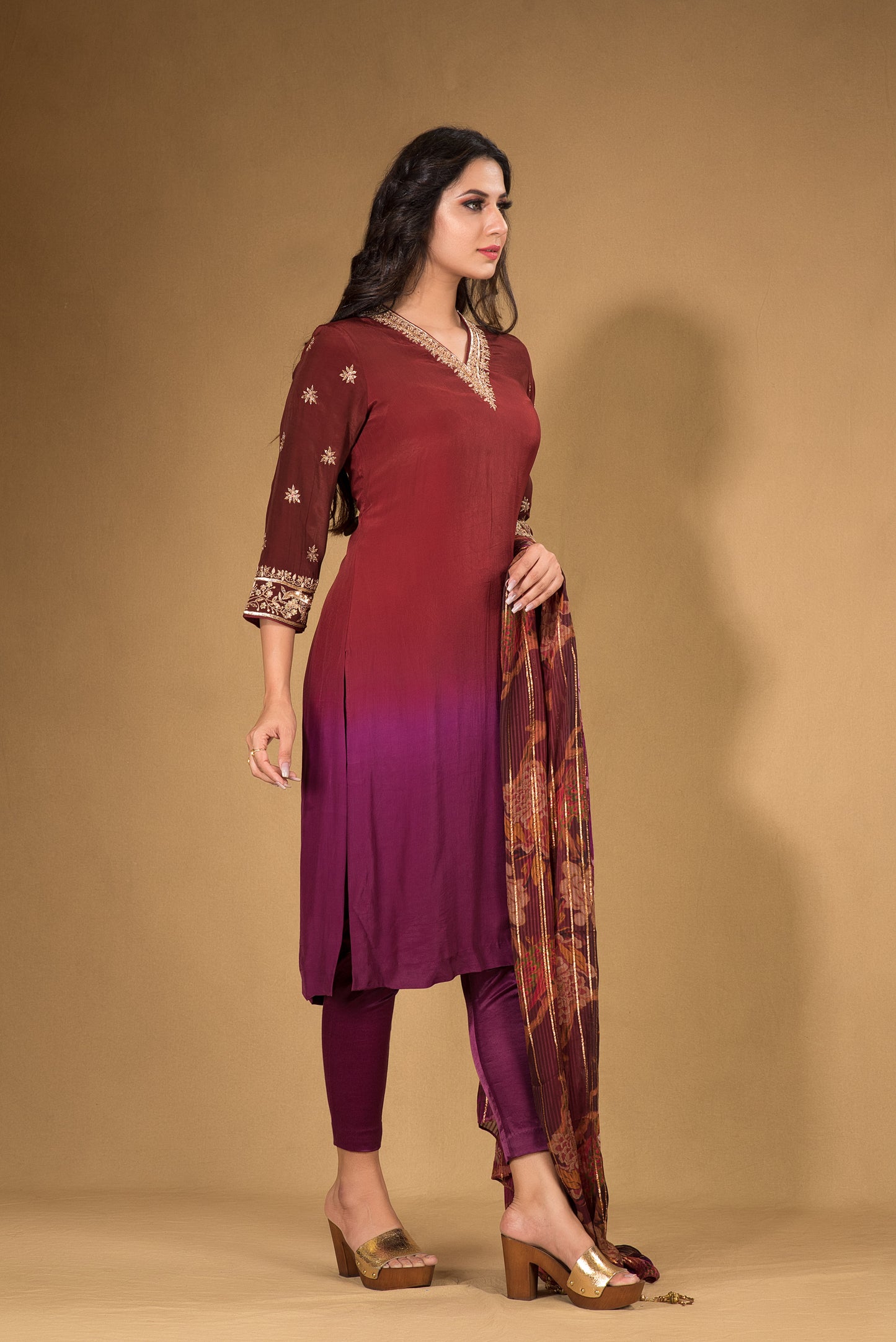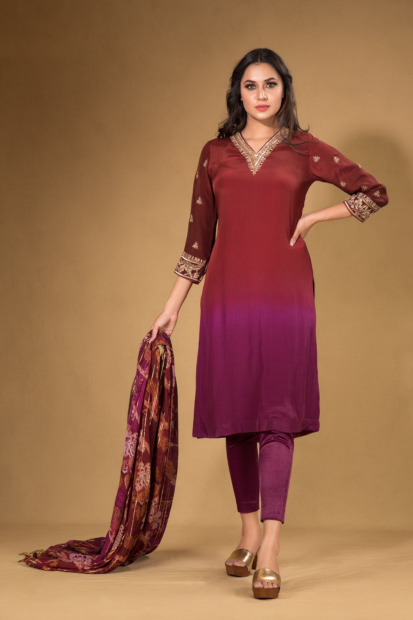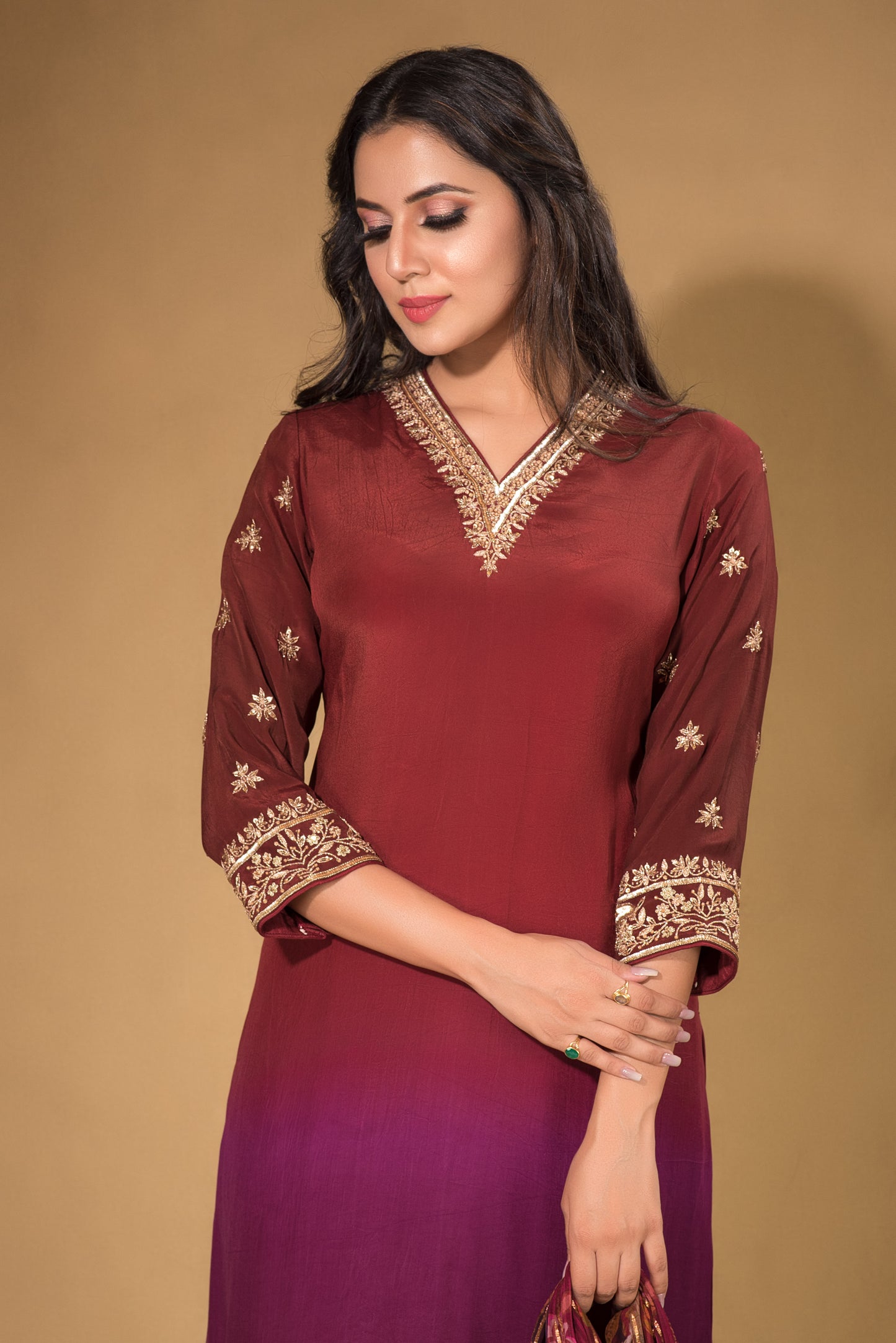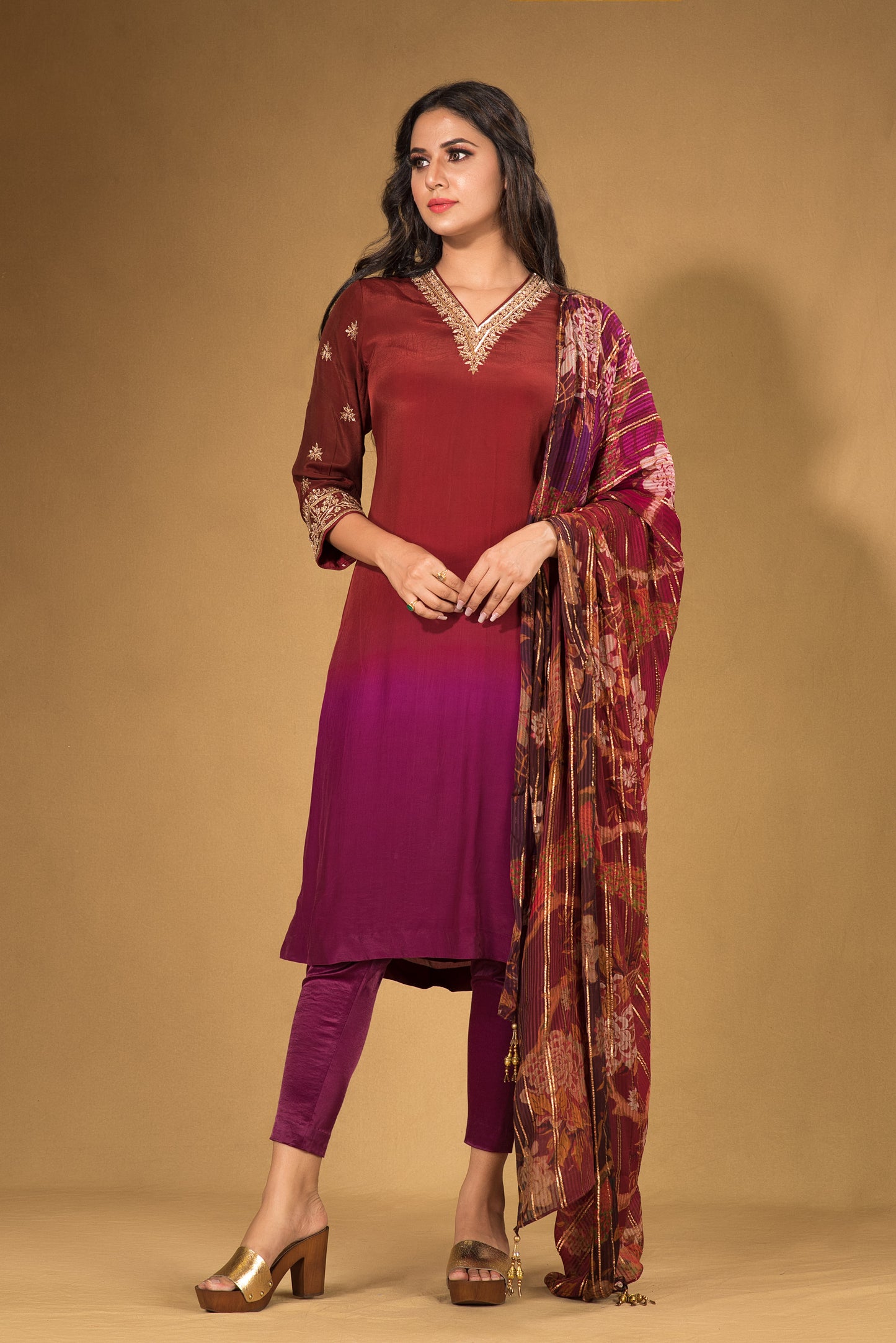Long Ombre Kurta With Ankle Length Lycra Pants Features Intricate Zardosi, Dark Gold And Glass Beads Embroidery On Neckline And Sleeves. It Is Paired With A Lurex Line Printed Dupatta.